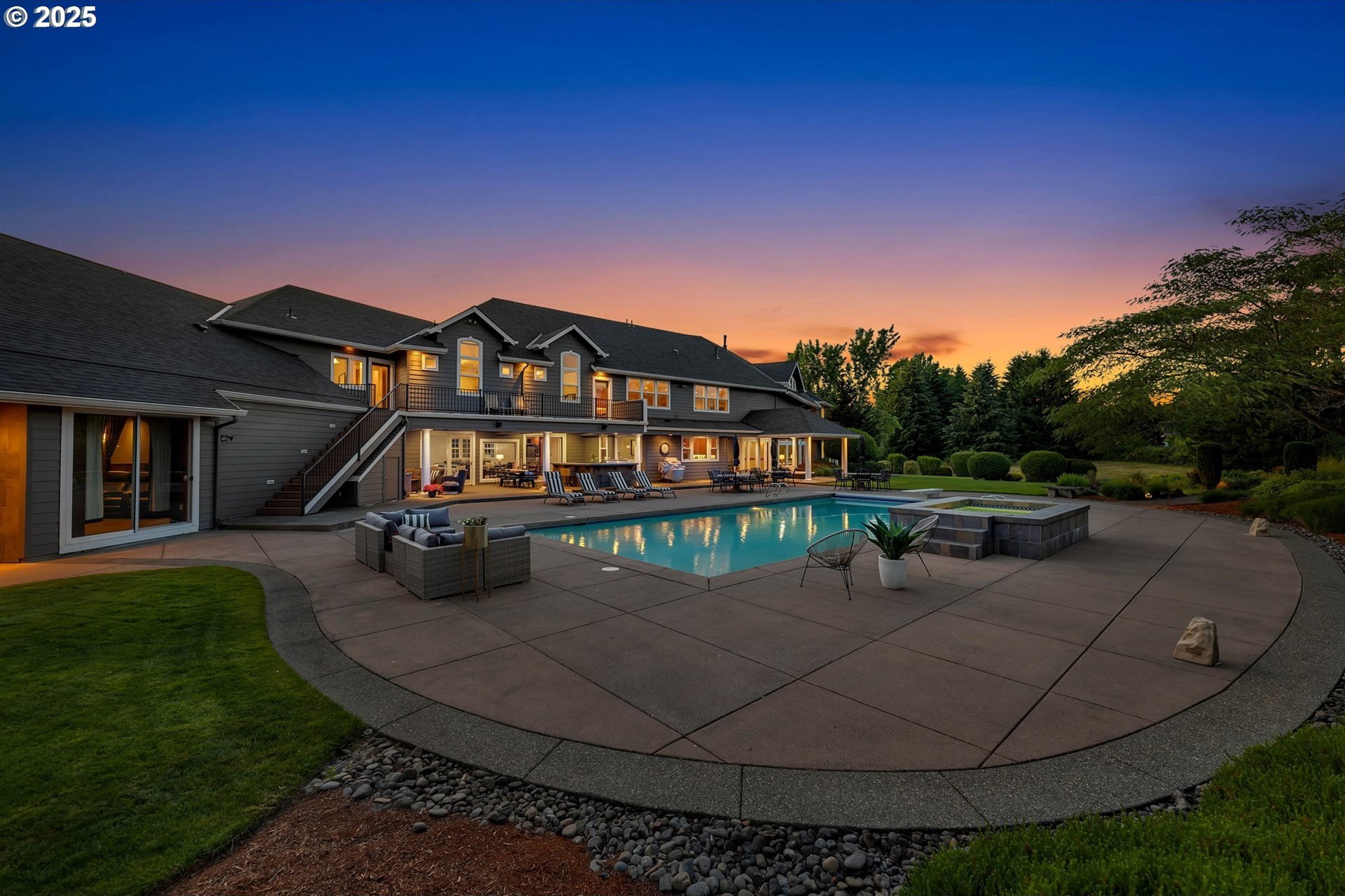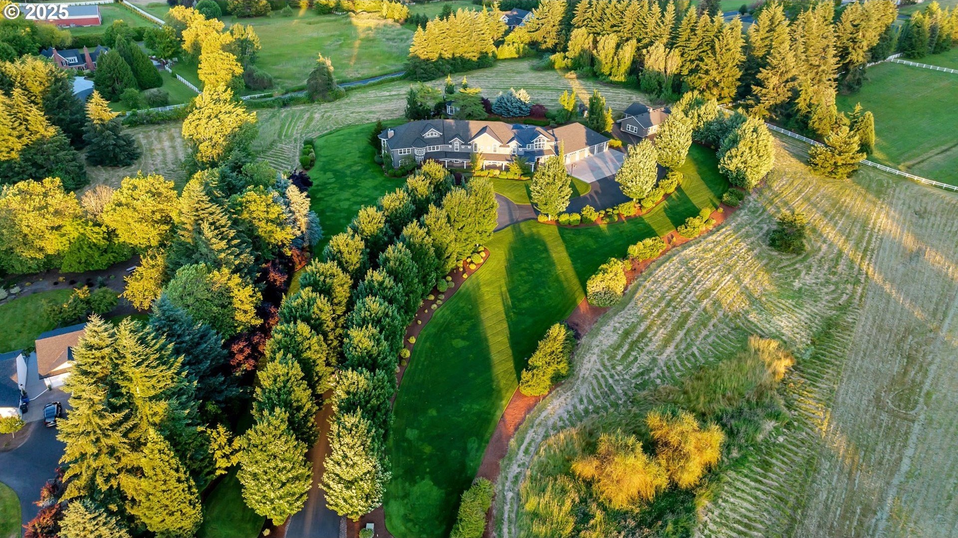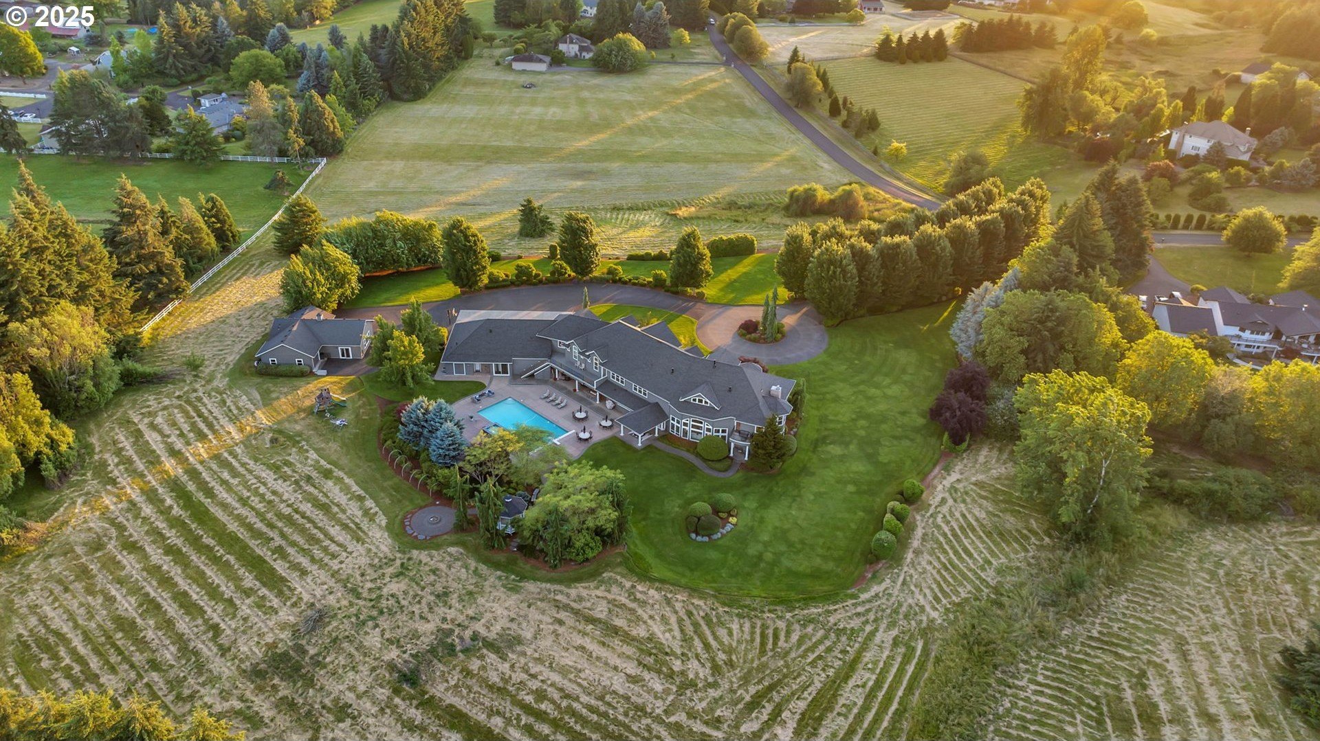 Private tree lined drive leads your guests to this stunning 6.53-acre Cape Cod Estate. A retreat designed for comfort, elegance, and unforgettable moments. Two Primary Suites! Main level suite features gas fireplace w/ cherry cabinetry surround & two spacious walk-in closets w/ built ins. Upper-level 2nd primary w/ vaulted beamed ceilings, gas fireplace, flex space w/ bayed window & spacious walk-in closet. 5 additional bedroom suites upstairs including gym/yoga room w/ balcony, spacious laundry room, storage room & back staircase. Second level guest quarters w/ separate entrance, kitchenette, vaulted bedroom, full bath & private balcony. Two story formal living w/ floor to ceiling windows, gas fireplace w/ marble surround. Main level office w/ built-in desk offering three workstations, built-in bookshelves & closet. Chef's kitchen features cherry cabinetry, 6 burner Viking range, expansive solid granite workspace & island w/ bar seating for 7, two dishwashers, built-in kitchen desk & large walk-in pantry. Gorgeous formal dining features cherry boxed beam ceiling, gas fireplace w/ cherry built-ins & French doors to covered patio. Great room w/ bay window and built-in cherry cabinetry is an entertainers dream. Double sliders open to beautiful outdoor covered entertaining w/ bar, infrared BBQ, outdoor fireplace & 1000 sf pool w/ spa. 4 zone HVAC w/ newer A/C units. New 50-year roof. Newer exterior paint. 5 car oversized garage w/ built-in cabinetry & epoxy flooring. Separate 1196 sf guest house/office features kitchenette, bedroom & full bath plus several flex spaces & one car garage.
