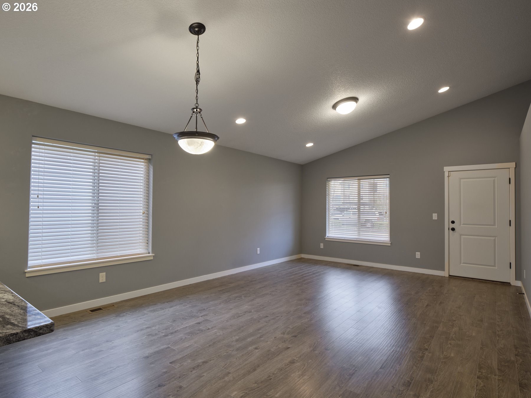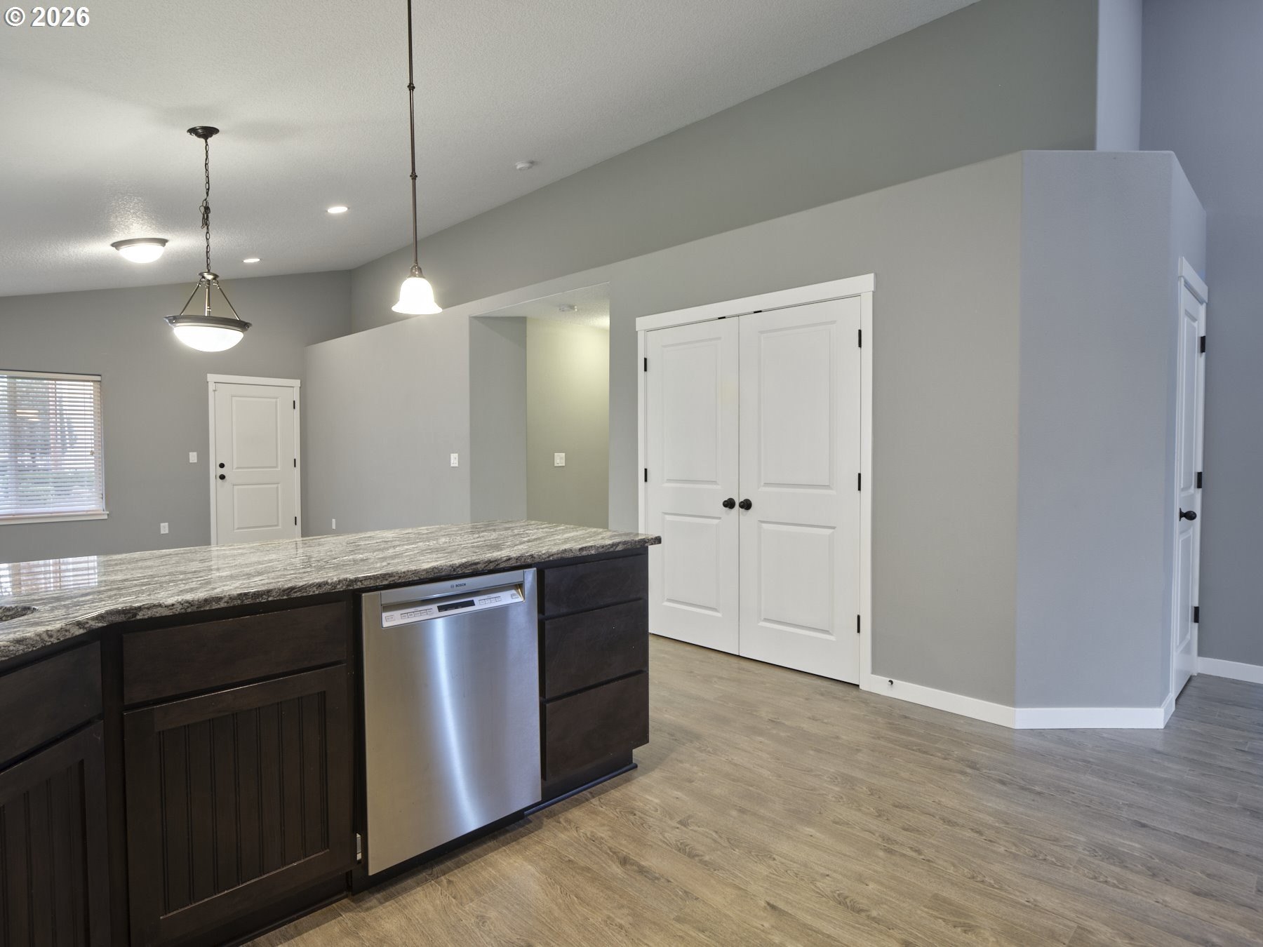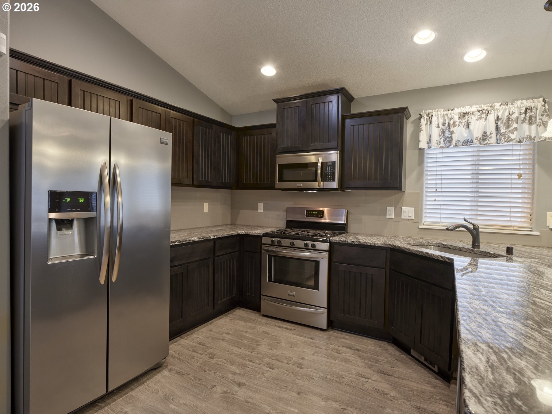 Look no further for your next home! This wonderful 3-bedroom plus den/office, 2 full bath, 2-car garage home offers an open layout with vaulted ceilings. The gourmet kitchen features stainless steel appliances, a gas range, slab granite countertops, and a stylish tile backsplash. You will appreciate the shaker cabinets, knotty alder front door, faux window blinds, and laminate flooring throughout the kitchen, great room, dining area, and hallways. Vaulted ceilings in the main living area create a bright, spacious feel perfect for everyday living and entertaining. Both bathrooms include tile floors for easy maintenance and a high-end look. The primary suite boasts a luxurious bath with a jetted tub, walk-in shower, and double sinks. Additional features include a finished, fully insulated garage with a gas line and utility sink, ideal for hobbies or projects. Walking distance to shopping, park, hospital/clinic, and food. This home is truly a must-see! OPEN HOUSE FRI 1/16 11a-1pm & SAT 1/17 11a-2pm.