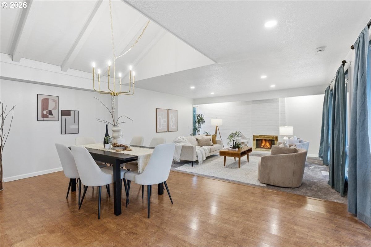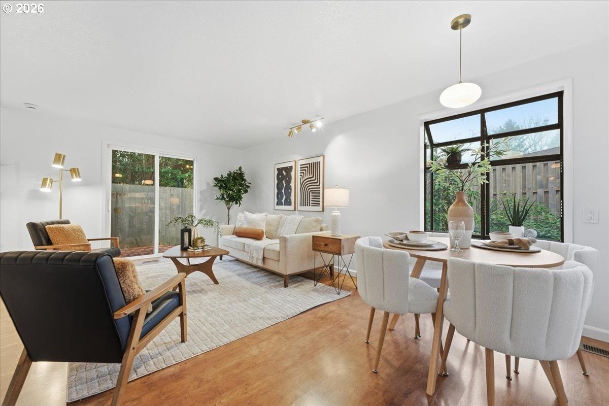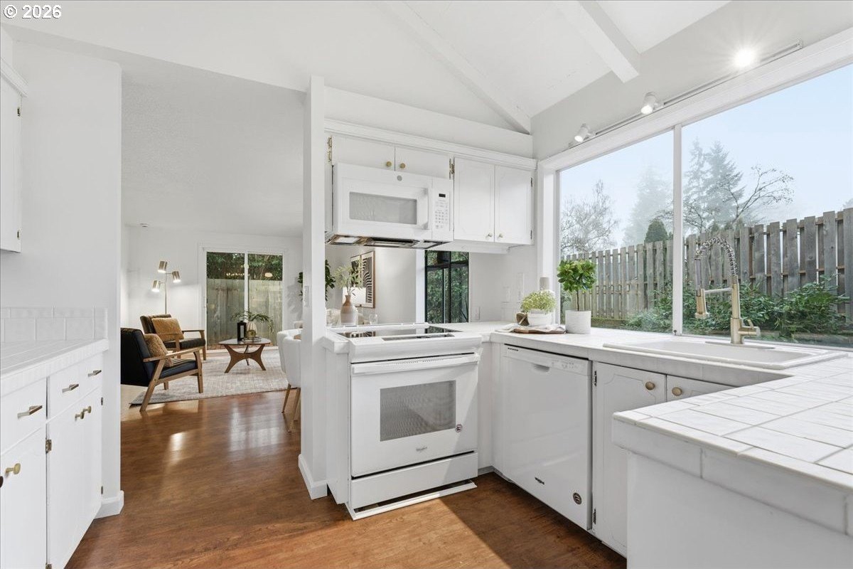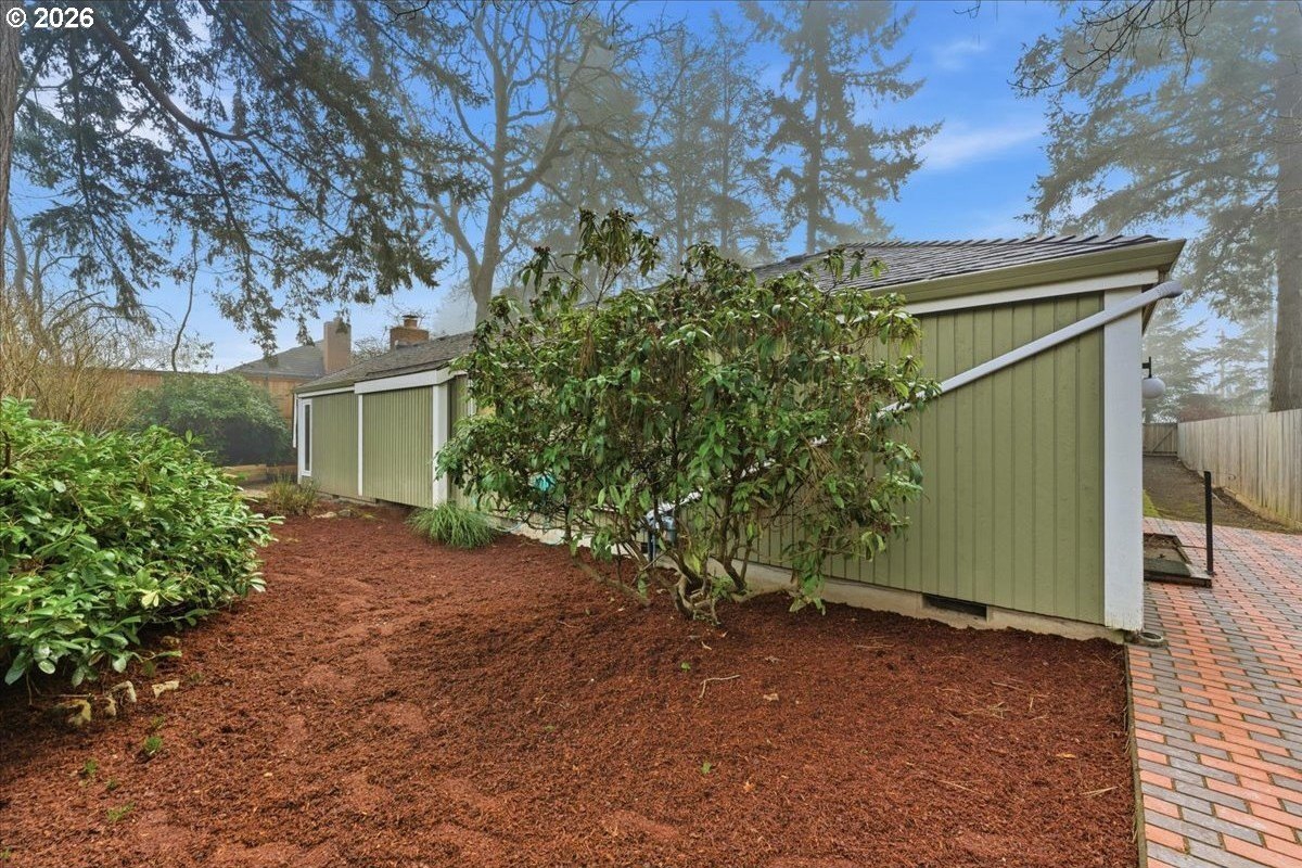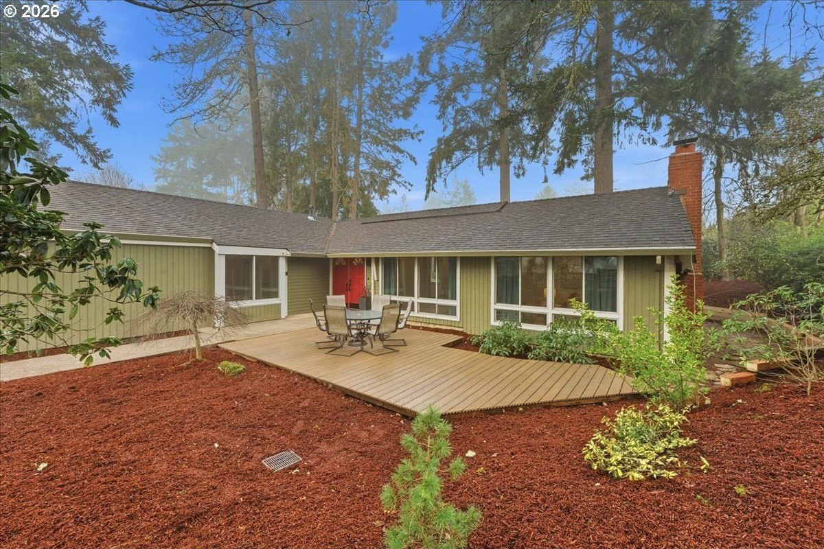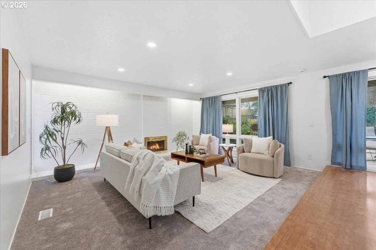 Mid-century charm meets modern updates in the coveted Four Seasons neighborhood. This rare one-level 1969 home welcomes you with a double-door entry, vaulted dining area, and a sunken living room with a white fireplace featuring a wall-to-wall mantle and soft backlighting. Walls of windows fill the home with natural light and the kind of character you simply can't find often. The kitchen offers tiled countertops, gold accents, and a pass-through to the pop-out breakfast nook window perfect for greenery. Just beyond, a cozy family room opens to the brick patio. The spacious primary suite includes mirrored closet doors and a recently updated bathroom with a tiled walk-in shower. Two additional bedrooms and a modernized hall bath round out the thoughtfully designed single-level layout. Major improvements make this home truly move-in ready, including a new $50K roof with 30-year warranty, new gutter guards, a new composite front deck, fresh interior paint, new microwave, and updated bathroom vanities, faucets, and lighting. Low-maintenance bark-dust landscaping and mature trees let the architecture shine. Enjoy a peaceful HOA setting with trees, creeks, a clubhouse, and pool, all just minutes from Cedar Hills Crossing with shopping and eateries, downtown Beaverton, Nike, and Hwy 217.
