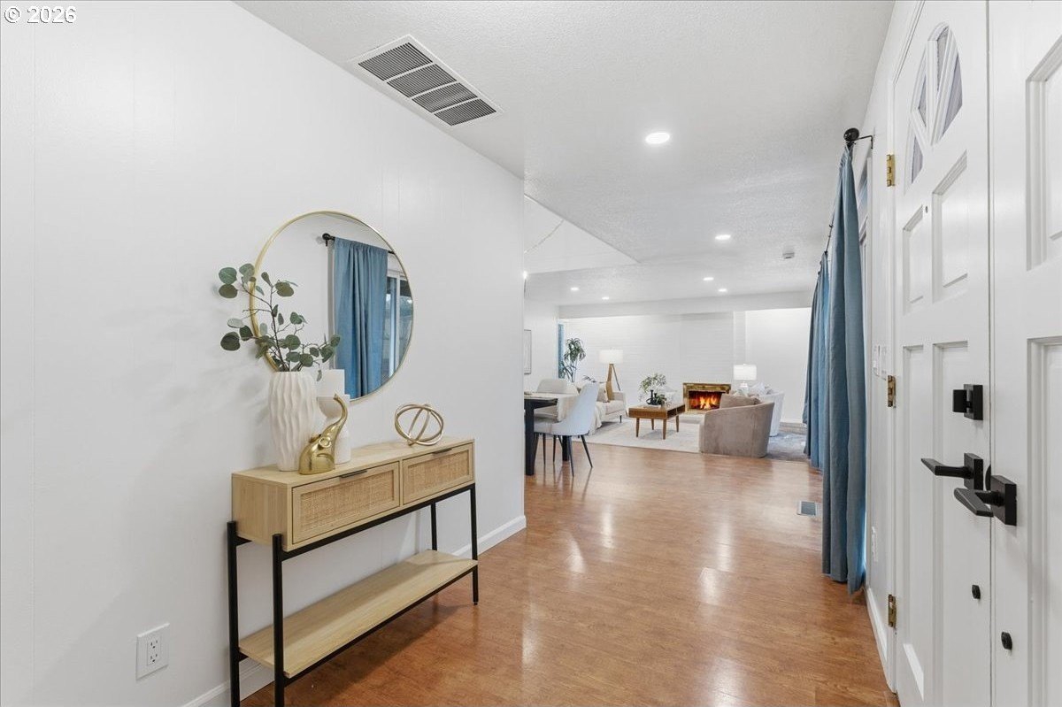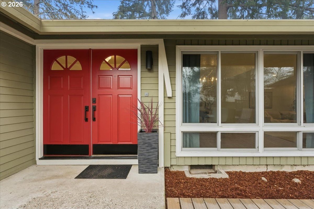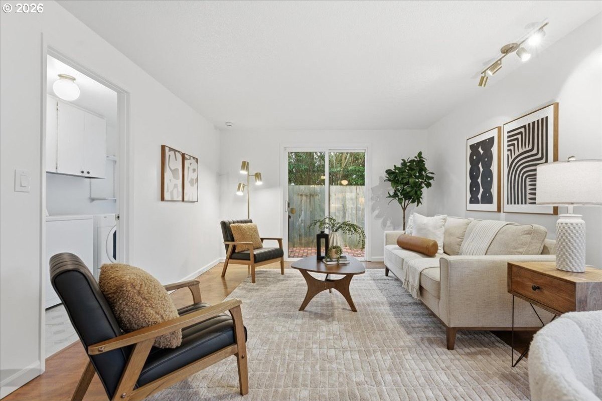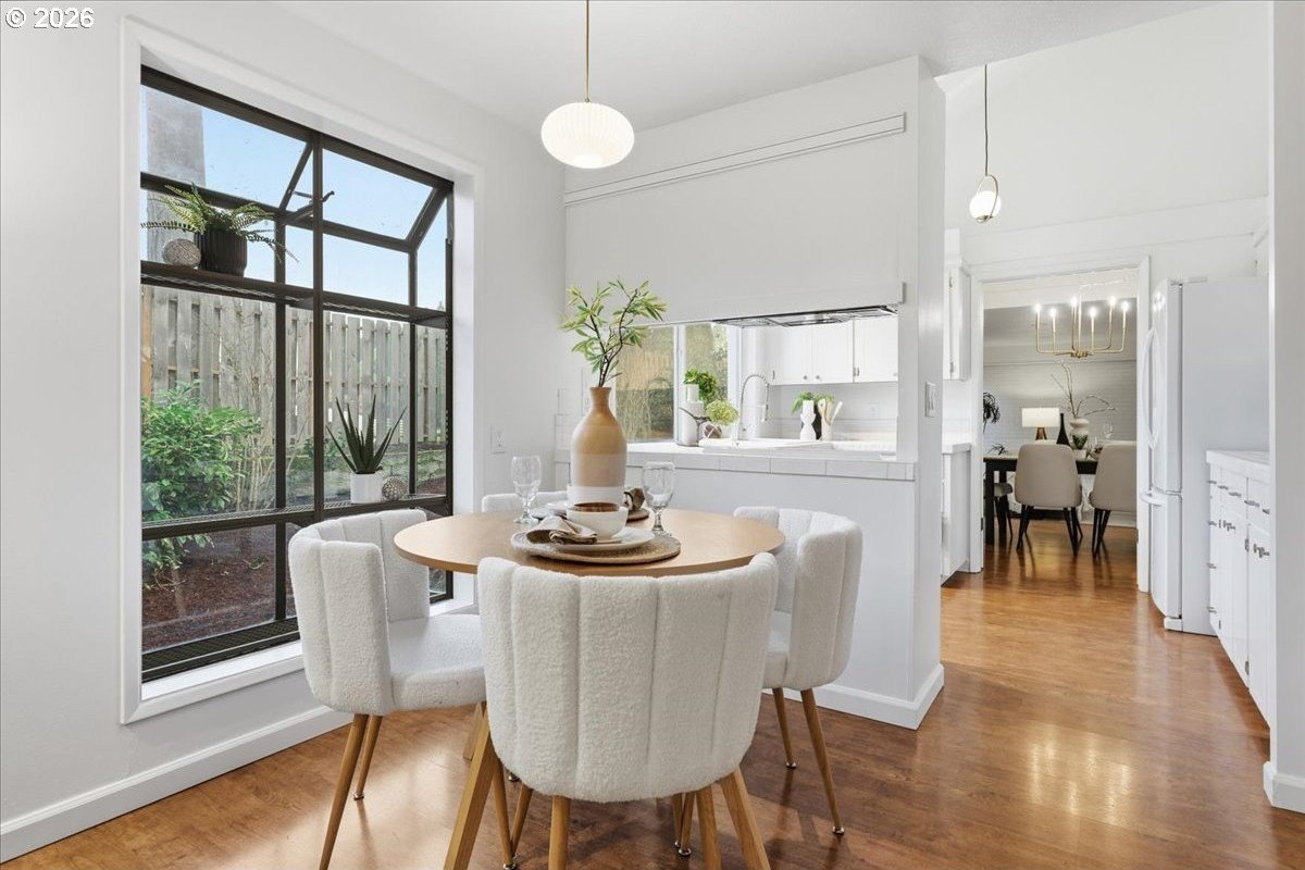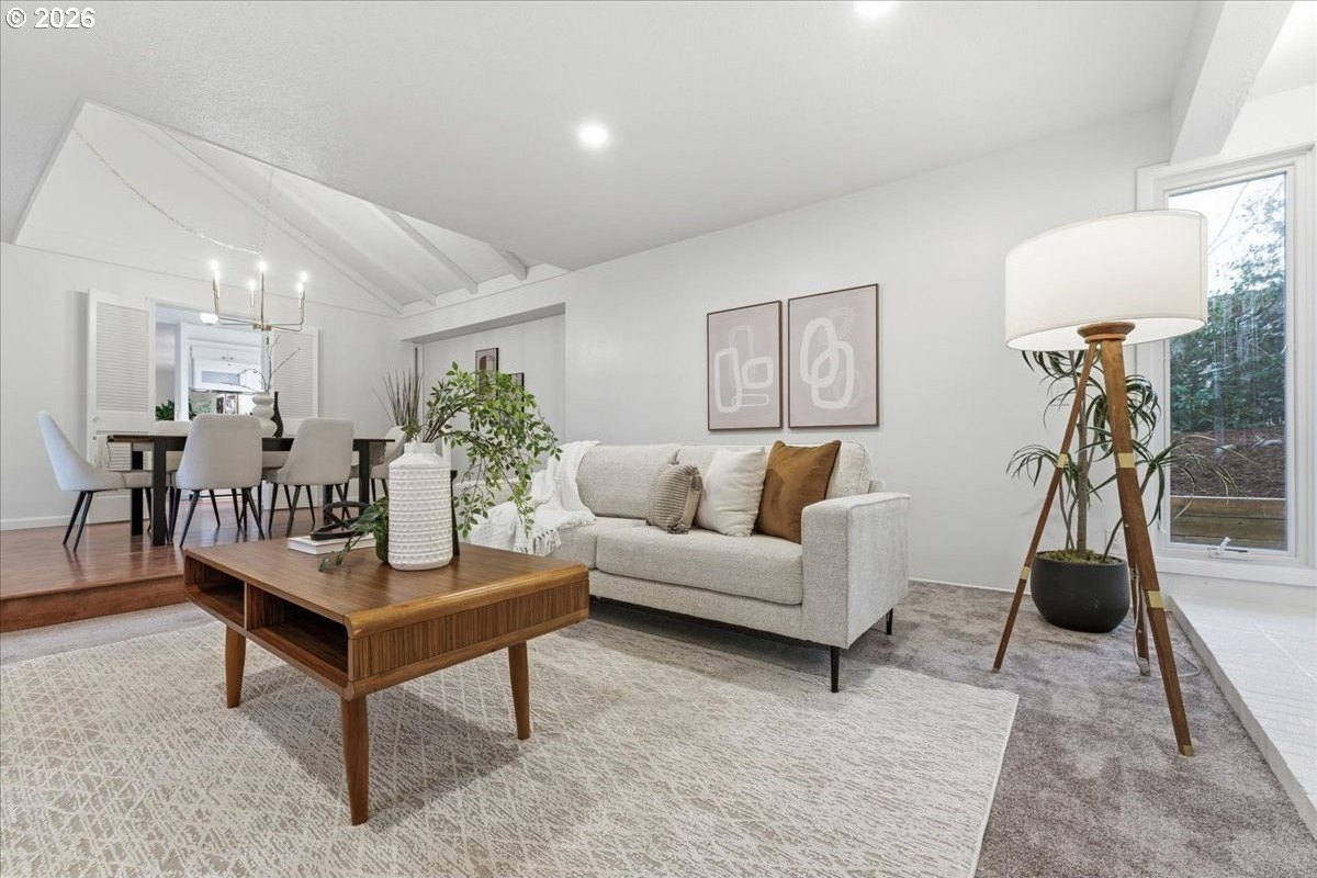 Mid-century charm meets modern updates in the coveted Four Seasons neighborhood. This rare one-level 1969 home welcomes you with a double-door entry, vaulted dining area, and a sunken living room with a white fireplace featuring a wall-to-wall mantle and soft backlighting. Walls of windows fill the home with natural light and the kind of character you simply can't find often. The kitchen offers tiled countertops, gold accents, and a pass-through to the pop-out breakfast nook window perfect for greenery. Just beyond, a cozy family room opens to the brick patio. The spacious primary suite includes mirrored closet doors and a recently updated bathroom with a tiled walk-in shower. Two additional bedrooms and a modernized hall bath round out the thoughtfully designed single-level layout. Major improvements make this home truly move-in ready, including a new $50K roof with 30-year warranty, new gutter guards, a new composite front deck, fresh interior paint, new microwave, and updated bathroom vanities, faucets, and lighting. Low-maintenance bark-dust landscaping and mature trees let the architecture shine. Enjoy a peaceful HOA setting with trees, creeks, a clubhouse, and pool, all just minutes from Cedar Hills Crossing with shopping and eateries, downtown Beaverton, Nike, and Hwy 217.