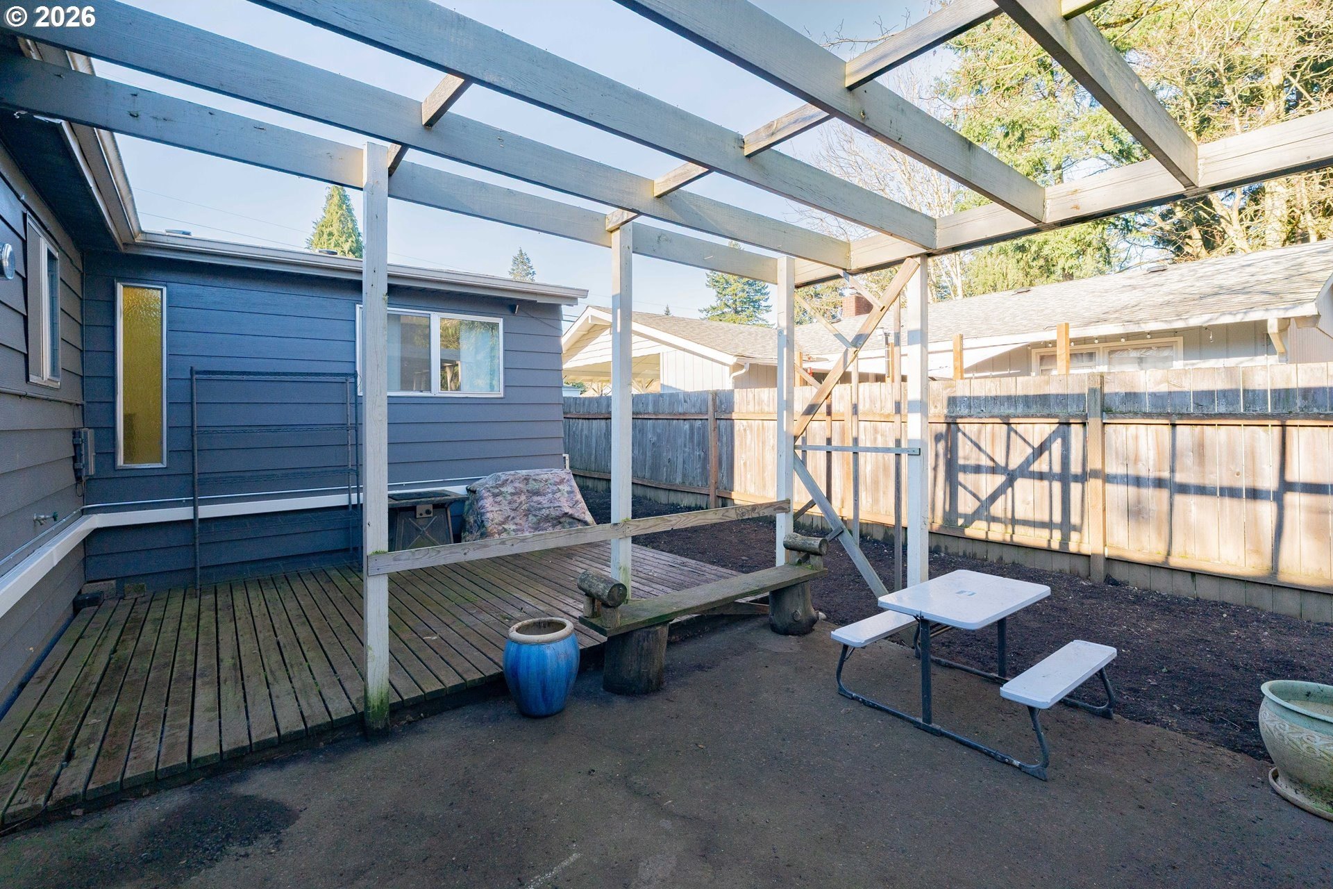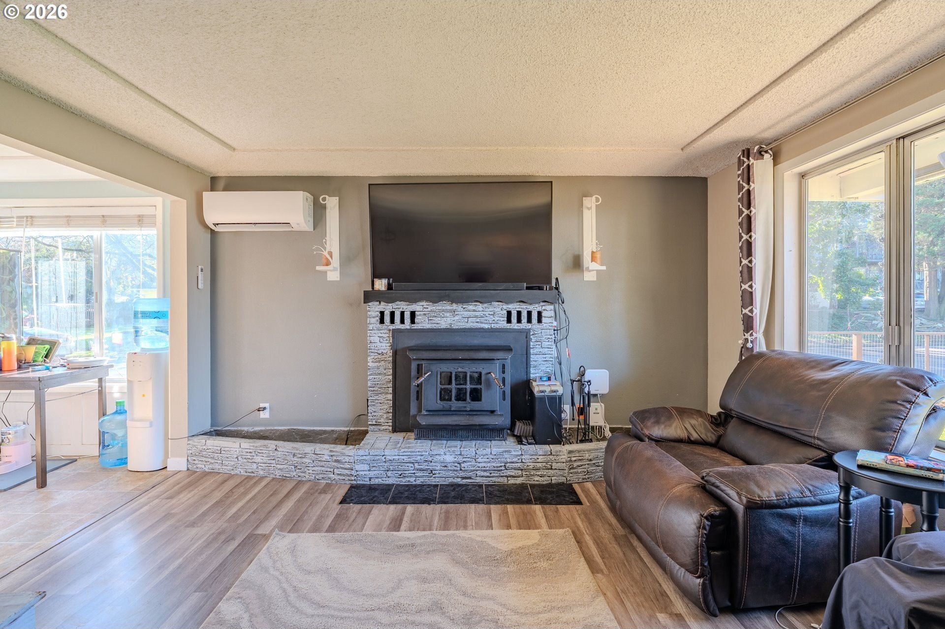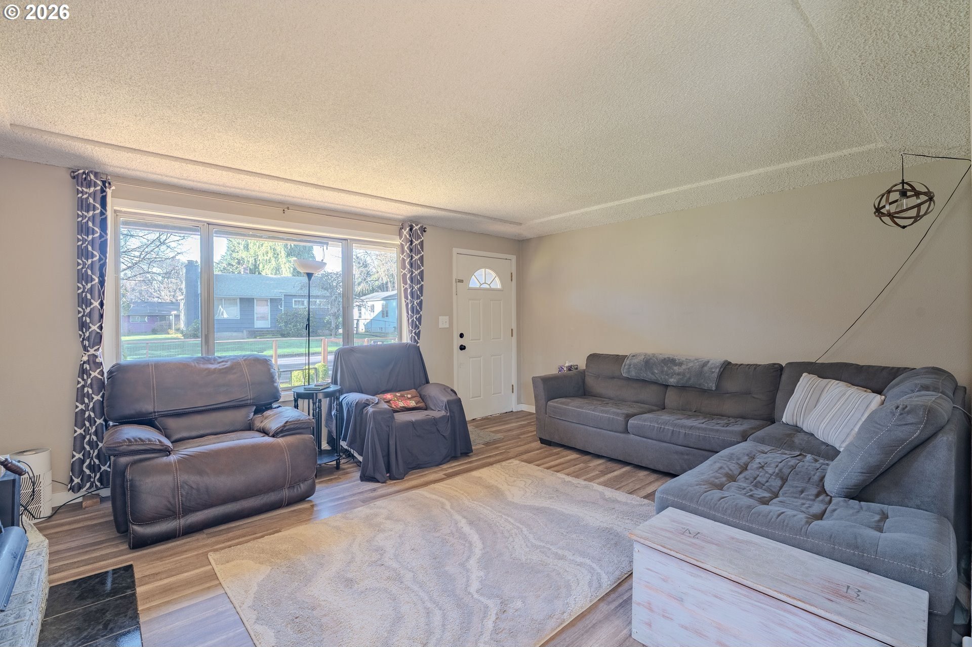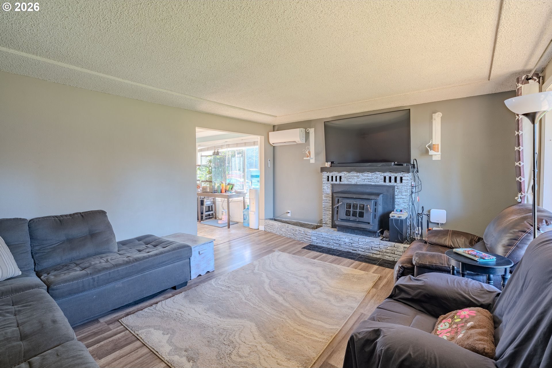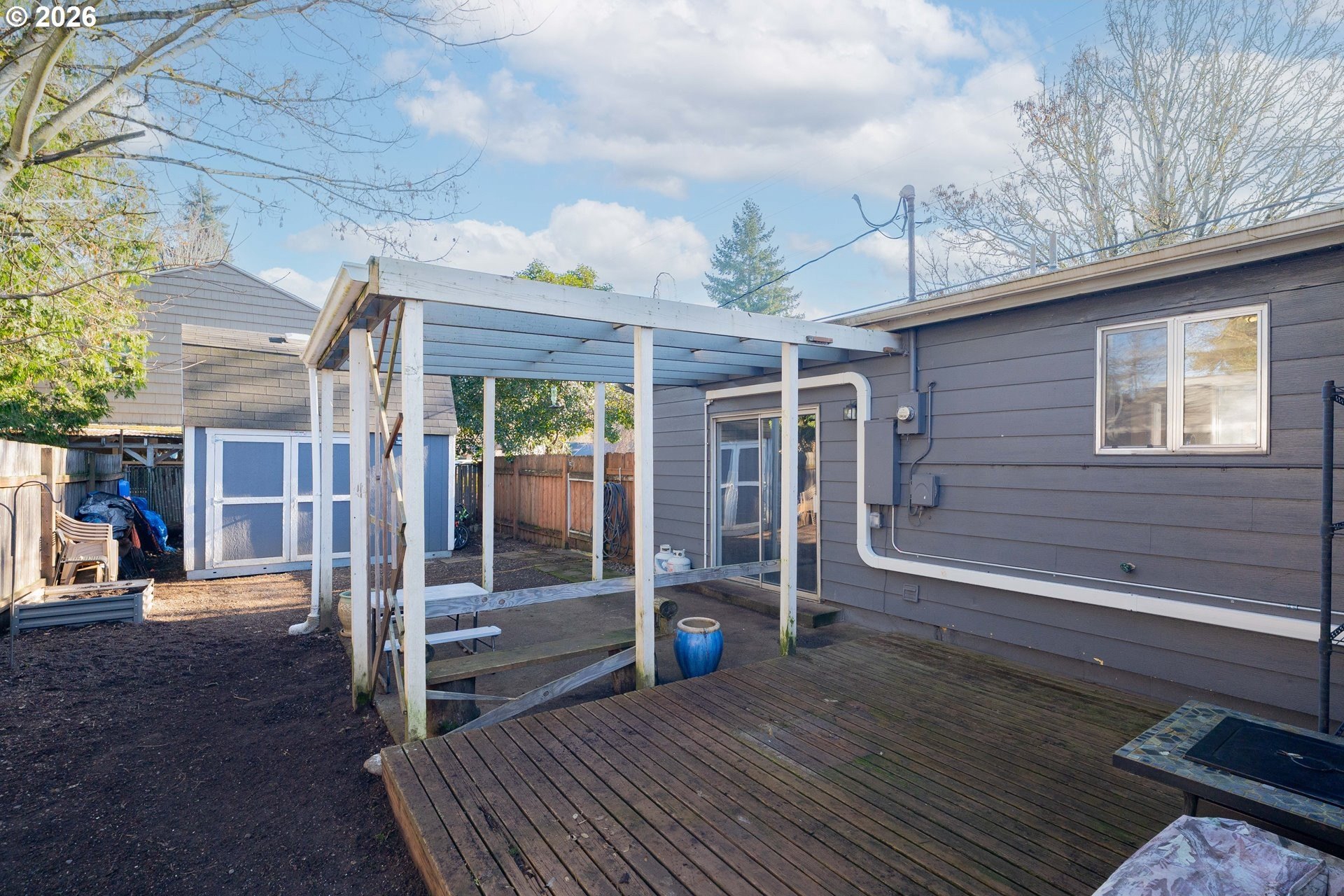Welcome home! This 1,210-square-foot mid-century-inspired bungalow blends vintage character with modern comfort in a way that feels effortlessly cool. The spacious living room features a classic coved ceiling, sleek laminate flooring, and a statement brick fireplace with a wood stove insert - perfect for cozy nights in. The dining room adds subtle architectural interest with wainscoting and a coved ceiling, while the kitchen delivers everyday style with solid surface counters, a full tile backsplash, and stainless appliances. The vaulted owner's suite feels light and airy with an exposed beam ceiling, a convenient laundry closet, and direct access to the patio. Brand-new ductless heating and cooling add year-round comfort and energy efficiency and a newer roof and complete house repipe will add additional peace of mind! Set on a generous corner lot, the fully fenced front and back yards offer space to garden, relax, or host friends, with a deck, covered patio, and large shed for added storage. Centrally located near Clark College, multiple parks, the VA Hospital, downtown, shopping, dining, and more, this home offers a smart blend of character, comfort, and city convenience. Open House Saturday, January 17 from 12-2pm - come take a look!