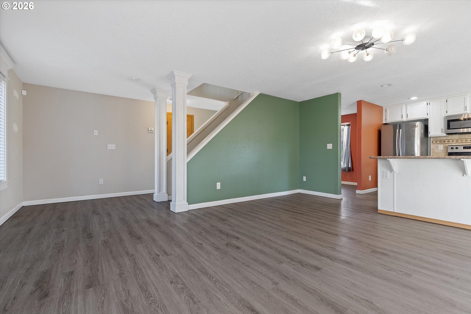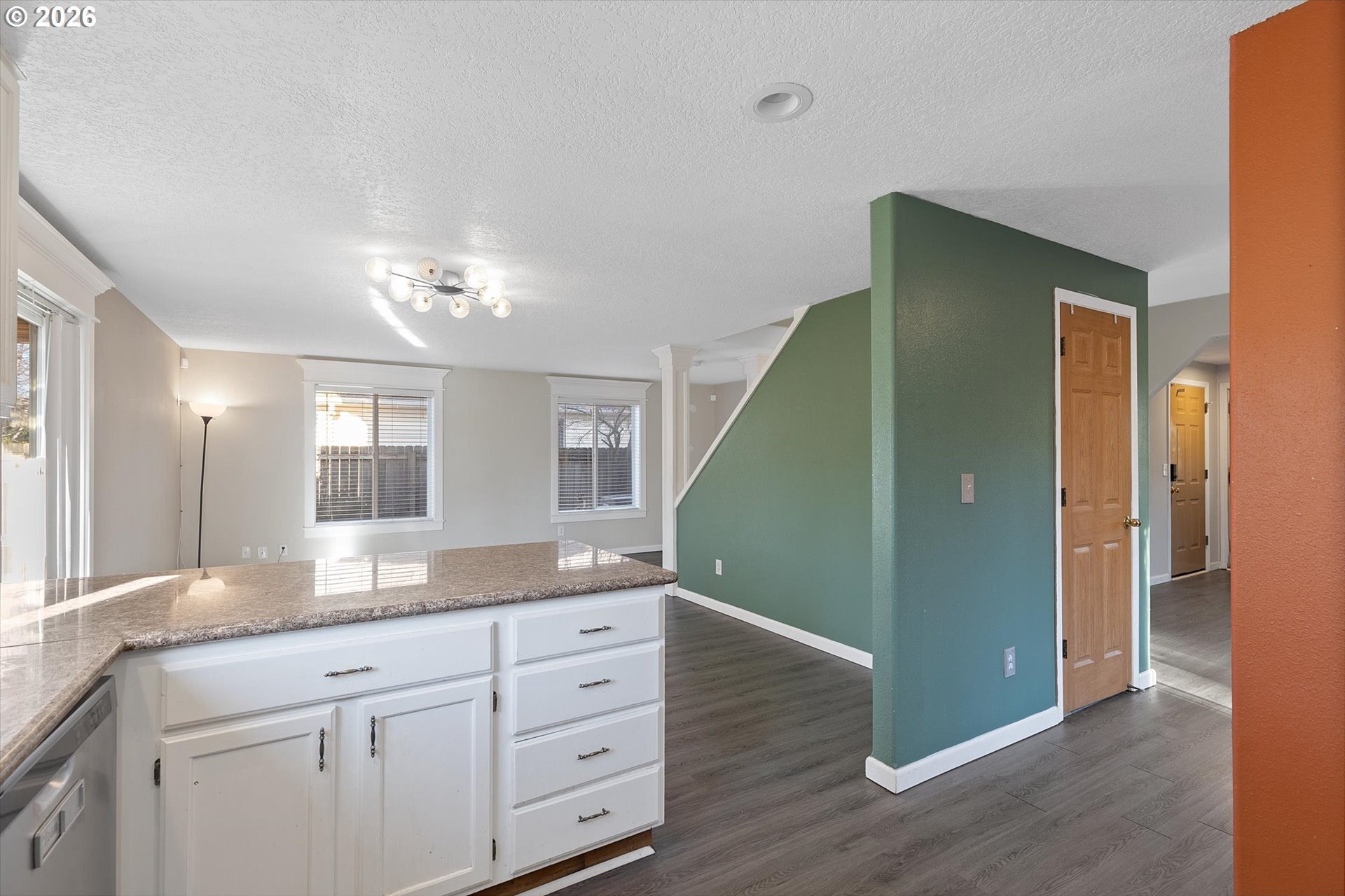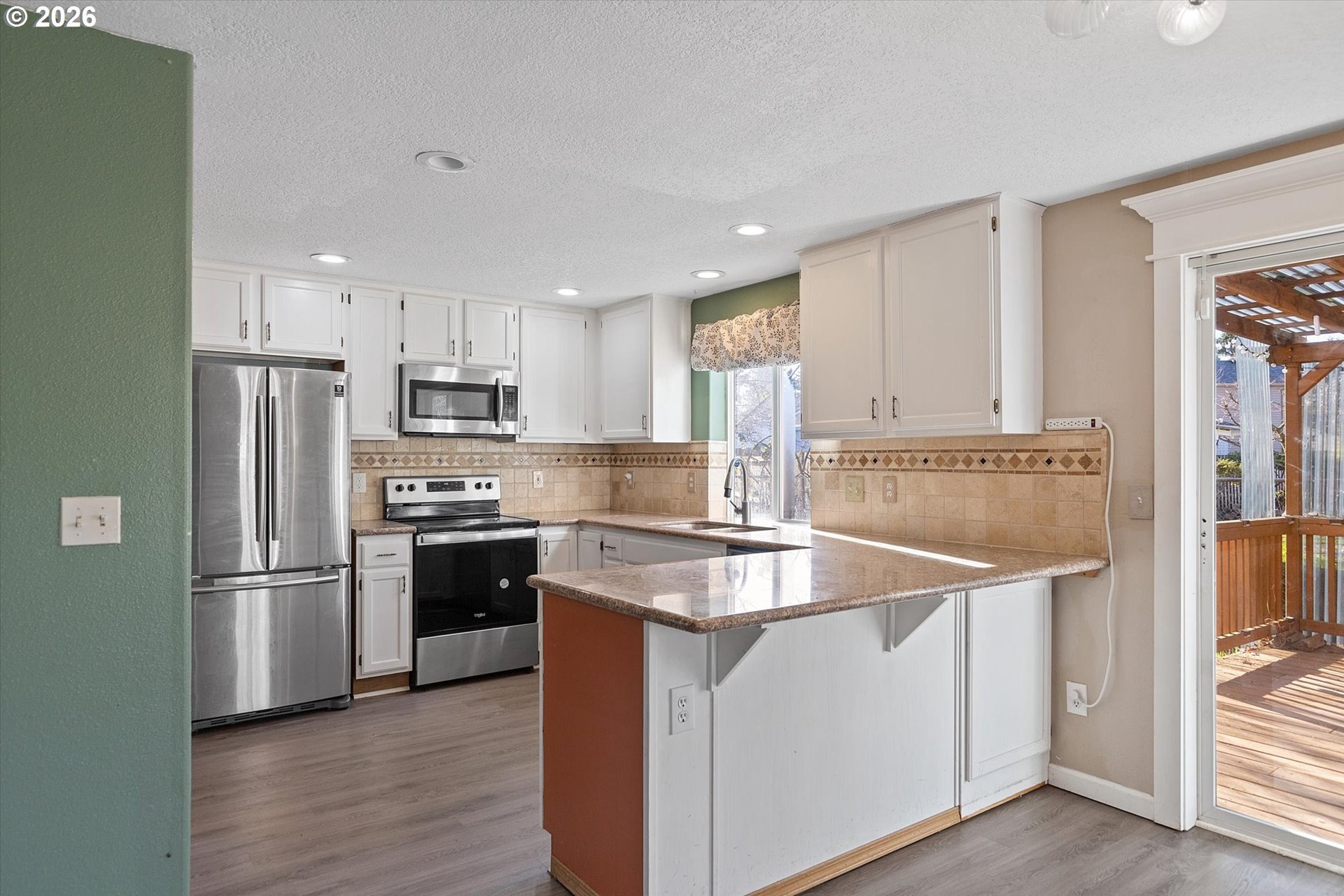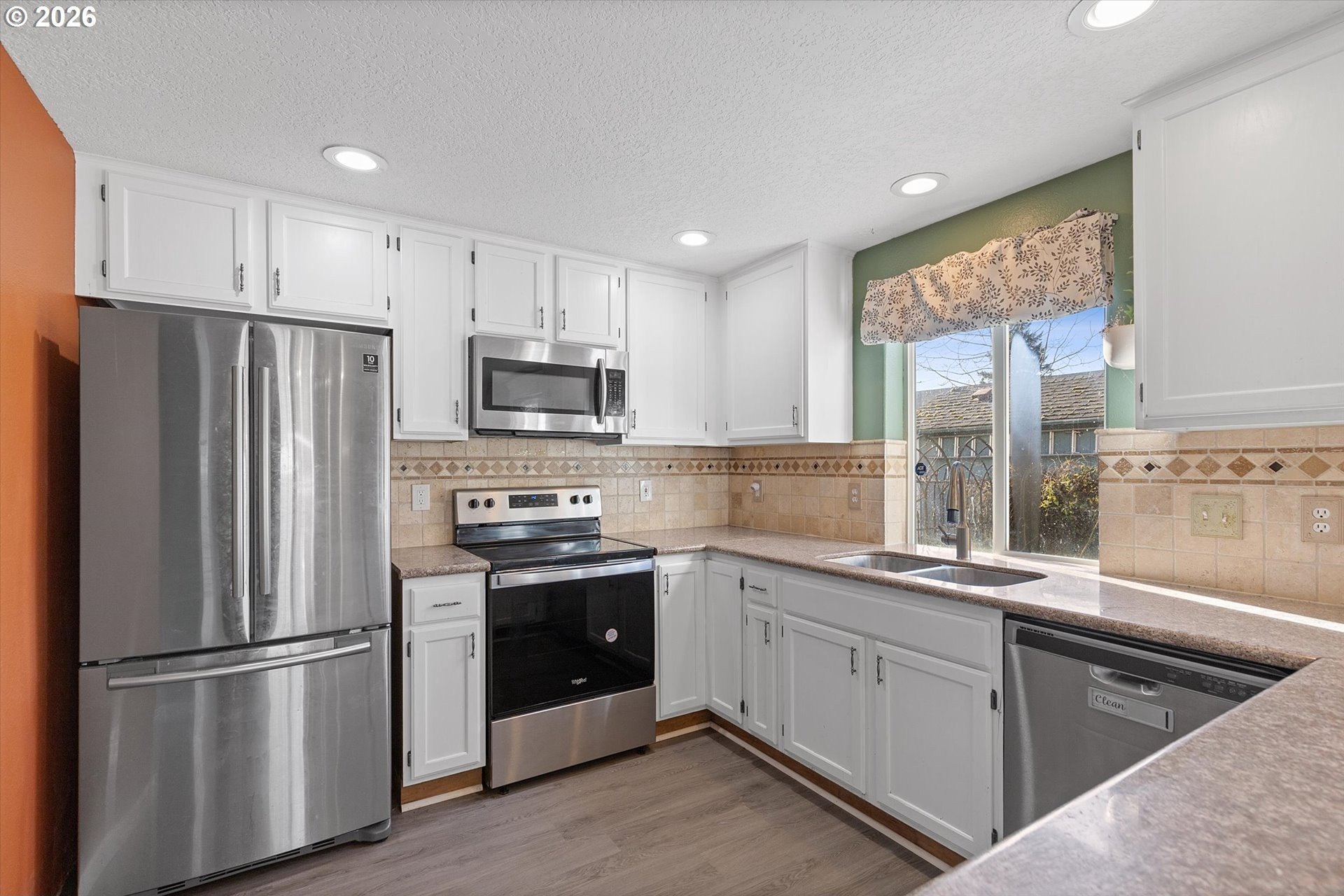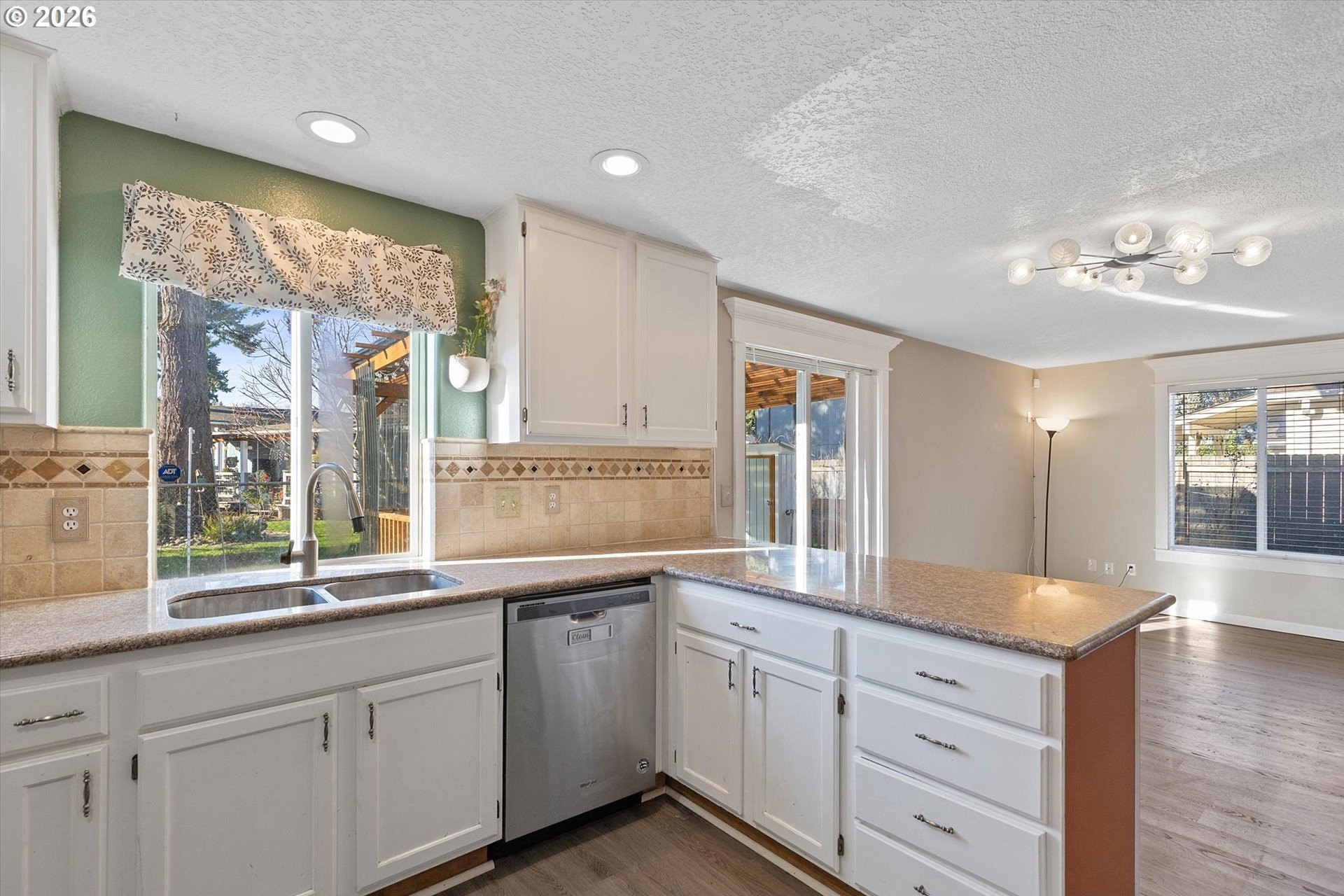 Charming 4 bedroom 2 and a half bath home offering well designed living space. This inviting residence features a thoughtful layout with formal living and dining areas, highlighted by laminate flooring that adds warmth, durability, and a cohesive flow throughout the main level. The updated kitchen is both functional and stylish, showcasing granite countertops, stainless steel appliances, ample cabinetry, and generous counter space, making it ideal for everyday living as well as entertaining. The kitchen opens seamlessly to the comfortable and welcoming family room, creating a natural gathering space for relaxation or hosting guests. Large windows provide excellent natural light, enhancing the home's open and airy feel. Sliding glass doors extend the living space outdoors to a fully fenced backyard, offering privacy and versatility. The covered patio is perfect for year-round outdoor dining, barbecues, or simply enjoying the Pacific Northwest seasons, while the yard provides room for gardening, play, or pets. Upstairs, the primary bedroom suite serves as a private retreat with vaulted ceilings, a walk-in closet, and a well-appointed ensuite bathroom. Three additional bedrooms offer flexibility for guest rooms, home offices, or hobby spaces, complemented by a convenient full bath and a main-level powder room.