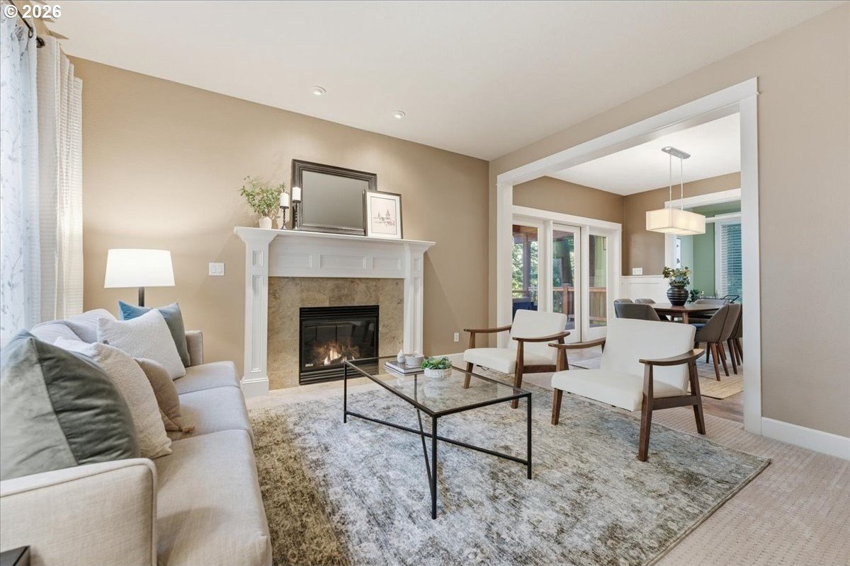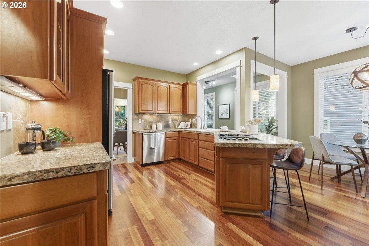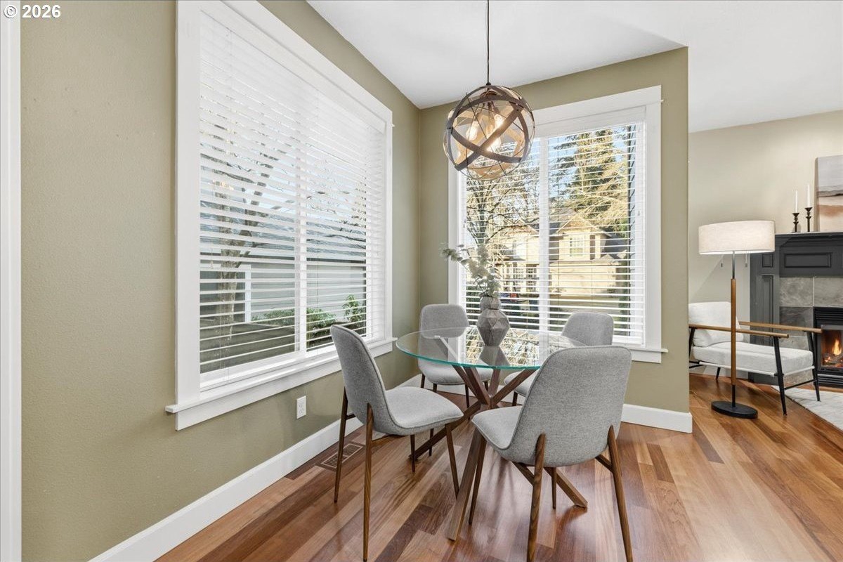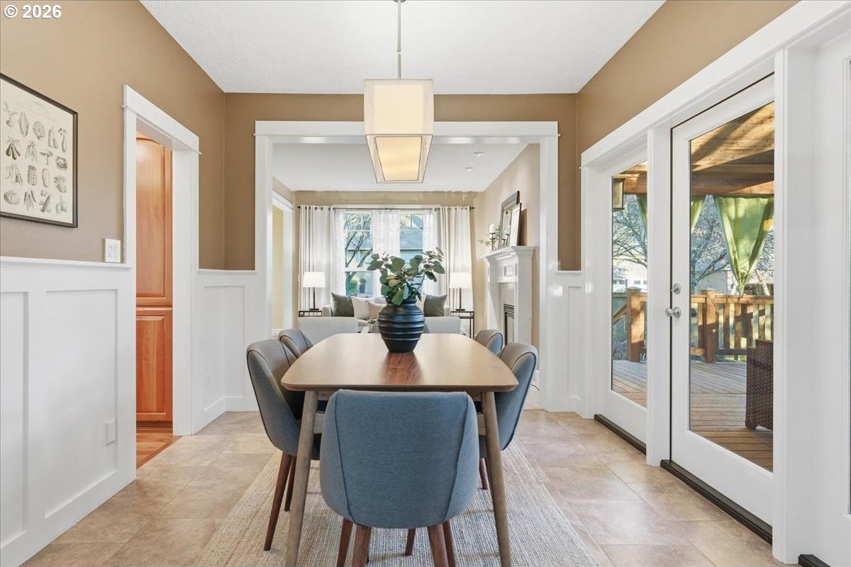 Outstanding Craftsman home in great pocket neighborhood on dead-end street! Beautiful kitchen cabinets and hardwood floors. 2 cozy fireplaces and great office space on main level. Standout 400+ square foot custom covered deck, rarely seen at this price point, overlooking large private yard perfect for year-round outdoor living and entertaining. 4th bedroom with closet is upstairs with vaulted ceiling and skylights. Walk-in closet in primary bedroom. Dual sinks in primary bathroom as well as the second upstairs bathroom. Large corner lot, beautifully maintained landscape with a terrific water feature in the front and a free standing second covered deck area in back yard. Great access to Fanno Creek Trail. Walk or ride to revitalized downtown Tigard, parks, open spaces. Access to neighborhood raised bed community garden just a few steps down the sidewalk in front. Please come see this great home!