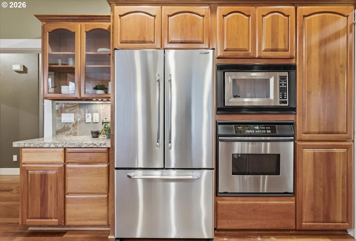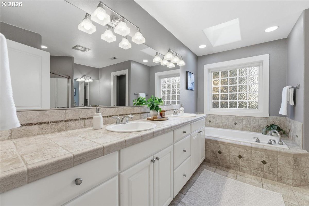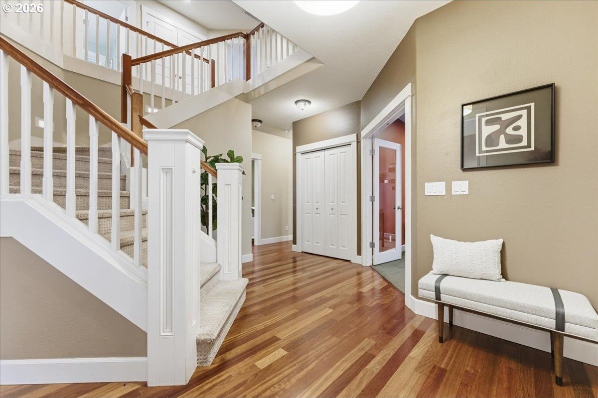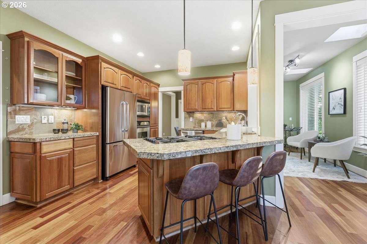 Outstanding Craftsman home in great pocket neighborhood on dead-end street! Beautiful kitchen cabinets and hardwood floors. 2 cozy fireplaces and great office space on main level. Standout 400+ square foot custom covered deck, rarely seen at this price point, overlooking large private yard perfect for year-round outdoor living and entertaining. 4th bedroom with closet is upstairs with vaulted ceiling and skylights. Walk-in closet in primary bedroom. Dual sinks in primary bathroom as well as the second upstairs bathroom. Large corner lot, beautifully maintained landscape with a terrific water feature in the front and a free standing second covered deck area in back yard. Great access to Fanno Creek Trail. Walk or ride to revitalized downtown Tigard, parks, open spaces. Access to neighborhood raised bed community garden just a few steps down the sidewalk in front. Please come see this great home!