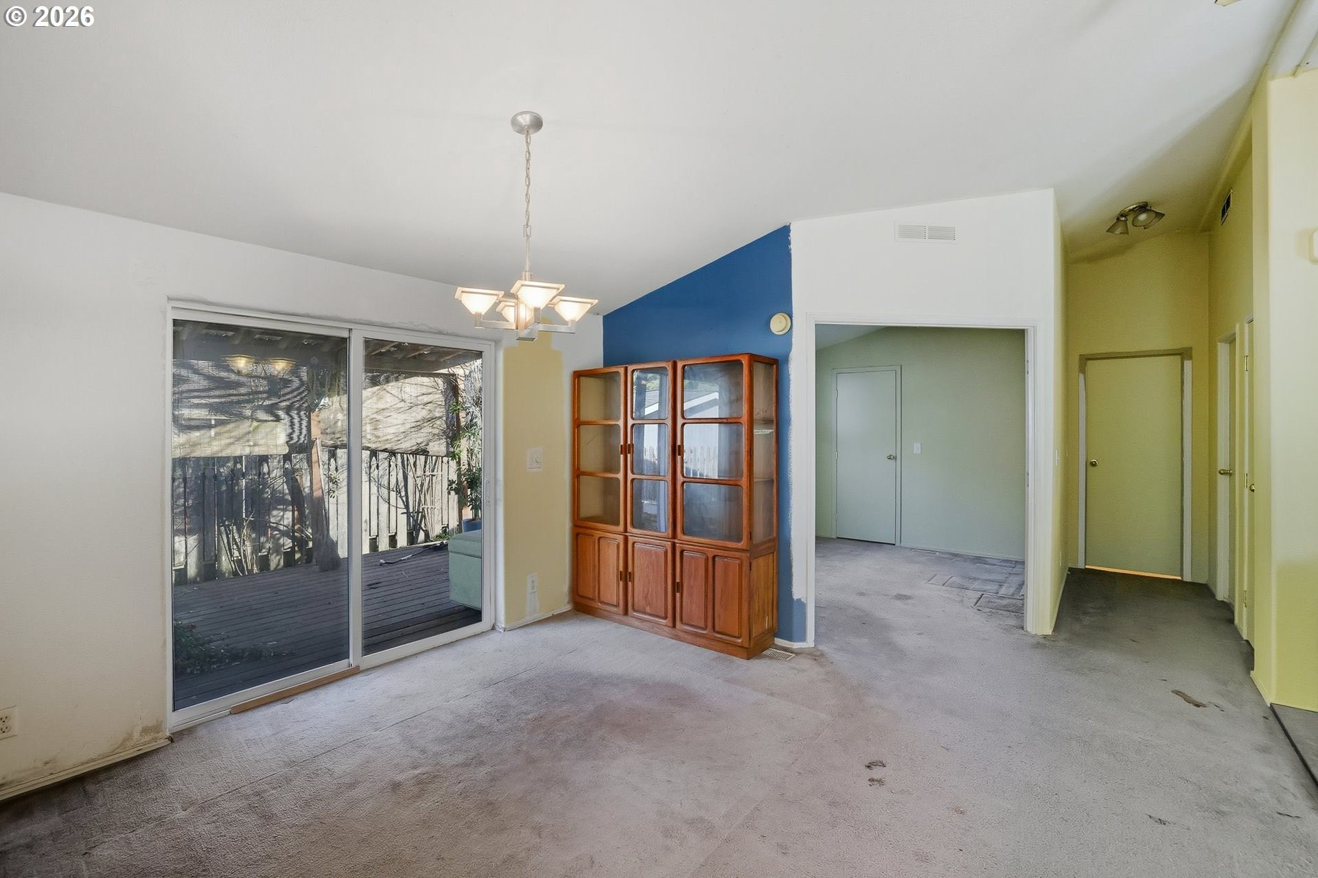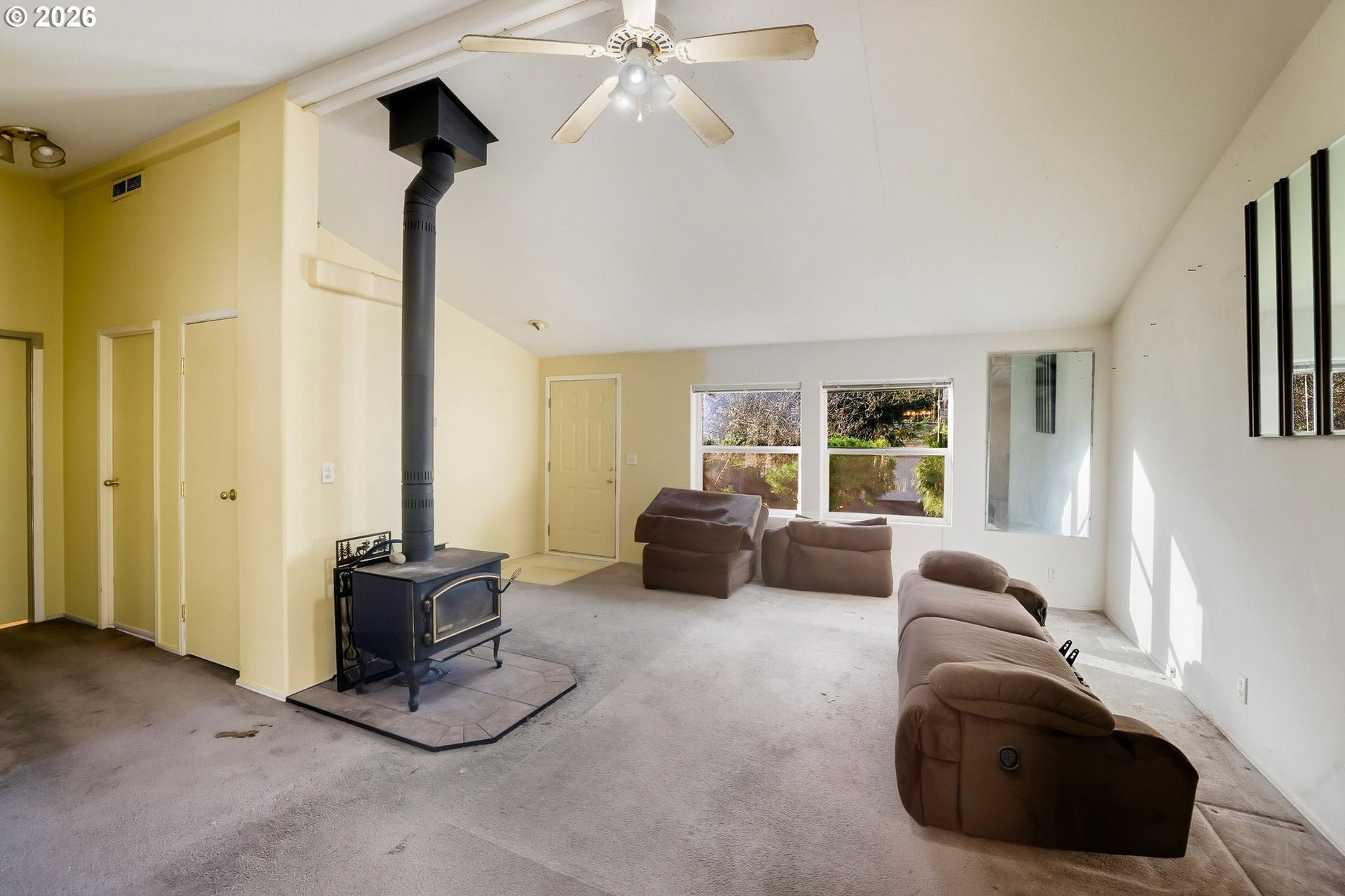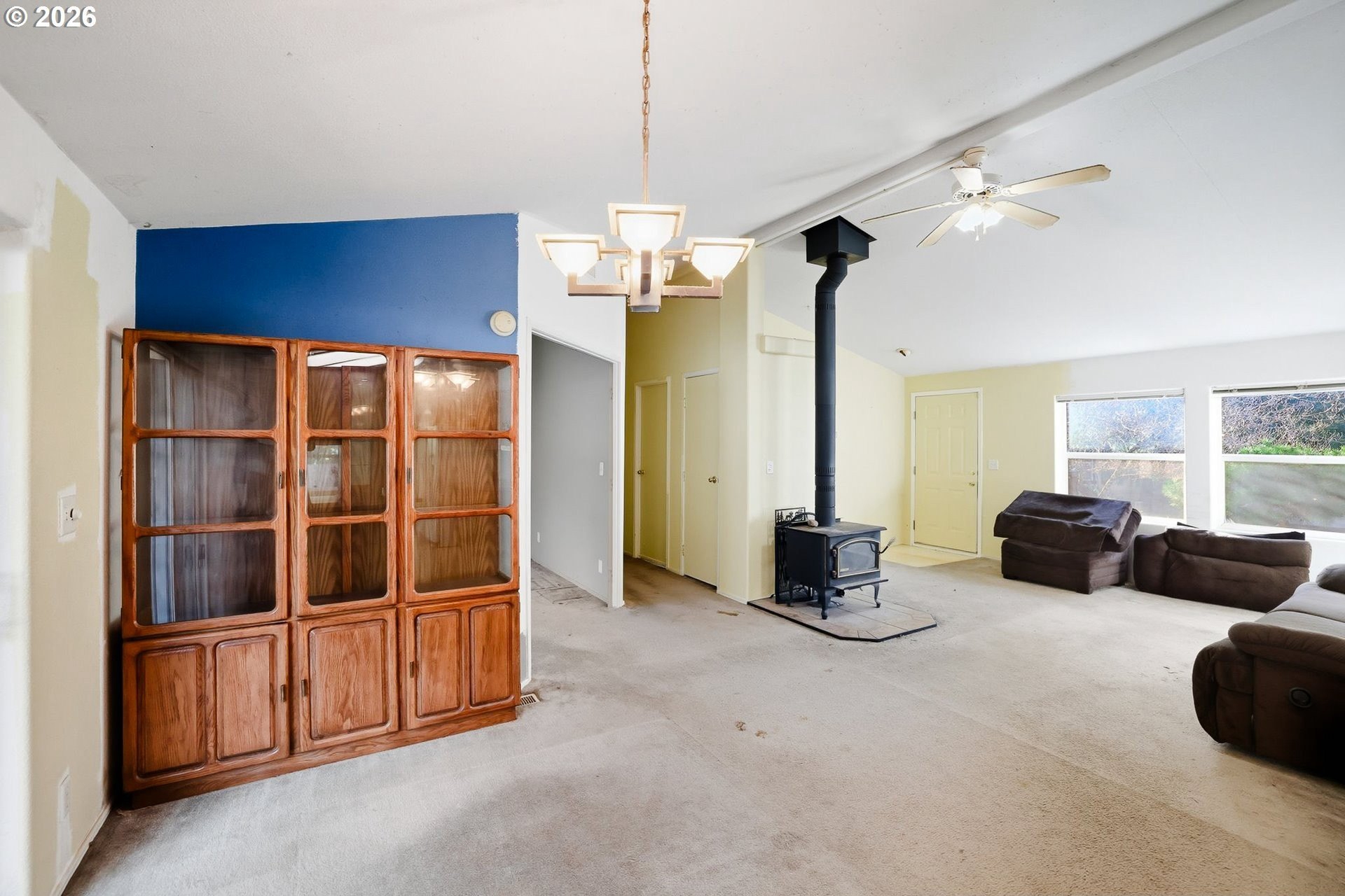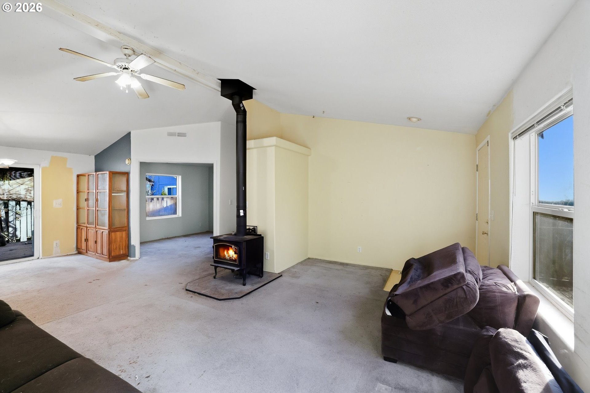 Charming seller owned, one-level home featuring 3 bedrooms and soaring vaulted ceilings throughout, creating a bright and open feel. The primary bedroom offers a private ensuite bath for added comfort. Wall-to-wall carpet adds warmth throughout the home, while the kitchen and utility room feature durable tile flooring. The spacious kitchen flows seamlessly into the open-concept living and dining areas, perfect for everyday living and entertaining. The dining room opens to a back deck through sliding glass doors, extending your living space outdoors. Enjoy a cozy living room complete with a fireplace and ceiling fan, plus a fully fenced backyard ideal for relaxing, pets, or gardening. A wonderful blend of comfort, functionality, and easy one-level living. +55 Community.