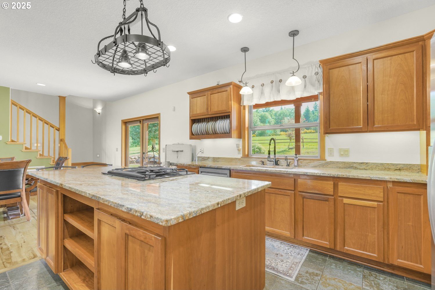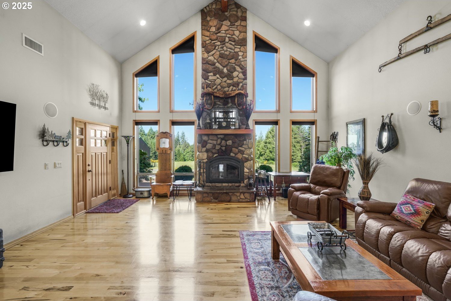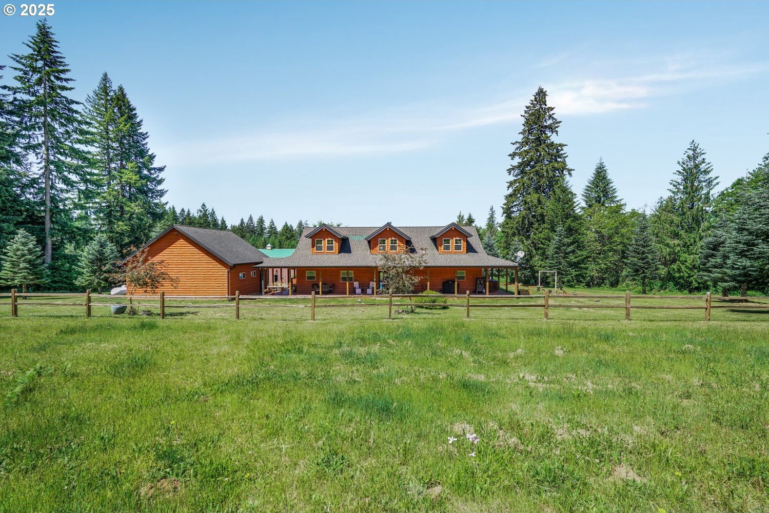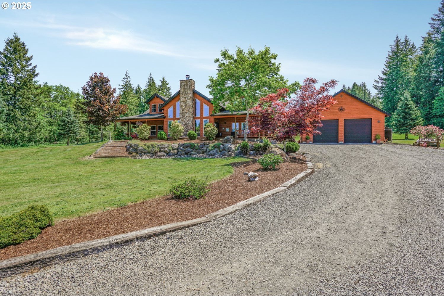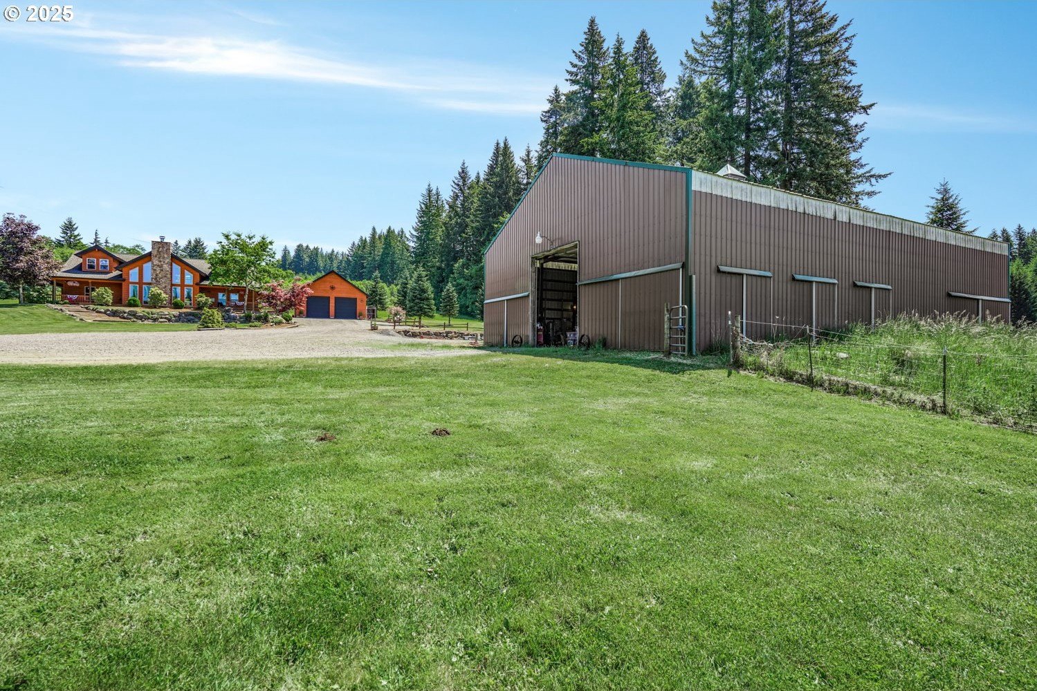 Unmatched privacy and natural beauty in this stunning custom-style estate set on just under 40 secluded acres, surrounded by mature trees and mountain views. Thoughtfully designed and impeccably maintained, this property features over 3,300 square feet of living space, a 48'x72' with 2 stories, 17' to the bottom of the trusses and 27' to the peak of the shop. There are 10' x 14' roll up doors on each end. There is a 54 panel solar system on the west side of the barn roof. A separate detached garage with dual roll-up doors and a generator wired to run the home off grid adds even more convenience and utility. Outside, enjoy the serenity of beautifully landscaped grounds with a wrap-around deck, garden space, an expansive lawn, and a private hot tub, making it the perfect place to unwind under the stars. Step inside to a grand open-concept living area, highlighted by rich hardwood floors, soaring vaulted and beamed ceilings, and a dramatic floor-to-ceiling rock fireplace framed by a wall of windows that flood the space with natural light. The gourmet kitchen has granite countertops, a generous cook island, stainless steel appliances, pantry, and wine cooler, the ideal space for entertaining. French doors off the dining area lead directly to the deck for seamless indoor-outdoor living. The main-level primary suite features a spacious walk-in closet, spa-inspired bath with soaking tub, and French doors opening to the deck and nearby hot tub. A second bedroom on the main offers flexibility for guests or a home office. Upstairs, the family room overlooks the living space below and flows into an expansive game room with a wet bar, making it the perfect space for hosting gatherings. A third bedroom with a walk-in closet and full bath complete the upper level. There are 2 creeks that run through the property. The one that runs east and west is Bear Creek and it has fish in it! This private estate offers luxury, versatility, and a lifestyle of peace and beauty.