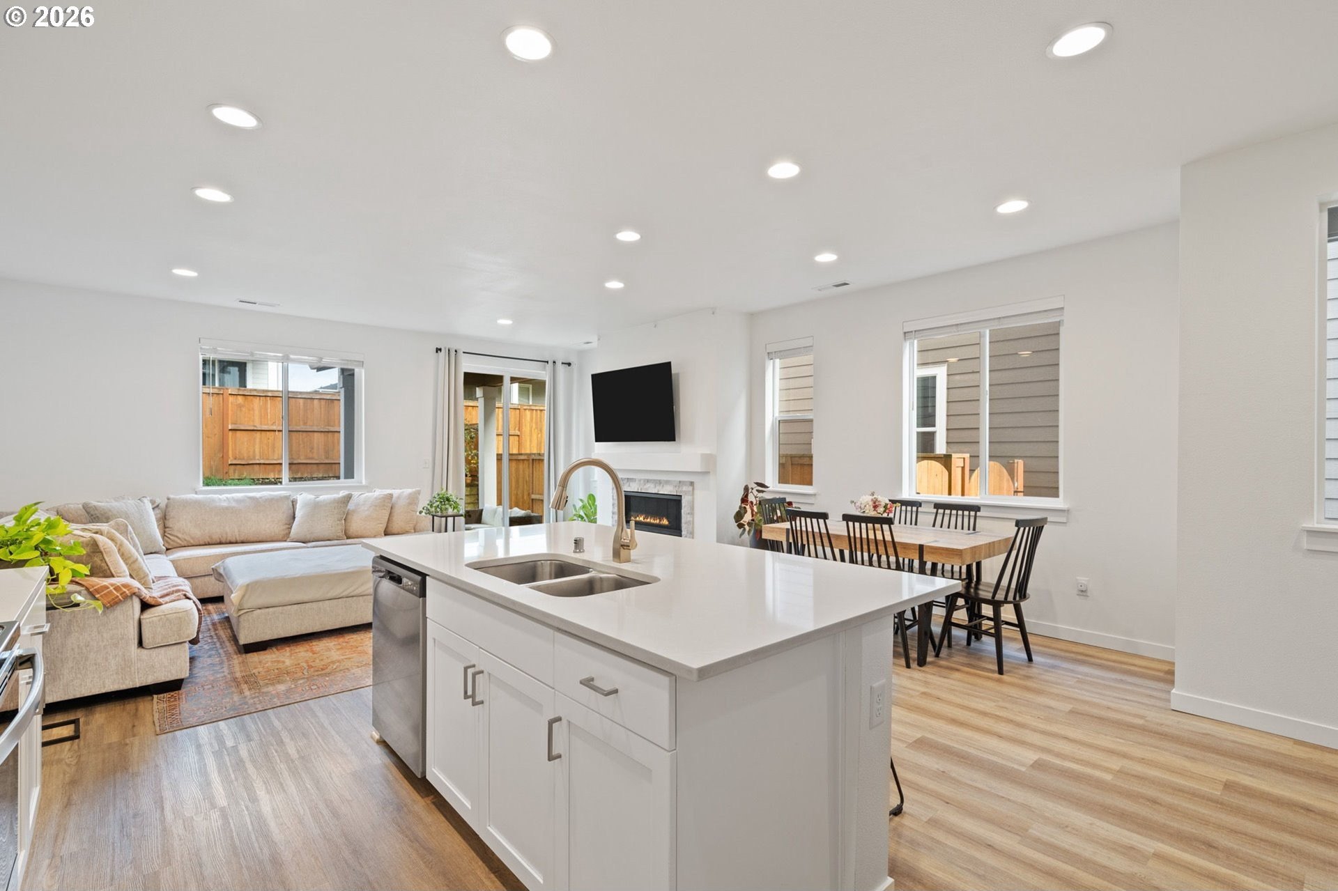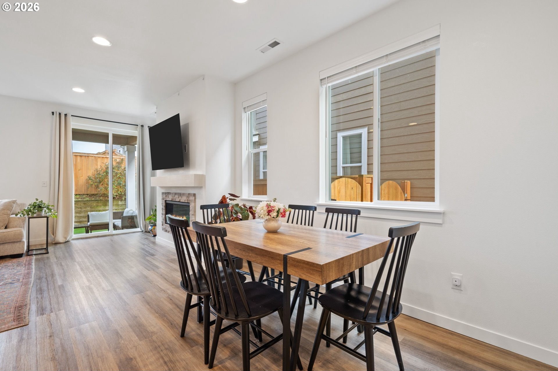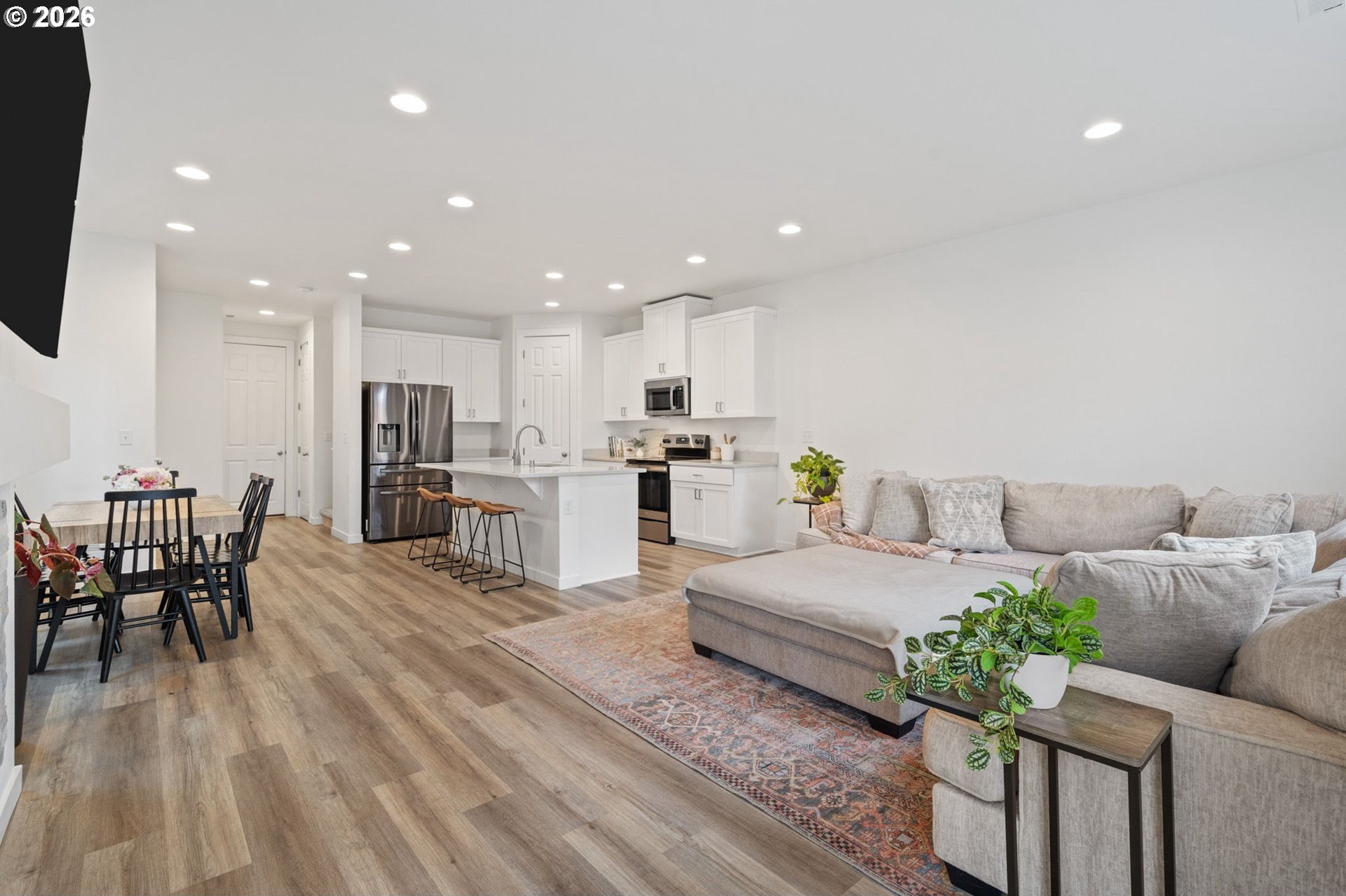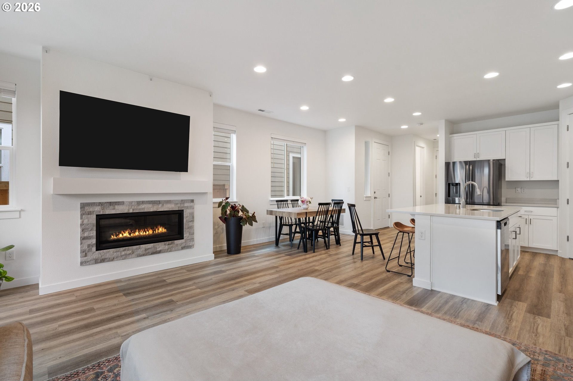 This beautiful, newer townhome truly stands out from the competition, offering many upgrades for its price point. Features include 9-foot ceilings, tall doors, and a light, bright interior with laminate flooring throughout the main. The kitchen and bathrooms showcase quartz countertops and crisp white painted cabinetry. The inviting great room includes a cozy fireplace and flows seamlessly into the dining area, making it ideal for everyday living and entertaining. A convenient powder bath is located on the main level. Upstairs, you'll find a spacious layout highlighted by a lovely primary suite with a generous walk-in closet. The laundry room is conveniently located on the upper level. A hallway bathroom offers a double-sink vanity and a tub/shower combination. Outside, enjoy a covered patio and a low-maintenance backyard featuring fresh, green AstroTurf that looks great year-round. Ideally located with excellent access to freeways, shopping, trails, and downtown Ridgefield, this home offers both comfort and convenience.