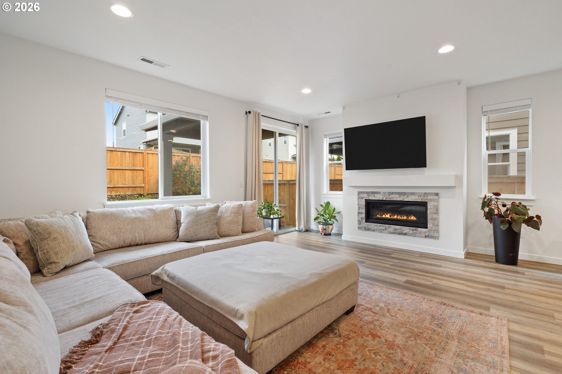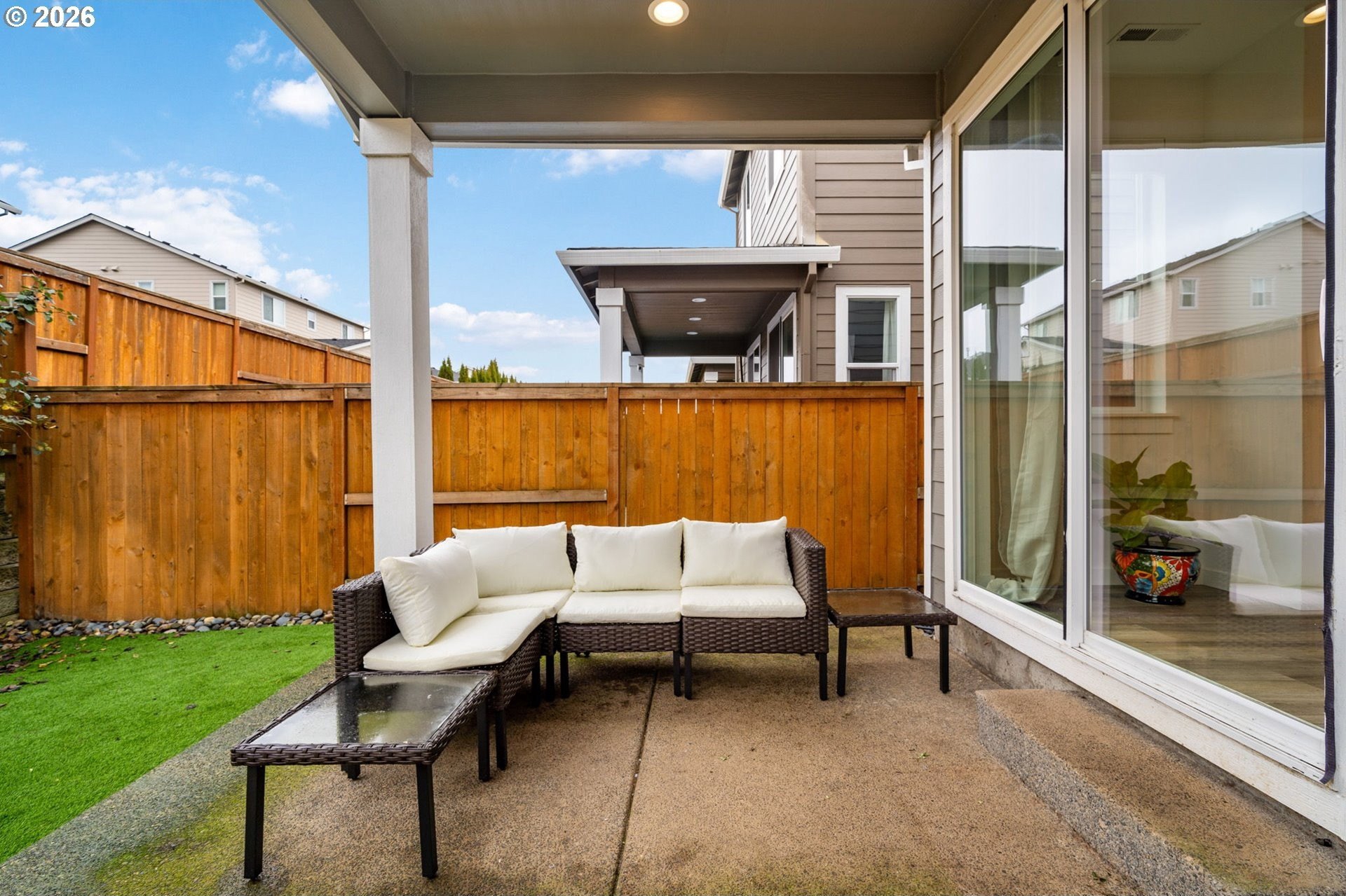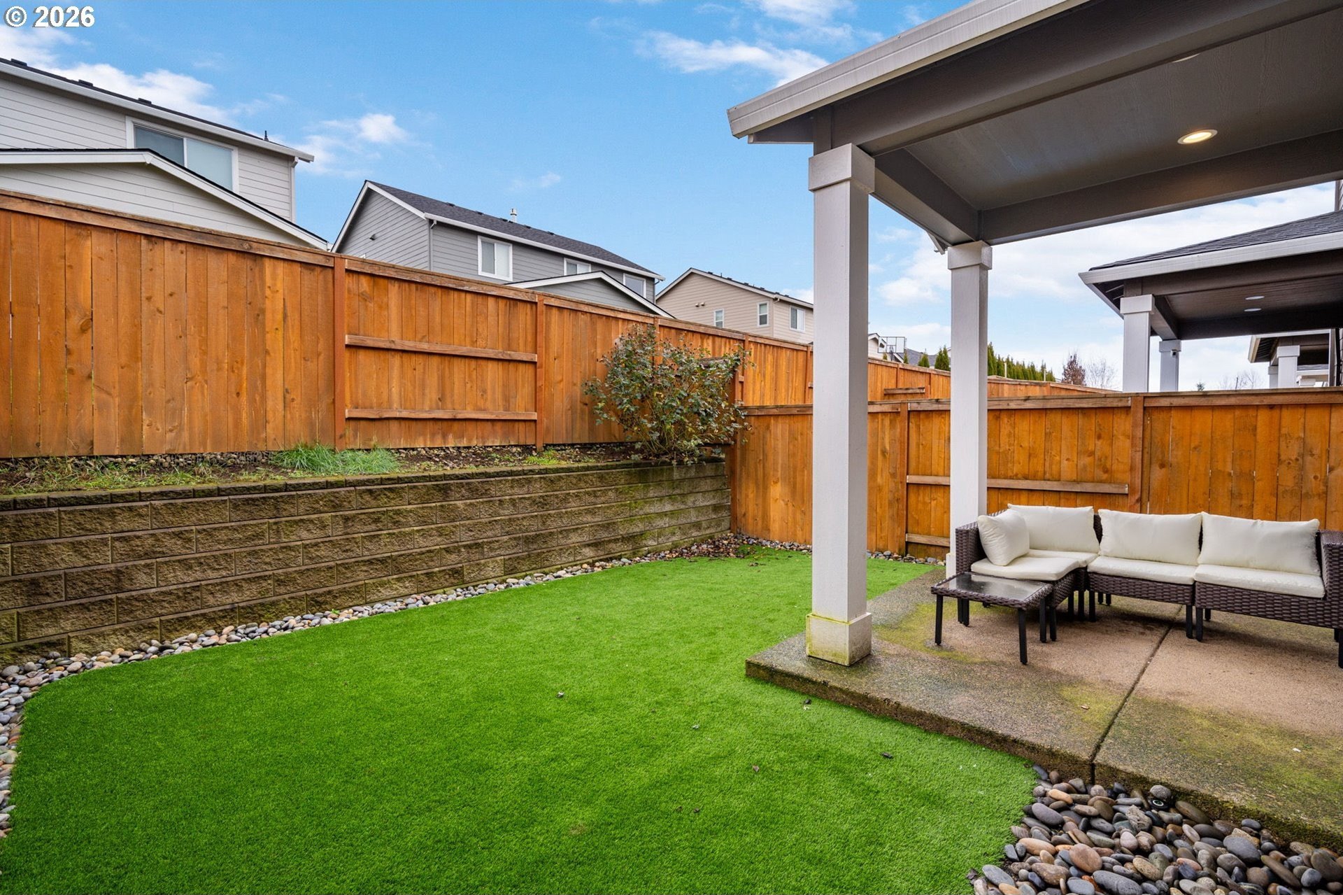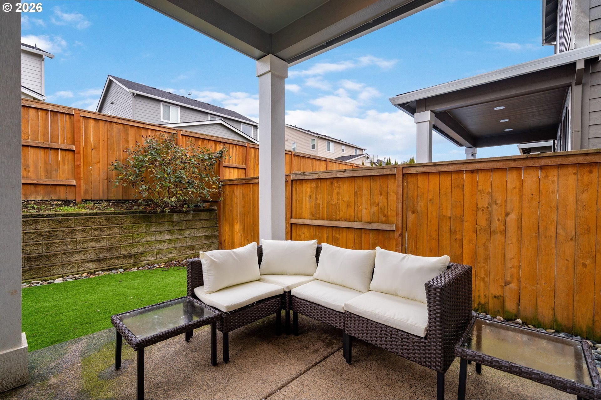 This beautiful, newer townhome truly stands out from the competition, offering many upgrades for its price point. Features include 9-foot ceilings, tall doors, and a light, bright interior with laminate flooring throughout the main. The kitchen and bathrooms showcase quartz countertops and crisp white painted cabinetry. The inviting great room includes a cozy fireplace and flows seamlessly into the dining area, making it ideal for everyday living and entertaining. A convenient powder bath is located on the main level. Upstairs, you'll find a spacious layout highlighted by a lovely primary suite with a generous walk-in closet. The laundry room is conveniently located on the upper level. A hallway bathroom offers a double-sink vanity and a tub/shower combination. Outside, enjoy a covered patio and a low-maintenance backyard featuring fresh, green AstroTurf that looks great year-round. Ideally located with excellent access to freeways, shopping, trails, and downtown Ridgefield, this home offers both comfort and convenience.