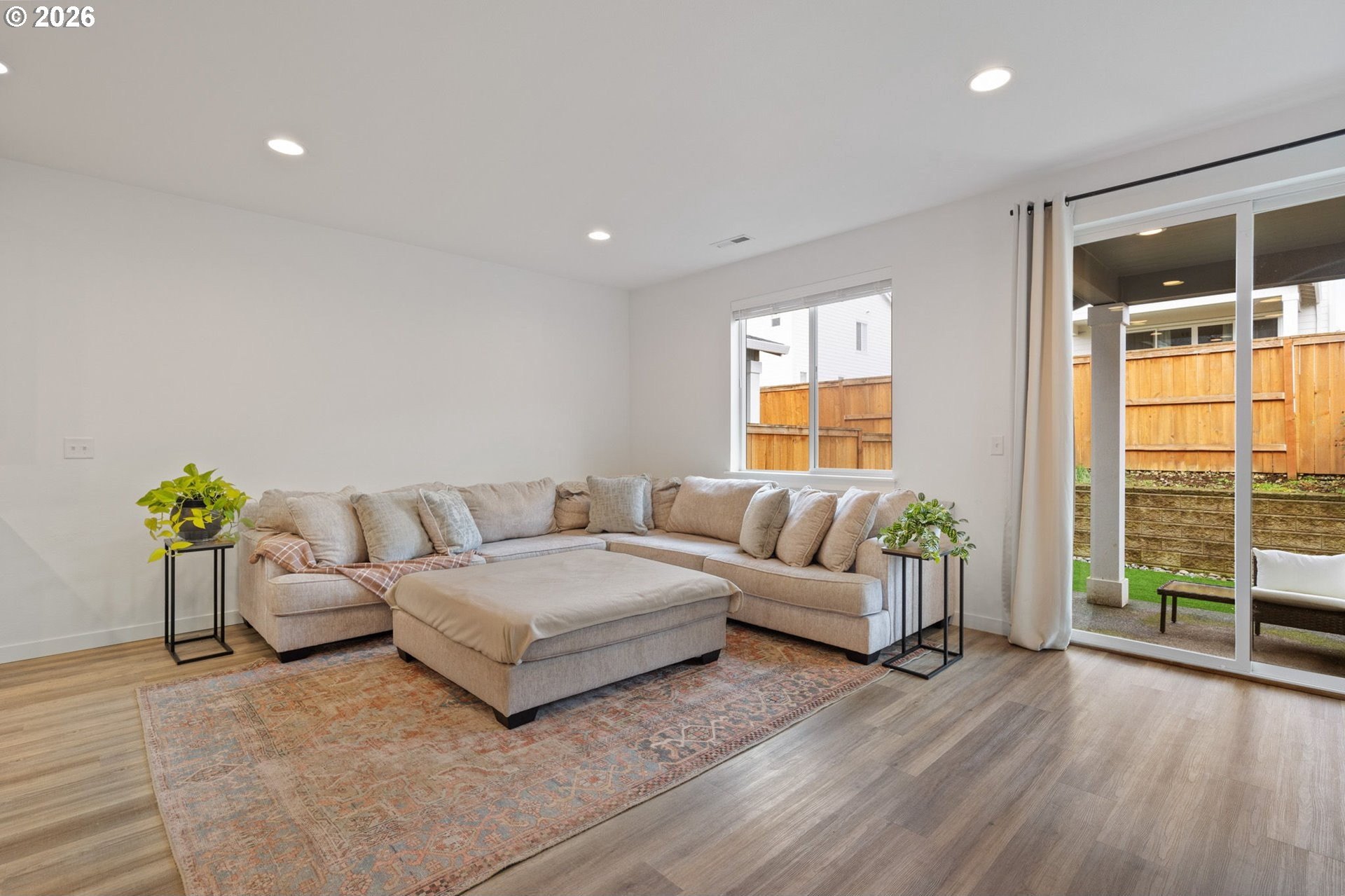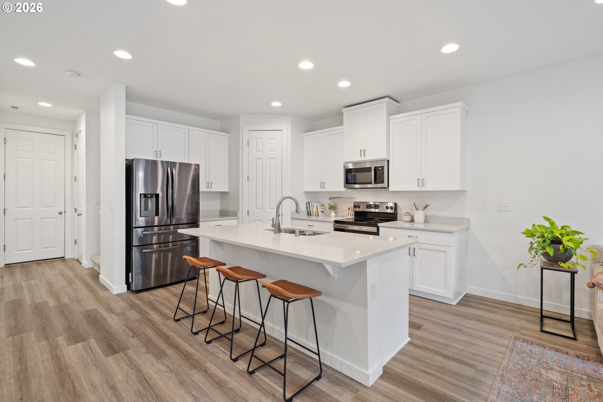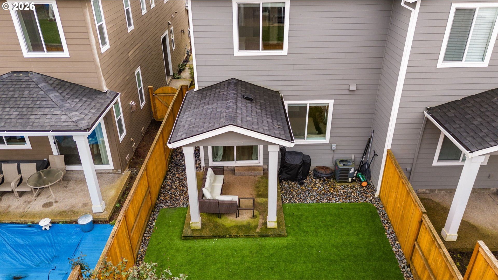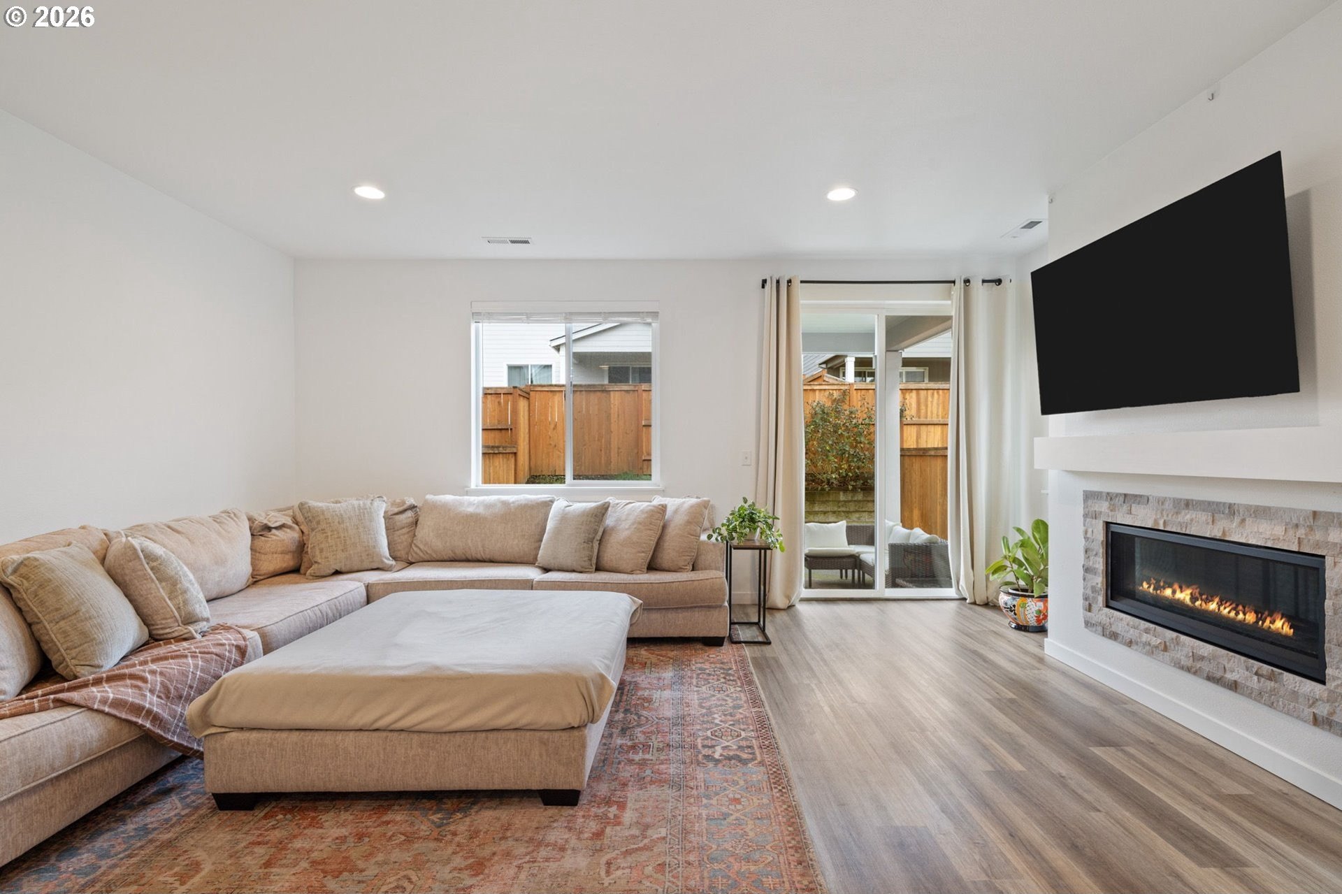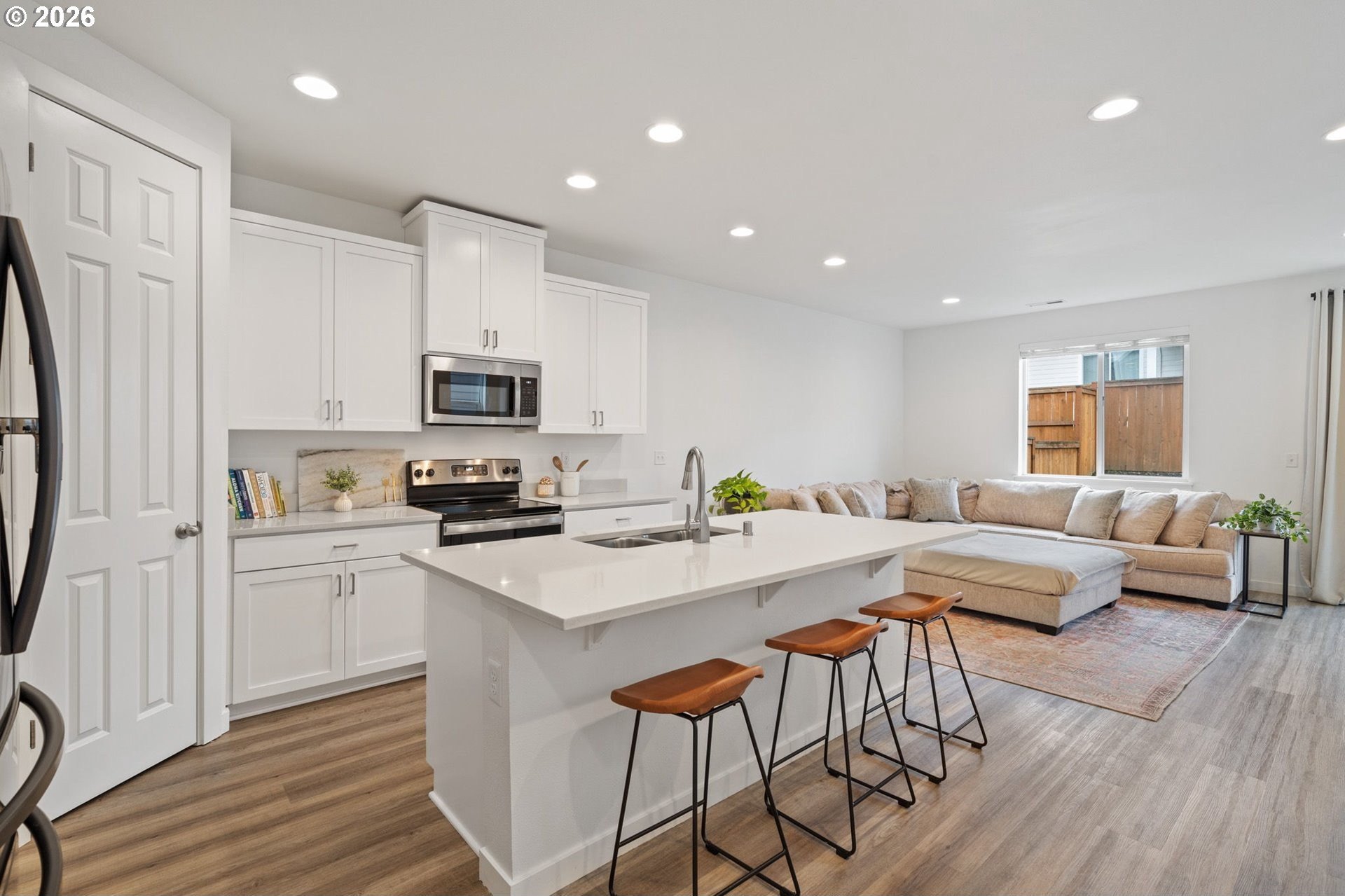 This beautiful, newer townhome truly stands out from the competition, offering many upgrades for its price point. Features include 9-foot ceilings, tall doors, and a light, bright interior with laminate flooring throughout the main. The kitchen and bathrooms showcase quartz countertops and crisp white painted cabinetry. The inviting great room includes a cozy fireplace and flows seamlessly into the dining area, making it ideal for everyday living and entertaining. A convenient powder bath is located on the main level. Upstairs, you'll find a spacious layout highlighted by a lovely primary suite with a generous walk-in closet. The laundry room is conveniently located on the upper level. A hallway bathroom offers a double-sink vanity and a tub/shower combination. Outside, enjoy a covered patio and a low-maintenance backyard featuring fresh, green AstroTurf that looks great year-round. Ideally located with excellent access to freeways, shopping, trails, and downtown Ridgefield, this home offers both comfort and convenience.