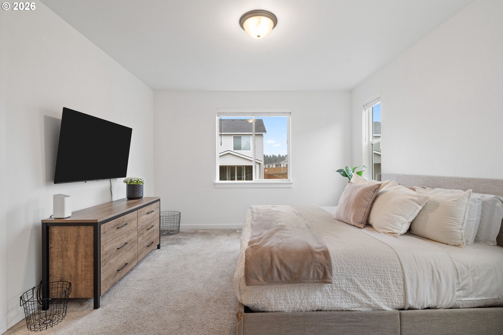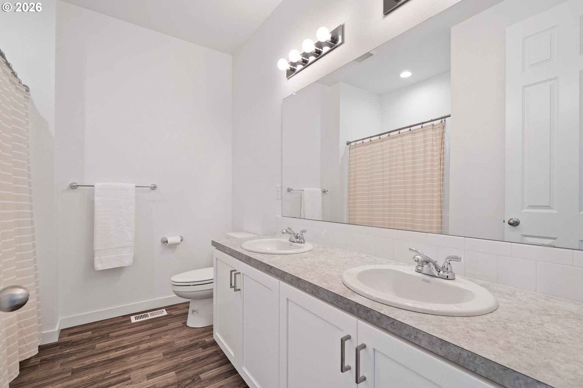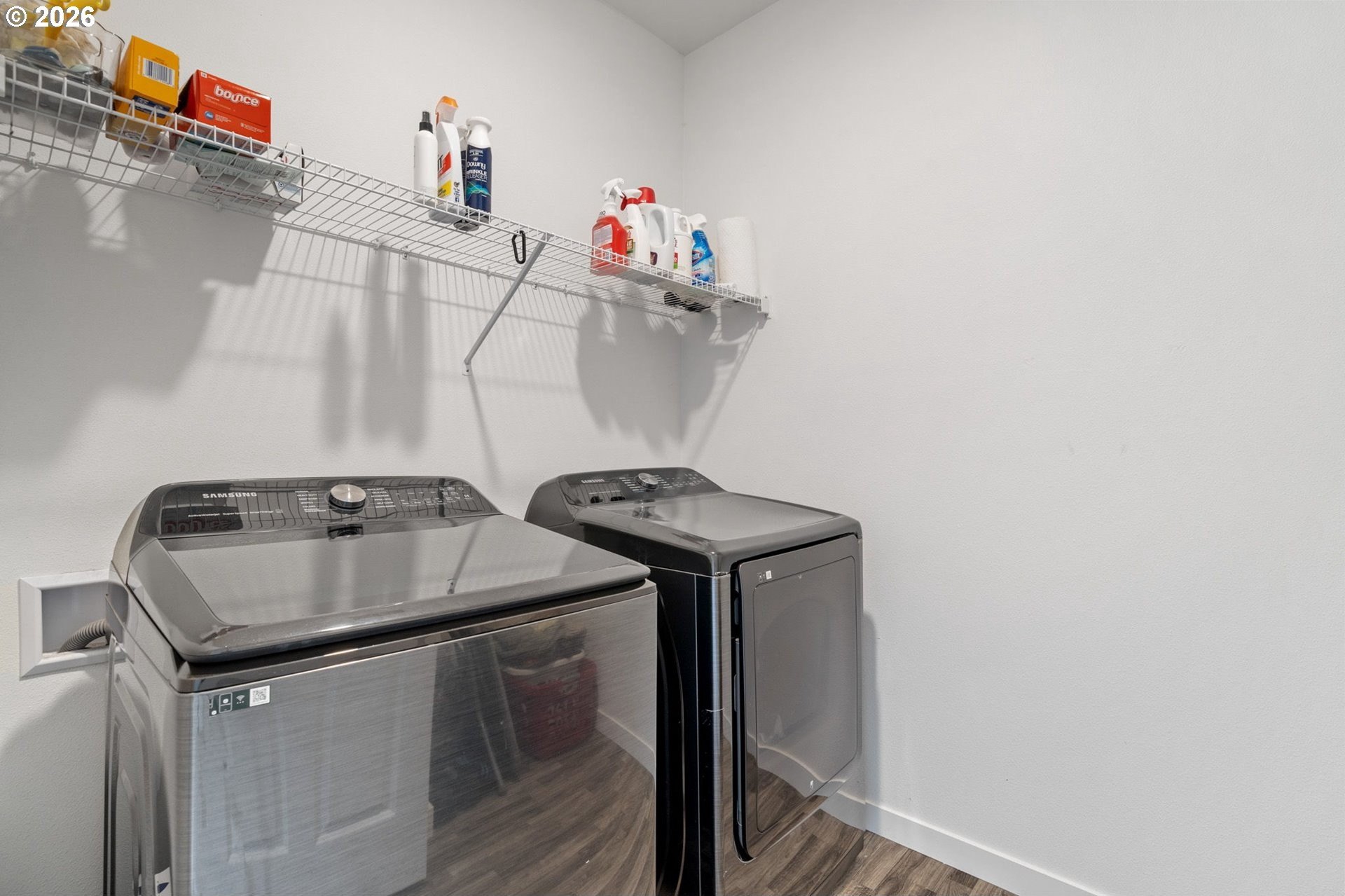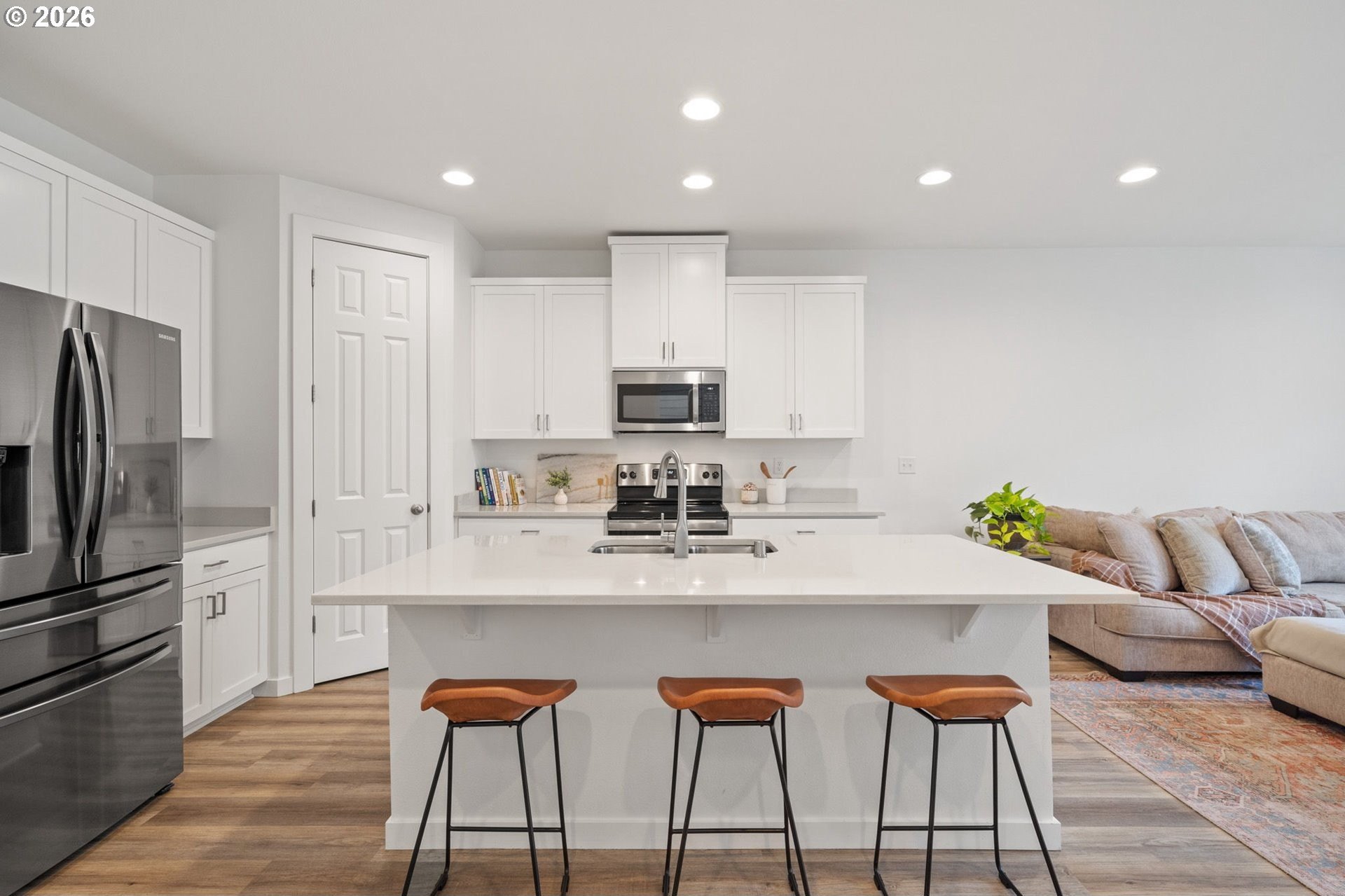 This beautiful, newer townhome truly stands out from the competition, offering many upgrades for its price point. Features include 9-foot ceilings, tall doors, and a light, bright interior with laminate flooring throughout the main. The kitchen and bathrooms showcase quartz countertops and crisp white painted cabinetry. The inviting great room includes a cozy fireplace and flows seamlessly into the dining area, making it ideal for everyday living and entertaining. A convenient powder bath is located on the main level. Upstairs, you'll find a spacious layout highlighted by a lovely primary suite with a generous walk-in closet. The laundry room is conveniently located on the upper level. A hallway bathroom offers a double-sink vanity and a tub/shower combination. Outside, enjoy a covered patio and a low-maintenance backyard featuring fresh, green AstroTurf that looks great year-round. Ideally located with excellent access to freeways, shopping, trails, and downtown Ridgefield, this home offers both comfort and convenience.