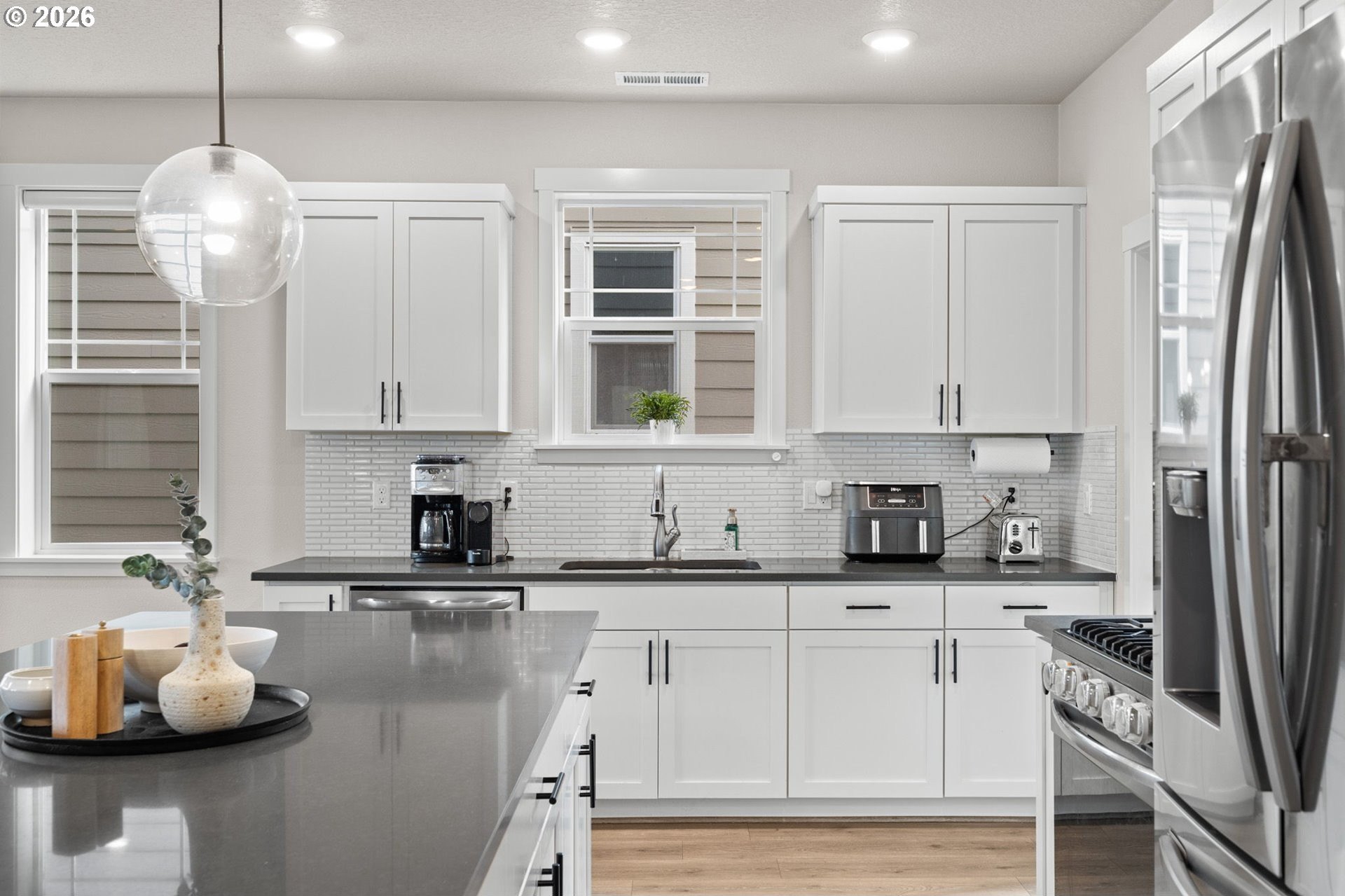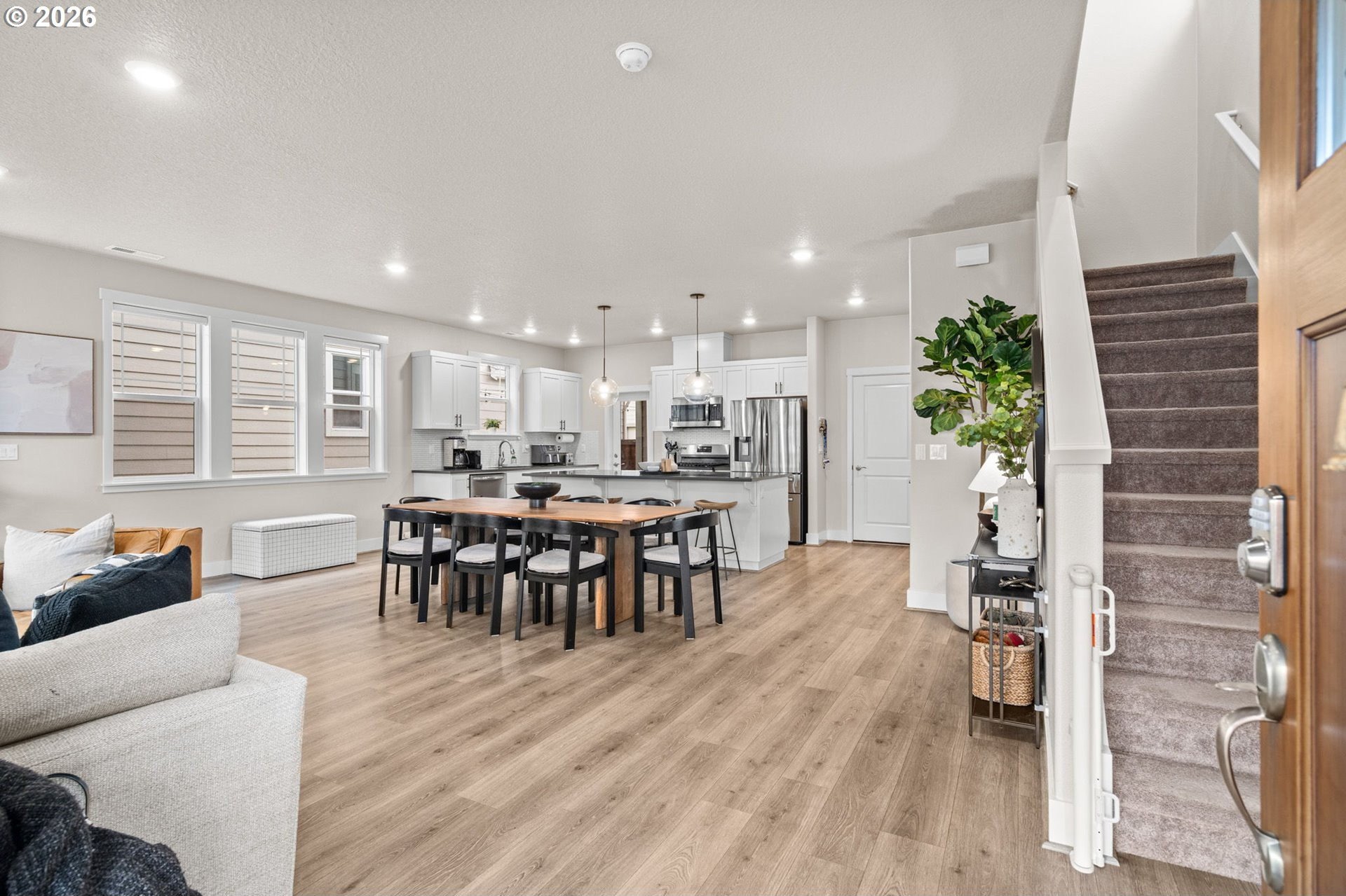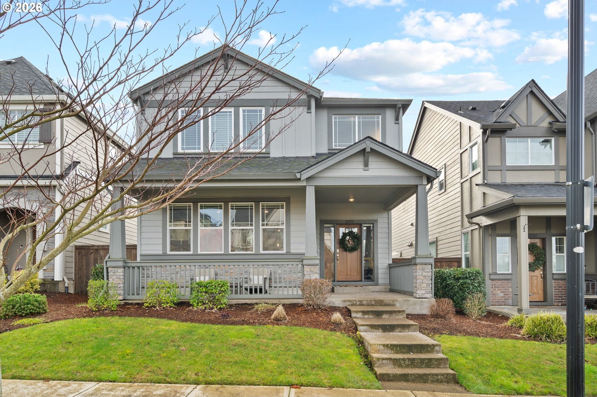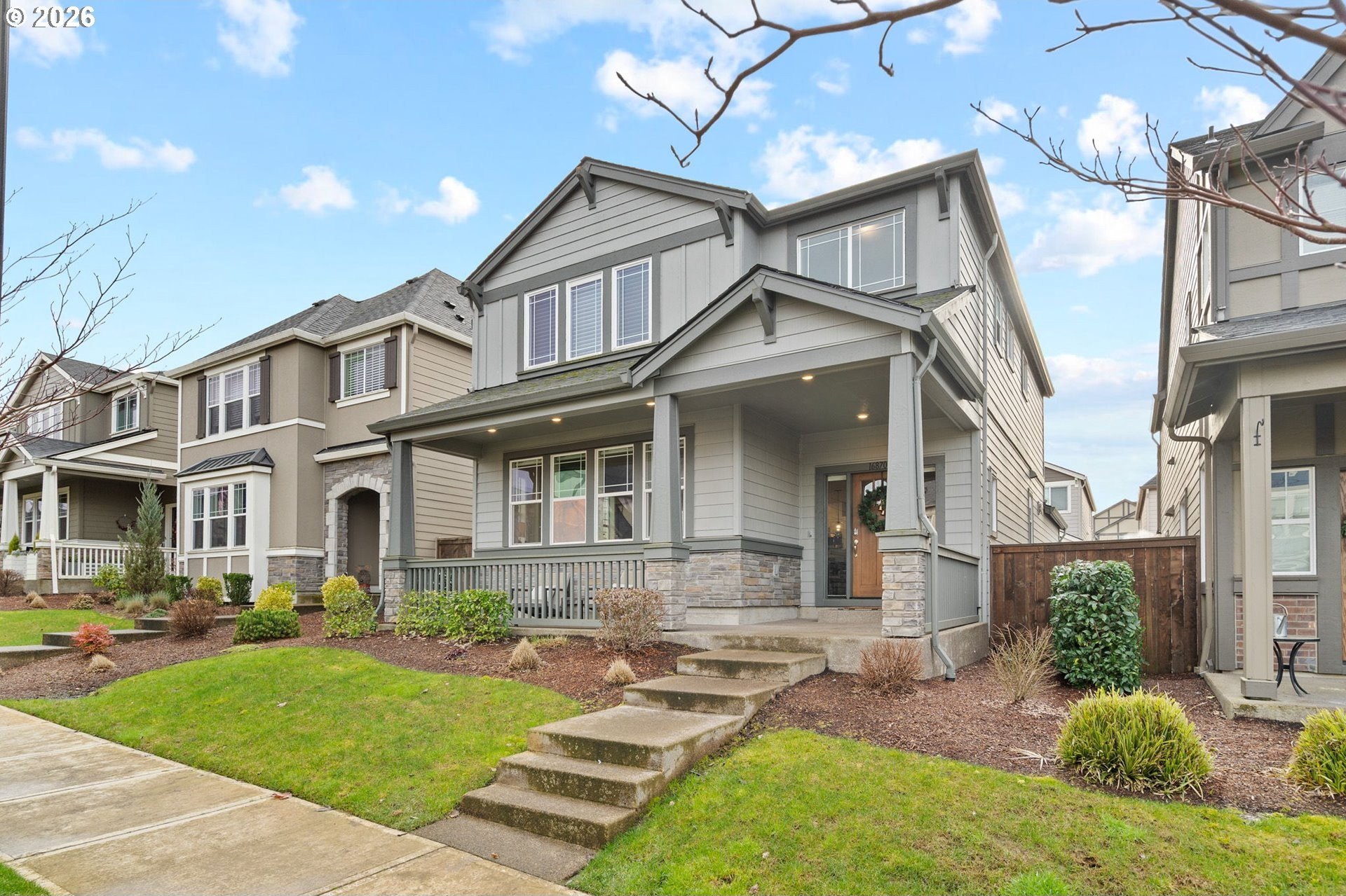 Welcome home to this stunning 2020-built two-story traditional offering the perfect blend of modern comfort and timeless style. Featuring 3 bedrooms, 2.5 baths, and 1,791 sq. ft., this impeccably maintained home lives like new with thoughtful upgrades throughout.Step inside to an open and bright main level with luxury vinyl plank flooring, designer finishes, and expansive living and dining spaces ideal for entertaining. The gorgeous kitchen is the heart of the home, showcasing slab quartz countertops, stainless steel appliances, a large island, and sleek cabinetry.Upstairs, the spacious primary suite includes a walk-in closet and spa-like bath with quartz countertops and dual sinks. Two additional bedrooms, a full bath, and upper-level laundry provide everyday convenience.Outside, enjoy the low-maintenance fully turfed backyard with custom paver patio-perfect for year-round play, relaxing, or BBQ season. Additional features include power blinds, energy-efficient systems, and modern upgraded materials from top to bottom.HOA offers exceptional amenities including a pool, clubhouse, weight room, multiple parks, and is ideally situated by Progress Ridge, shopping, dining, and outdoor recreation.A truly turnkey property in a desirable community-nothing left to do but move in and enjoy. Schedule your showing today!