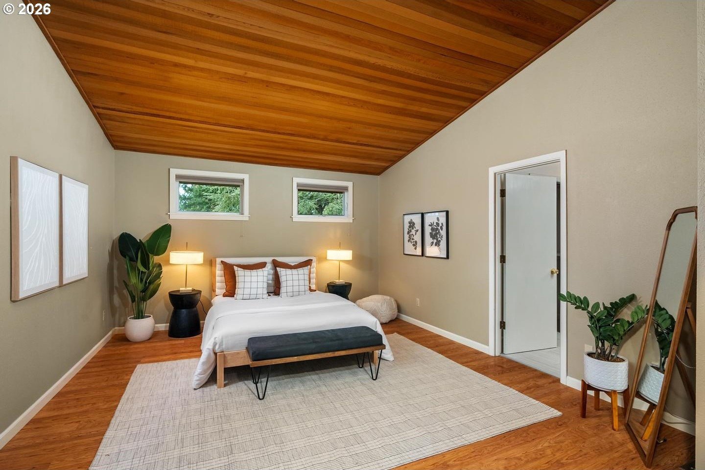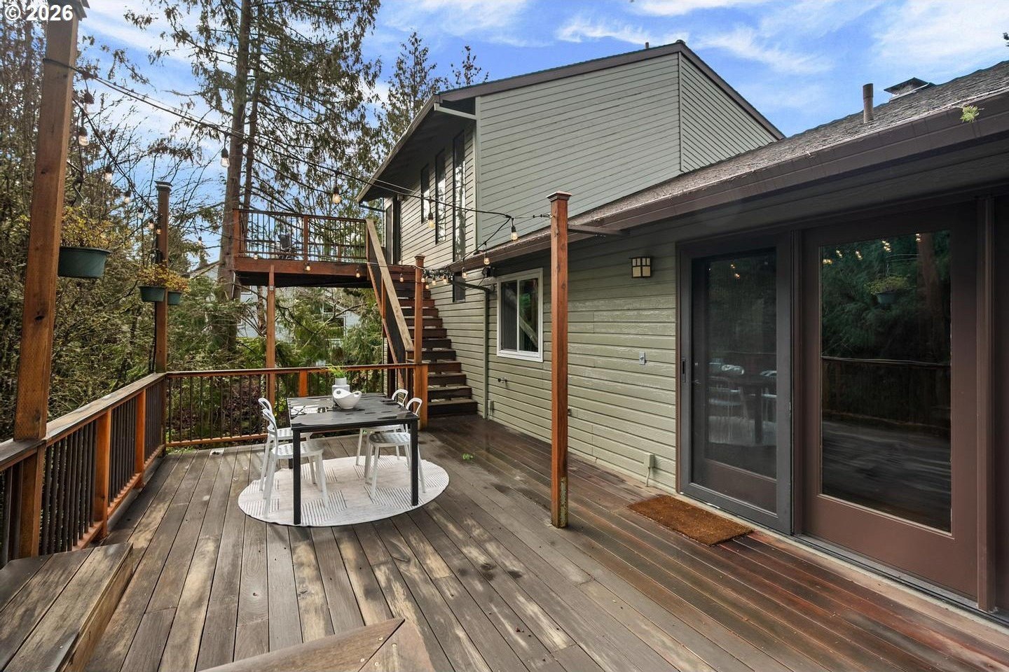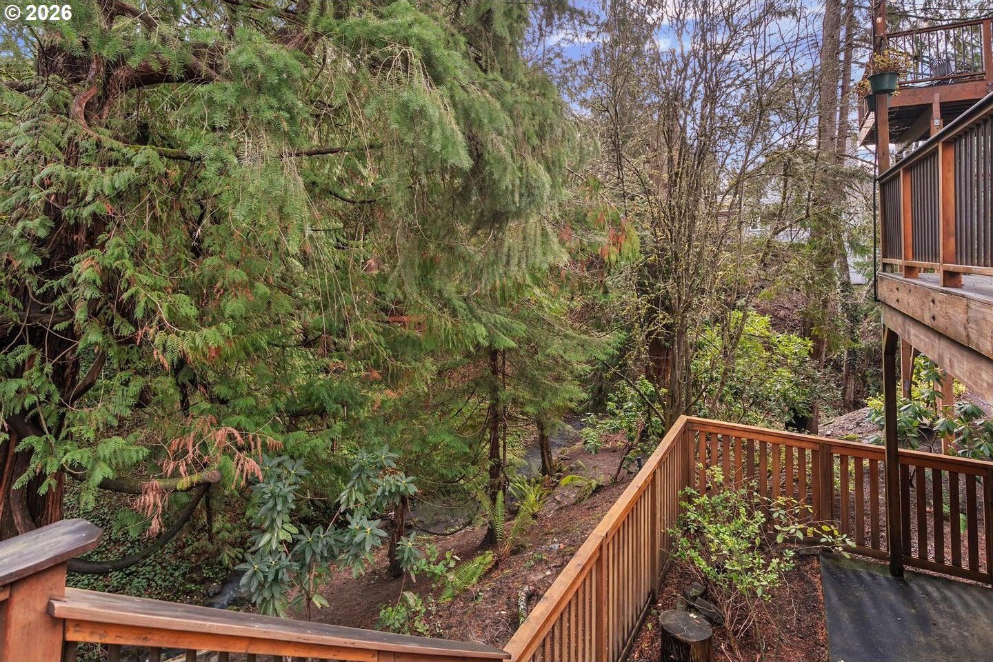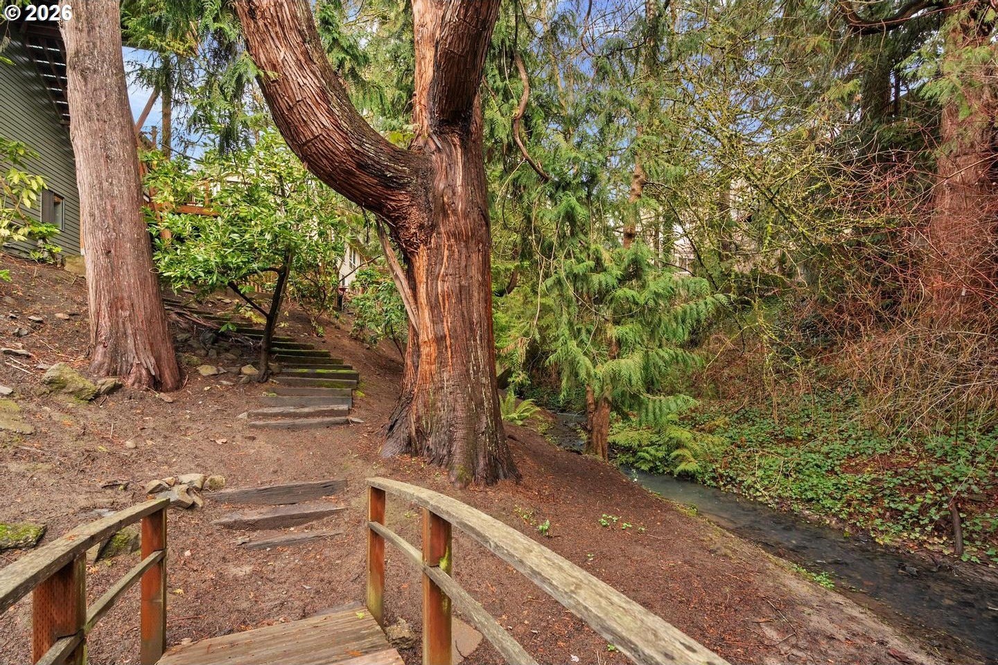 Originally built in 1981, this stunning northwest contemporary stands proudly on almost a quarter acre lot in the sought after West Haven neighborhood. As you approach the home you are welcomed by a paver patio, stunning plantings and a grand front door landing. Entering the home you find yourself in a large foyer with custom flagstone underfoot, drawing you into the home's gorgeous main floor. The living room is magazine-worthy, boasting vaulted ceilings clad in gorgeous clear vertical grain cedar, updated flooring and a stunning wood burning fireplace that anchors the room. Moving seamlessly into the dining room and beyond to the kitchen you immediately witness the home's mid-century influences highlighted by its surface treatments and classic circular flow pattern. The kitchen has been updated to include granite counters, maple shaker cabinetry and stainless steel appliances while the dining room boasts an expansive three panel, full light French door to the backyard deck.Moving beyond the almost 1000 square foot main floor you will find a private, upstairs primary suite. Vaulted ceilings clad in cedar, updated flooring and its own private deck balance perfectly against the stunning, remodeled en suite bathroom which features a custom, double vanity, free standing tub, gorgeous tiled shower and walk-in closet. Moving back downstairs you will find approximately 1500 square feet of finished space in the daylight basement. Three additional bedrooms, a third bathroom, laundry room and large family room / media room highlight the lower level which also offers direct access to a private patio through expansive patio doors. As with the careful interior stewardship, the exterior has been carefully updated and maintained. Multi-level decking, featuring IPE hardwoods offer direct access to the backyard from the upper floors, while terraced grounds maximize the property's utility and stunning backdrop which includes a picturesque creek & established trees.