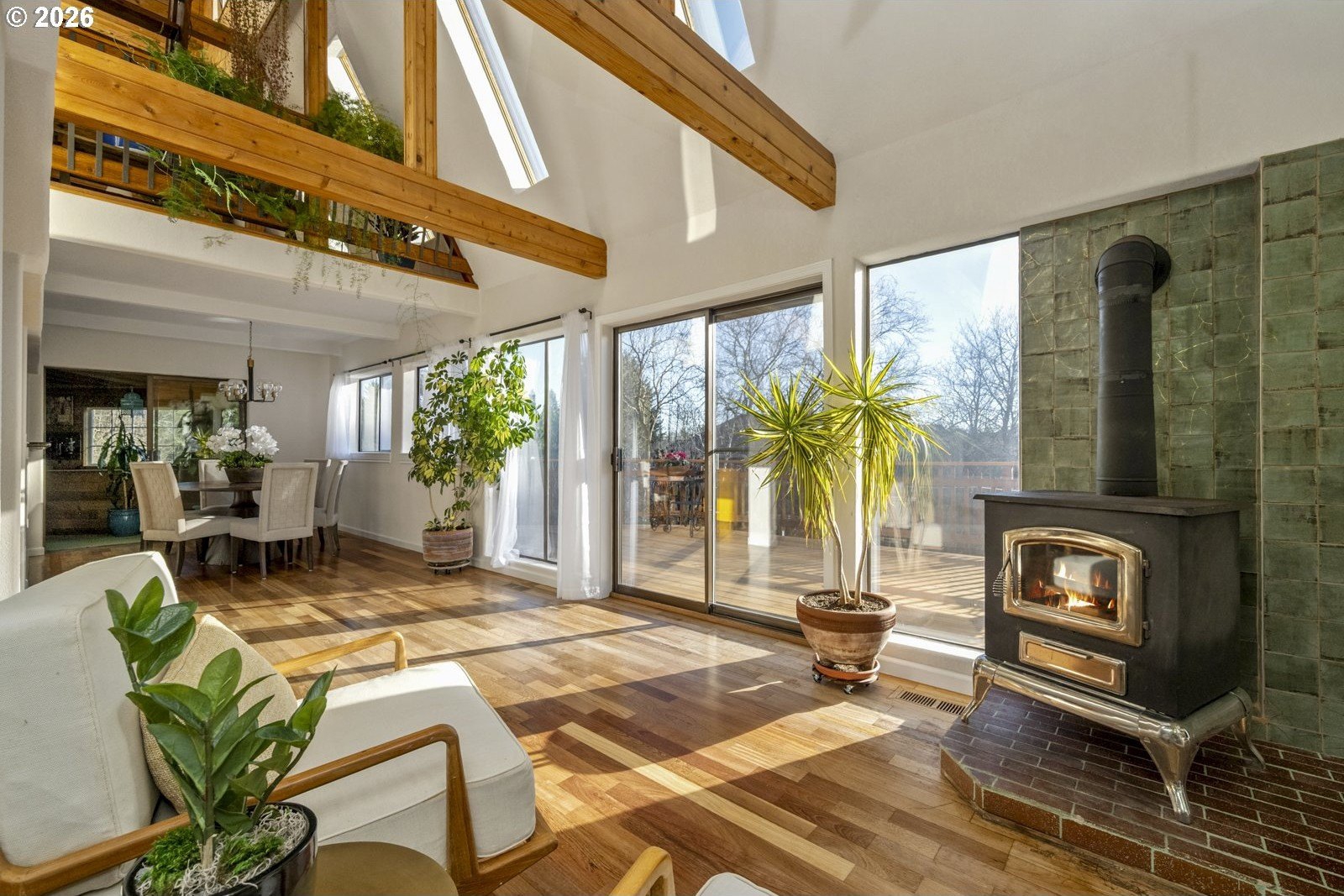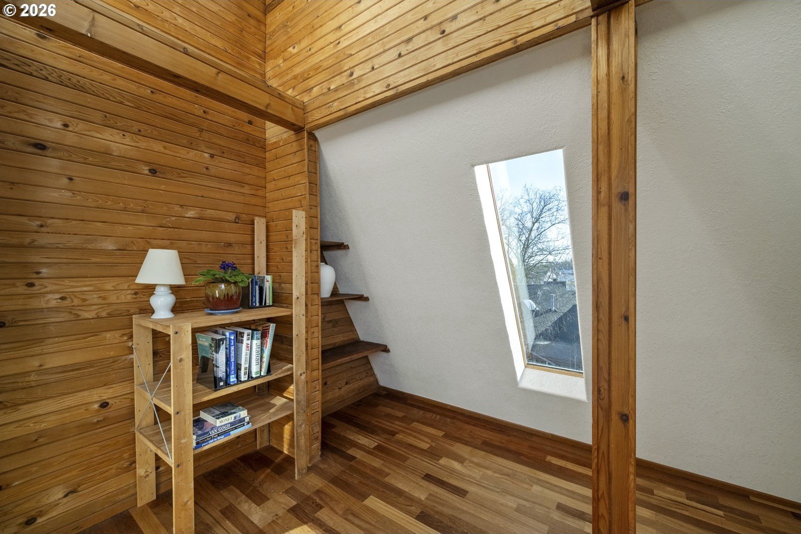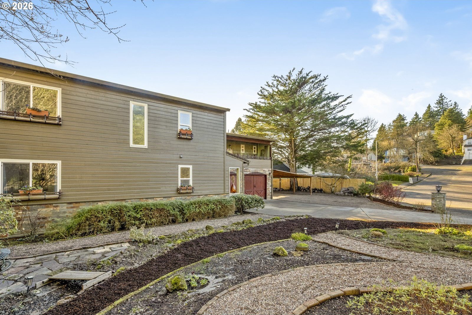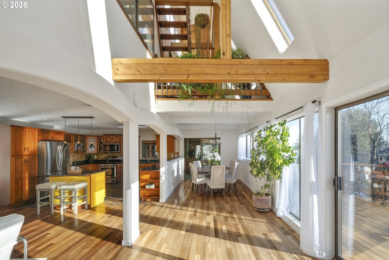 Located on a private quarter-acre with views over the neighborhood, this thoughtfully remodeled home offers architectural character, exceptional privacy, and a peaceful setting in a safe, established neighborhood.Brazilian cherry hardwood floors, vaulted ceilings, wood-wrapped beams, and graceful arches create warmth and visual interest throughout. The spacious kitchen serves as the heart of the home, ideal for both daily living and entertaining, with cherry cabinetry, granite countertops, and stainless steel appliances. Living spaces are filled with natural light and anchored by a cozy wood stove, while a wood-paneled game room adds versatility. Unique architectural elements include a third-floor loft perfect for an art studio or creative space, as well as an office loft overlooking the main living area. The primary suite features a private covered balcony with views of the front of the property-an inviting spot for morning coffee-along with an en-suite bath offering vaulted ceilings, a jetted tub, and walk-in shower. Ample parking includes a two-car garage with custom doors, a two-car carport, and dedicated RV parking. New roof, hot water heater, paint, lights and hardware. Enjoy a highly walkable location just minutes from Starbucks and New Seasons Market. This home blends privacy, thoughtful design, and everyday livability in a truly distinctive setting....don't miss it! [Home Energy Score = 2. HES Report