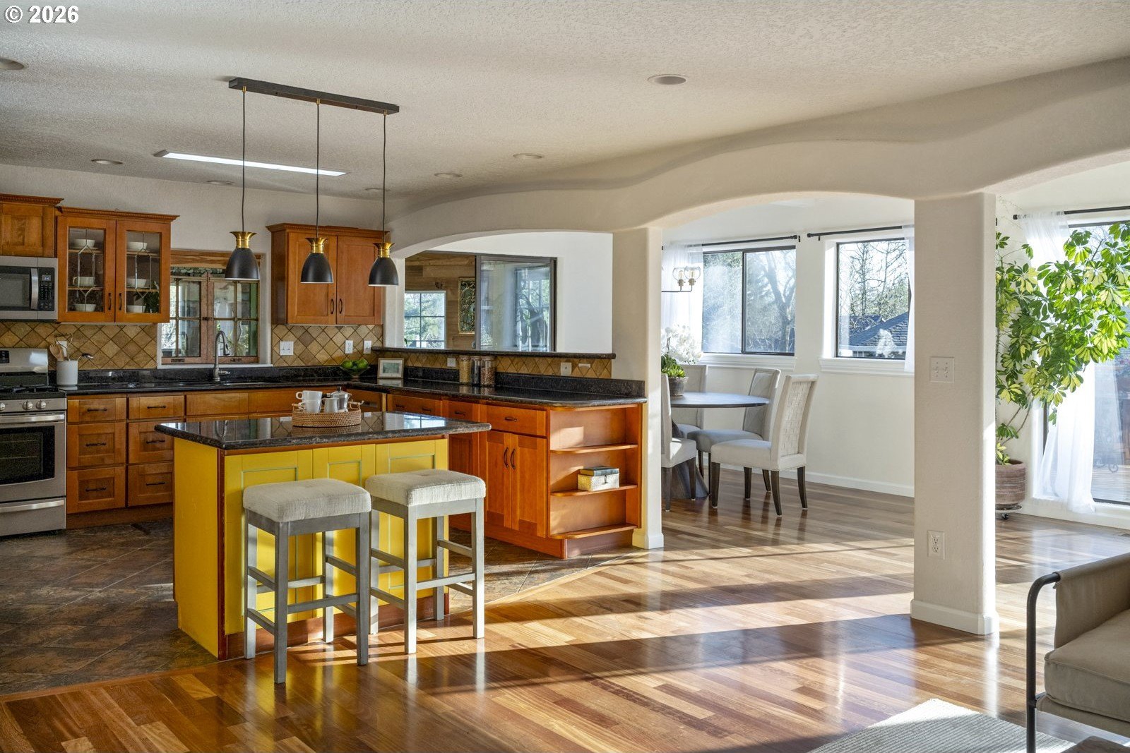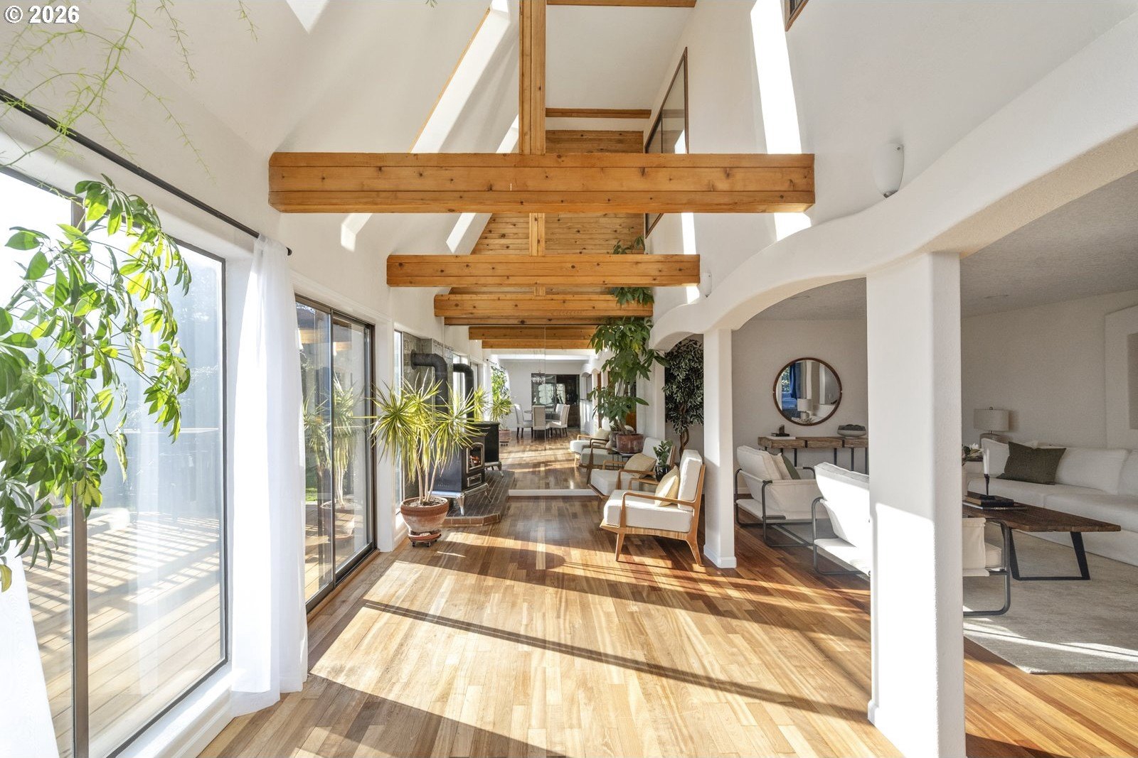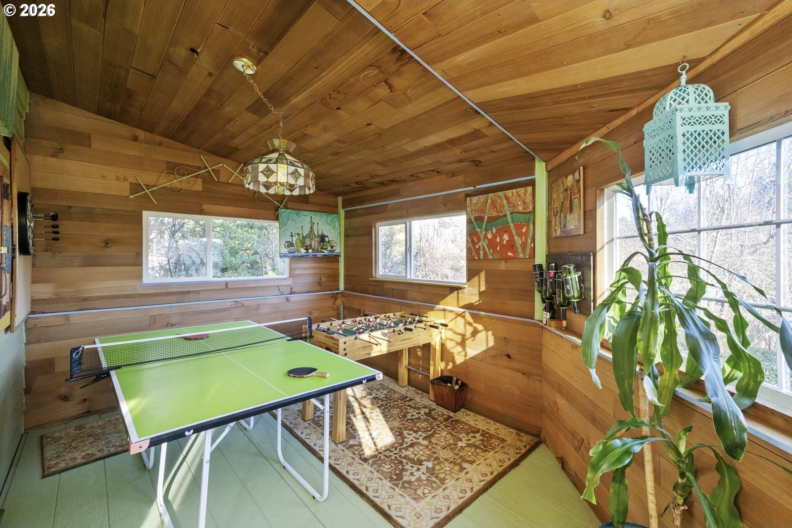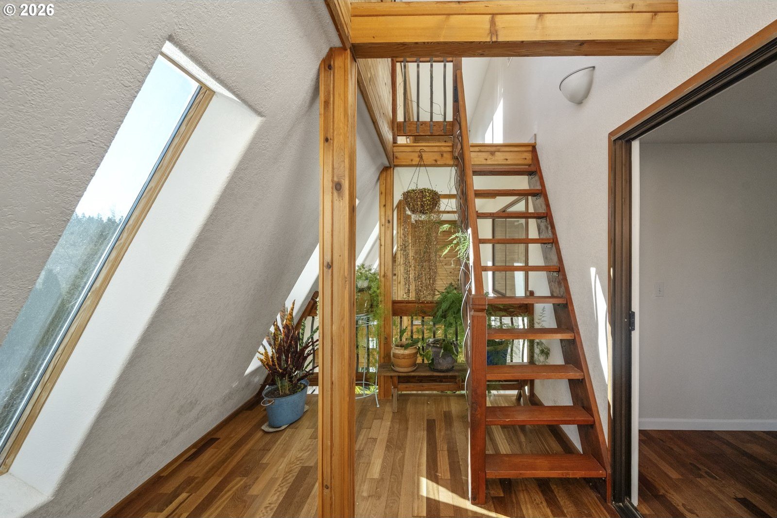 Located on a private quarter-acre with views over the neighborhood, this thoughtfully remodeled home offers architectural character, exceptional privacy, and a peaceful setting in a safe, established neighborhood.Brazilian cherry hardwood floors, vaulted ceilings, wood-wrapped beams, and graceful arches create warmth and visual interest throughout. The spacious kitchen serves as the heart of the home, ideal for both daily living and entertaining, with cherry cabinetry, granite countertops, and stainless steel appliances. Living spaces are filled with natural light and anchored by a cozy wood stove, while a wood-paneled game room adds versatility. Unique architectural elements include a third-floor loft perfect for an art studio or creative space, as well as an office loft overlooking the main living area. The primary suite features a private covered balcony with views of the front of the property-an inviting spot for morning coffee-along with an en-suite bath offering vaulted ceilings, a jetted tub, and walk-in shower. Ample parking includes a two-car garage with custom doors, a two-car carport, and dedicated RV parking. New roof, hot water heater, paint, lights and hardware. Enjoy a highly walkable location just minutes from Starbucks and New Seasons Market. This home blends privacy, thoughtful design, and everyday livability in a truly distinctive setting....don't miss it! [Home Energy Score = 2. HES Report