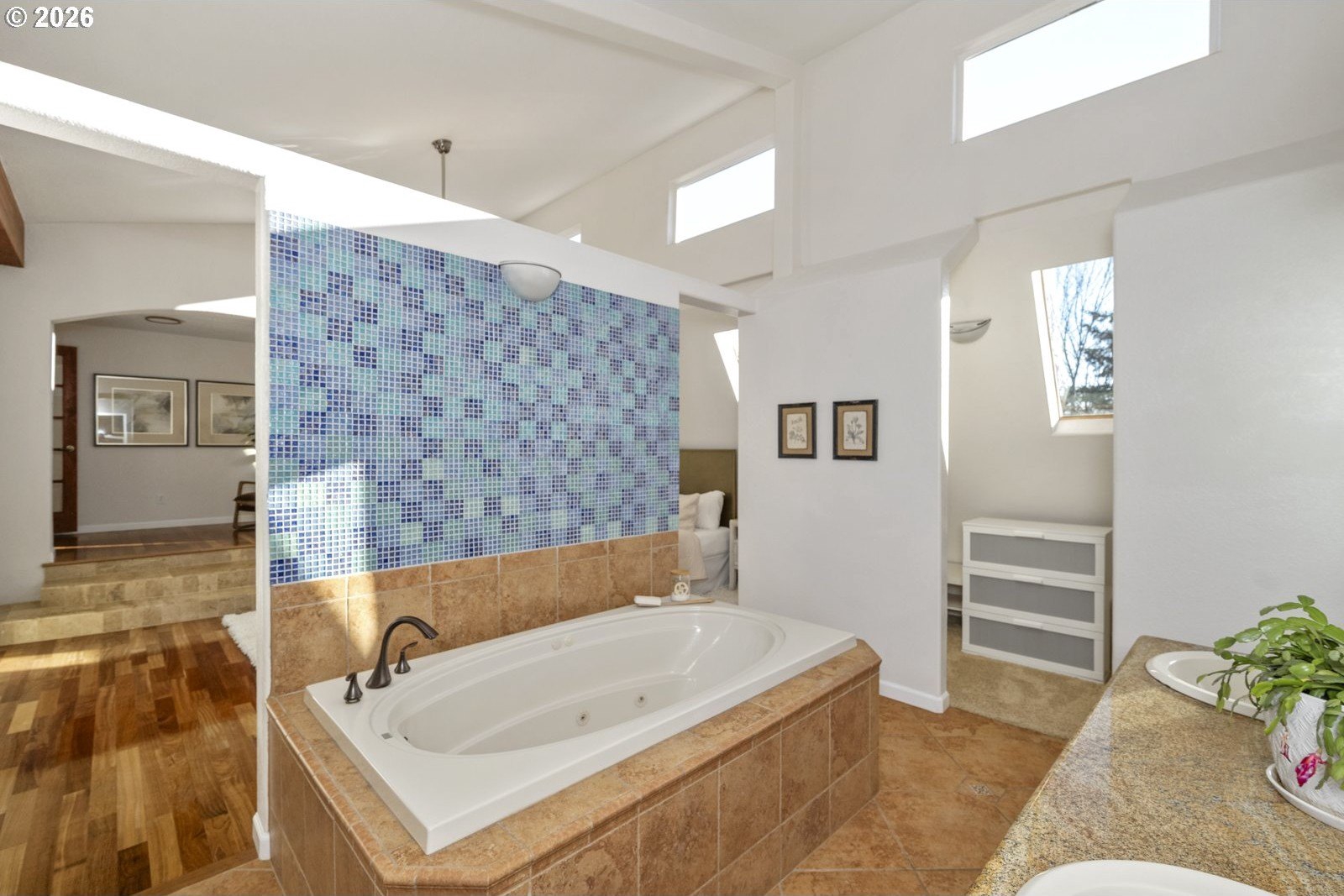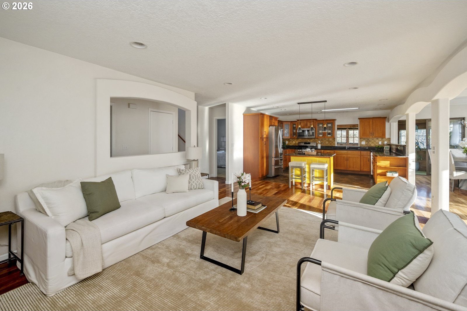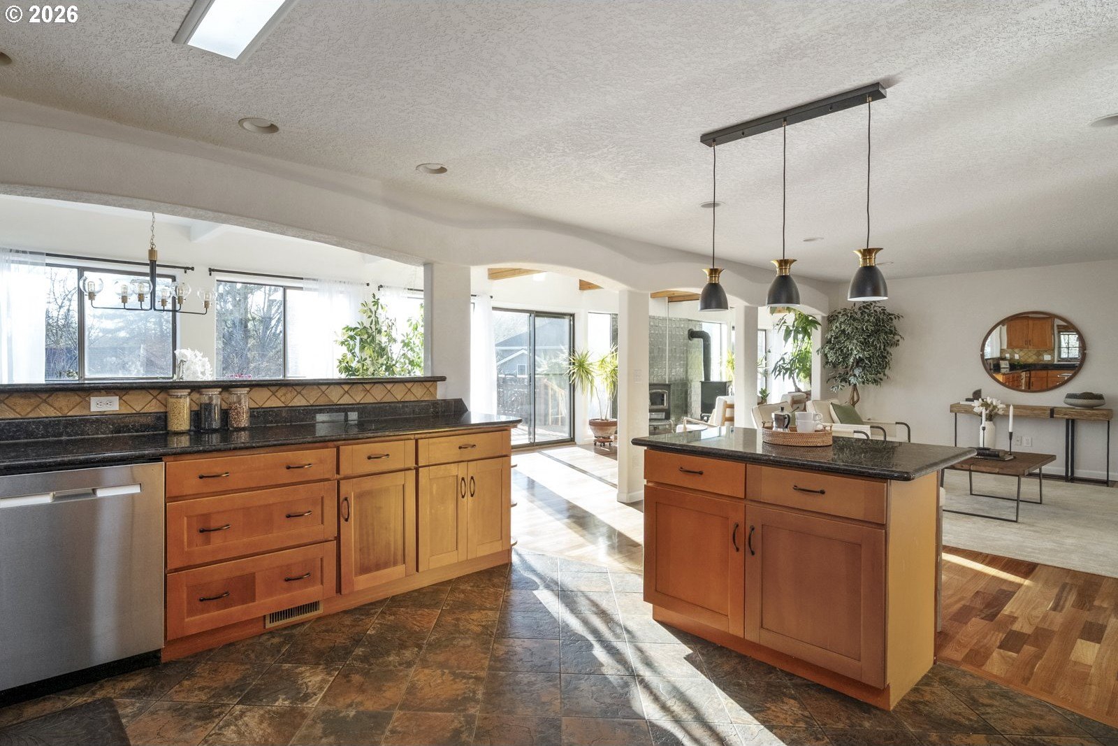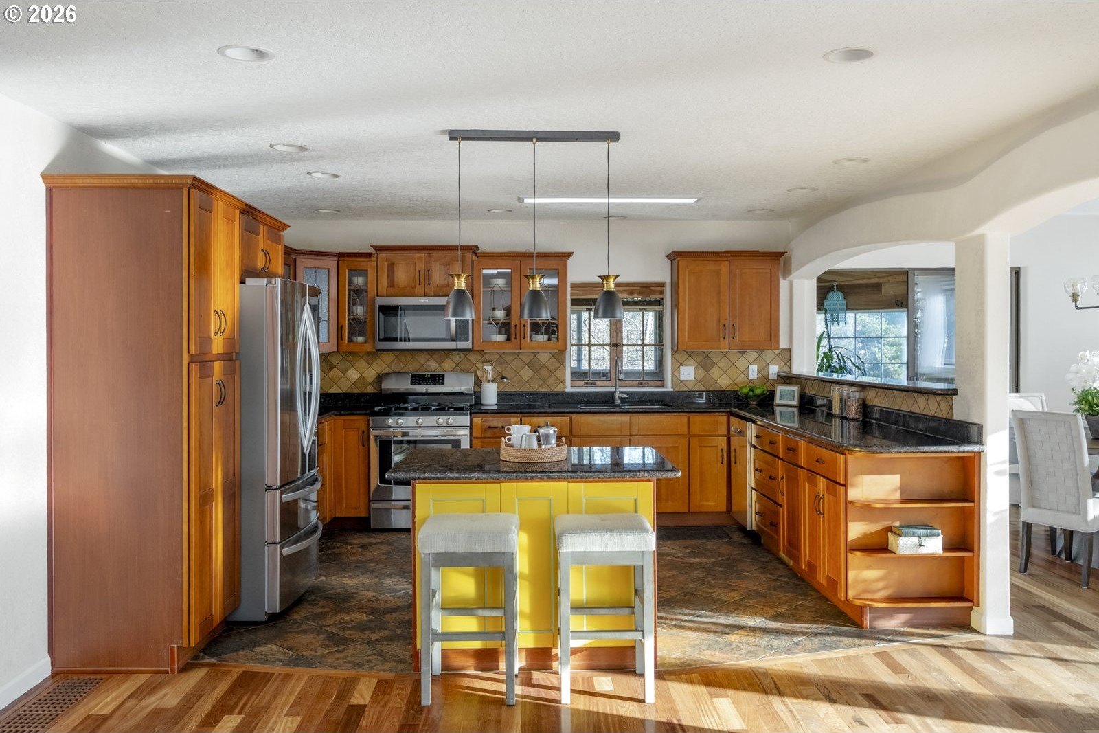 Located on a private quarter-acre with views over the neighborhood, this thoughtfully remodeled home offers architectural character, exceptional privacy, and a peaceful setting in a safe, established neighborhood.Brazilian cherry hardwood floors, vaulted ceilings, wood-wrapped beams, and graceful arches create warmth and visual interest throughout. The spacious kitchen serves as the heart of the home, ideal for both daily living and entertaining, with cherry cabinetry, granite countertops, and stainless steel appliances. Living spaces are filled with natural light and anchored by a cozy wood stove, while a wood-paneled game room adds versatility. Unique architectural elements include a third-floor loft perfect for an art studio or creative space, as well as an office loft overlooking the main living area. The primary suite features a private covered balcony with views of the front of the property-an inviting spot for morning coffee-along with an en-suite bath offering vaulted ceilings, a jetted tub, and walk-in shower. Ample parking includes a two-car garage with custom doors, a two-car carport, and dedicated RV parking. New roof, hot water heater, paint, lights and hardware. Enjoy a highly walkable location just minutes from Starbucks and New Seasons Market. This home blends privacy, thoughtful design, and everyday livability in a truly distinctive setting....don't miss it! [Home Energy Score = 2. HES Report