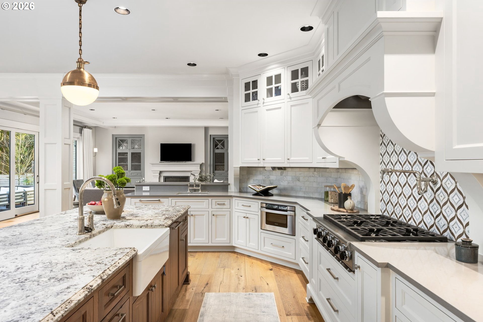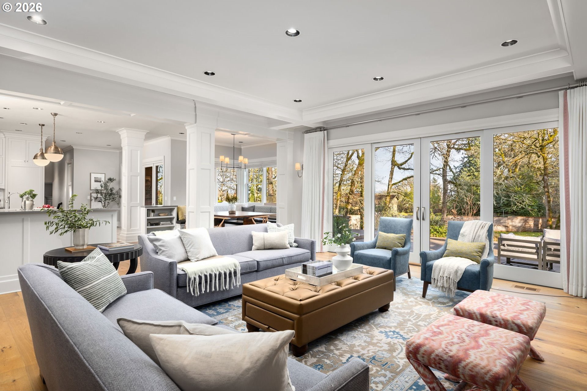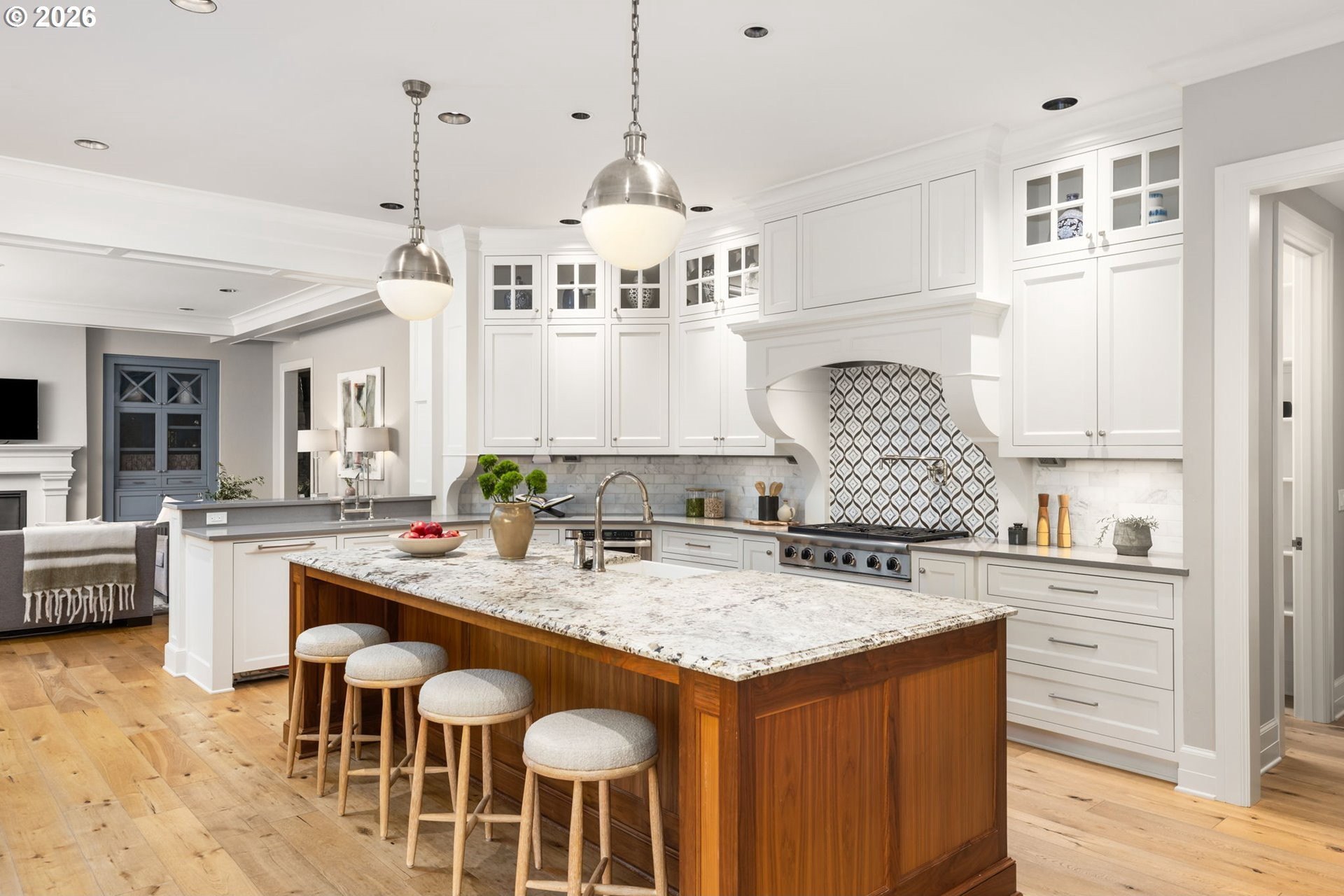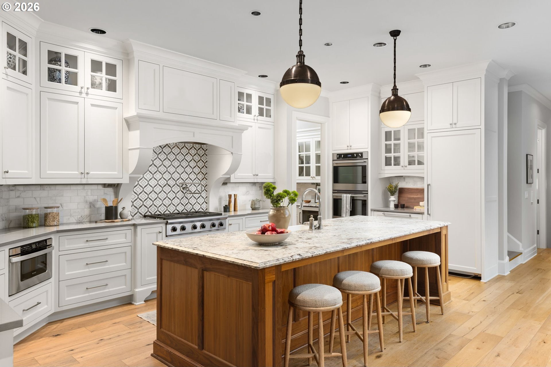 Custom-built and thoughtfully designed, this exceptional Dunthorpe residence offers refined luxury, generous scale, and effortless livability in one of Portland's most sought-after school districts.The chef's kitchen is the heart of the home, centered around a large island and designed for everyday living and entertaining. High-end appliances include a premium range, double ovens, double dishwashers, and double sinks, along with an oversized refrigerator and separate freezer drawers built into custom cabinetry, plus a dedicated beverage refrigerator. Thoughtful details such as a pot filler, pull-out storage, a beautifully detailed backsplash with discreet outlets, abundant cabinetry, a walk-in pantry, and a butler's pantry make this kitchen both functional and striking.The main level features hardwood floors, high ceilings, arched entry details, custom millwork, and multiple inviting living spaces, including a stunning library style office with custom built-in cabinetry and a fireplace. Living room doors open to a spacious hardscape patio with built-in seating and a large, fully fenced yard, ideal for entertaining or everyday enjoyment.All bedrooms feature en suite bathrooms, offering comfort and privacy throughout. The primary suite is a true retreat, highlighted by an oversized walk-in shower and spa-like finishes. Two additional half baths on the main level add convenience for guests.Distinctive spaces include a media room with an attached kids' playroom, a second office space, a breakfast nook with a custom wood table, two staircases, and two laundry areas, including an upstairs laundry and a lower-level laundry room with extensive storage and a refrigerator.Finished with wool carpeting, extensive custom built-ins, high-end trim work, and statement lighting throughout, this beautifully crafted home offers exceptional comfort, functionality, and location, just a short walk to Riverdale Grade School in the top-rated Riverdale School District.