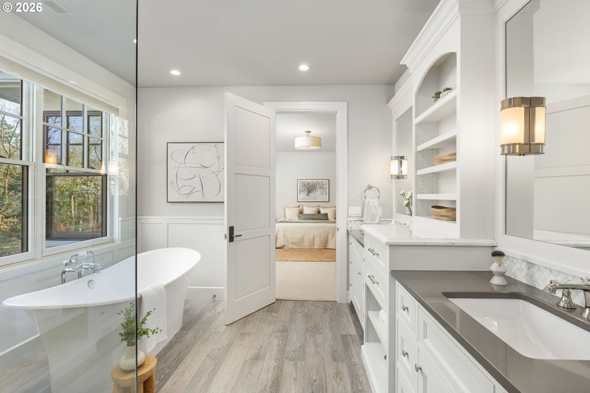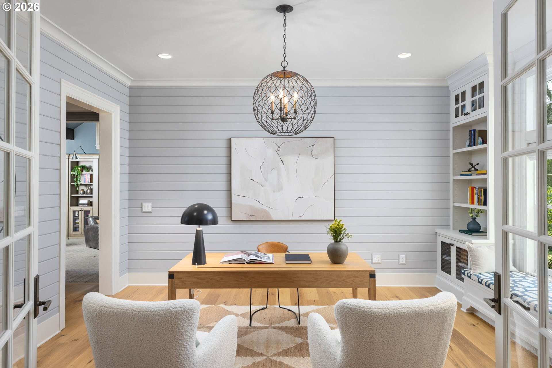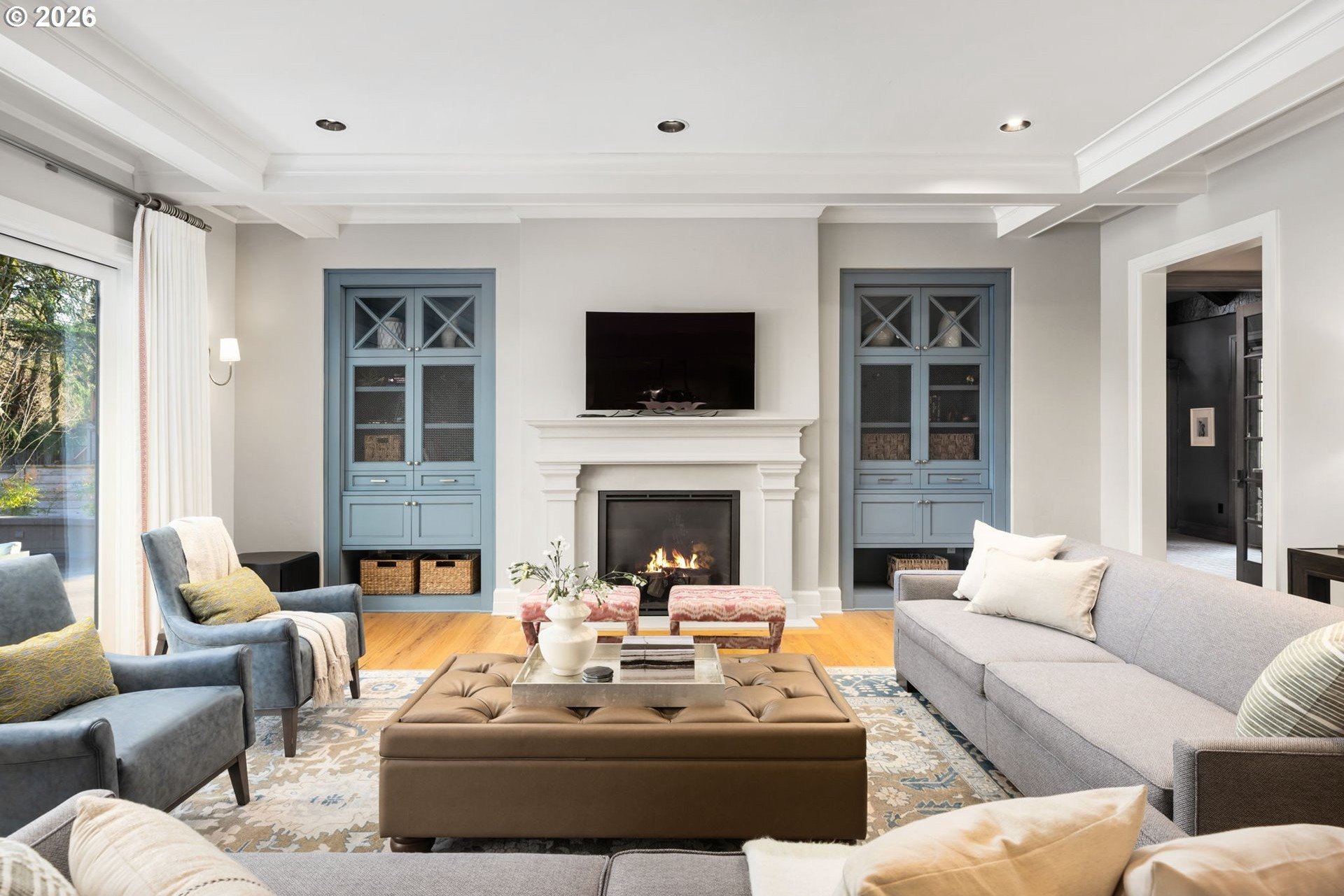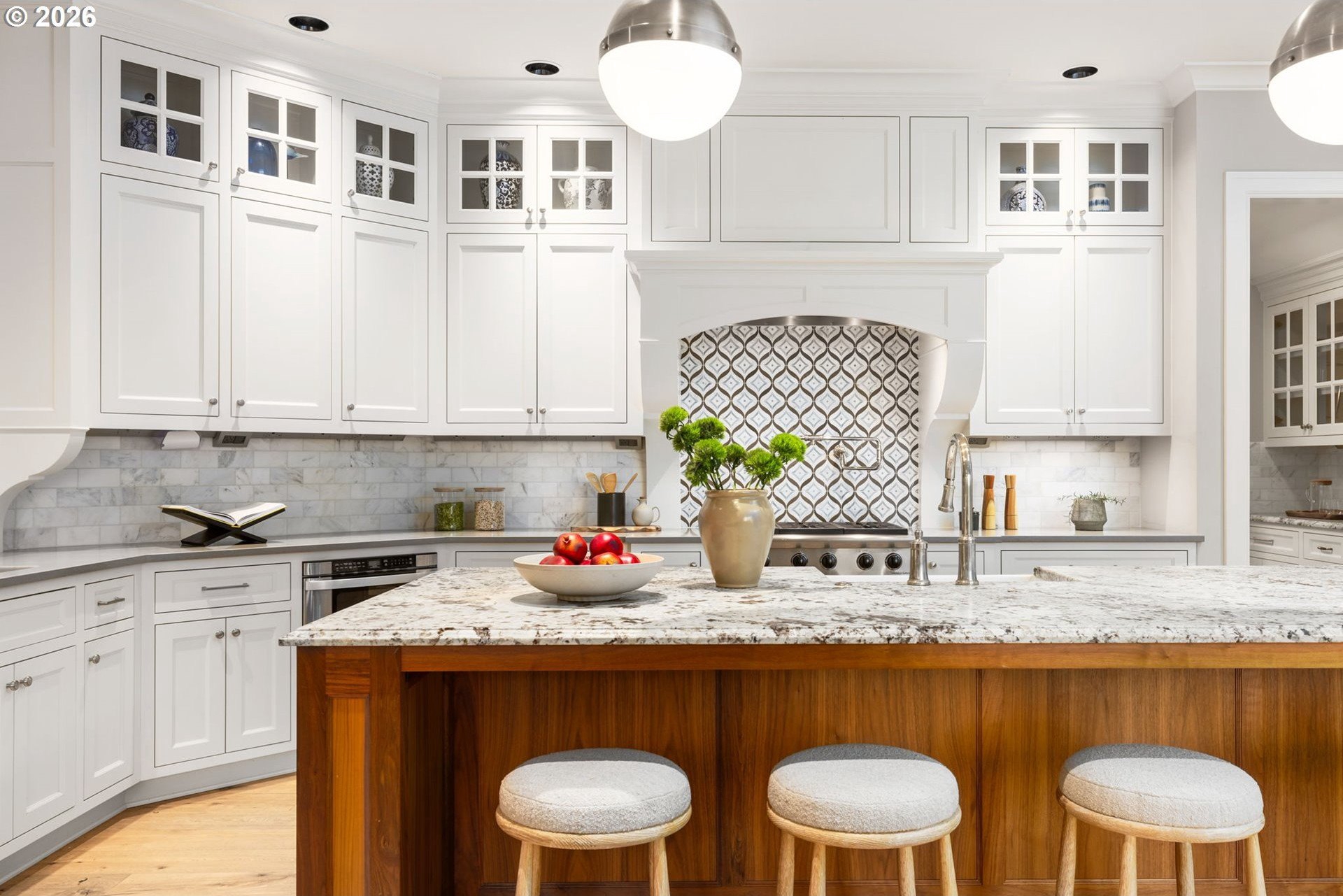 Custom-built and thoughtfully designed, this exceptional Dunthorpe residence offers refined luxury, generous scale, and effortless livability in one of Portland's most sought-after school districts.The chef's kitchen is the heart of the home, centered around a large island and designed for everyday living and entertaining. High-end appliances include a premium range, double ovens, double dishwashers, and double sinks, along with an oversized refrigerator and separate freezer drawers built into custom cabinetry, plus a dedicated beverage refrigerator. Thoughtful details such as a pot filler, pull-out storage, a beautifully detailed backsplash with discreet outlets, abundant cabinetry, a walk-in pantry, and a butler's pantry make this kitchen both functional and striking.The main level features hardwood floors, high ceilings, arched entry details, custom millwork, and multiple inviting living spaces, including a stunning library style office with custom built-in cabinetry and a fireplace. Living room doors open to a spacious hardscape patio with built-in seating and a large, fully fenced yard, ideal for entertaining or everyday enjoyment.All bedrooms feature en suite bathrooms, offering comfort and privacy throughout. The primary suite is a true retreat, highlighted by an oversized walk-in shower and spa-like finishes. Two additional half baths on the main level add convenience for guests.Distinctive spaces include a media room with an attached kids' playroom, a second office space, a breakfast nook with a custom wood table, two staircases, and two laundry areas, including an upstairs laundry and a lower-level laundry room with extensive storage and a refrigerator.Finished with wool carpeting, extensive custom built-ins, high-end trim work, and statement lighting throughout, this beautifully crafted home offers exceptional comfort, functionality, and location, just a short walk to Riverdale Grade School in the top-rated Riverdale School District.