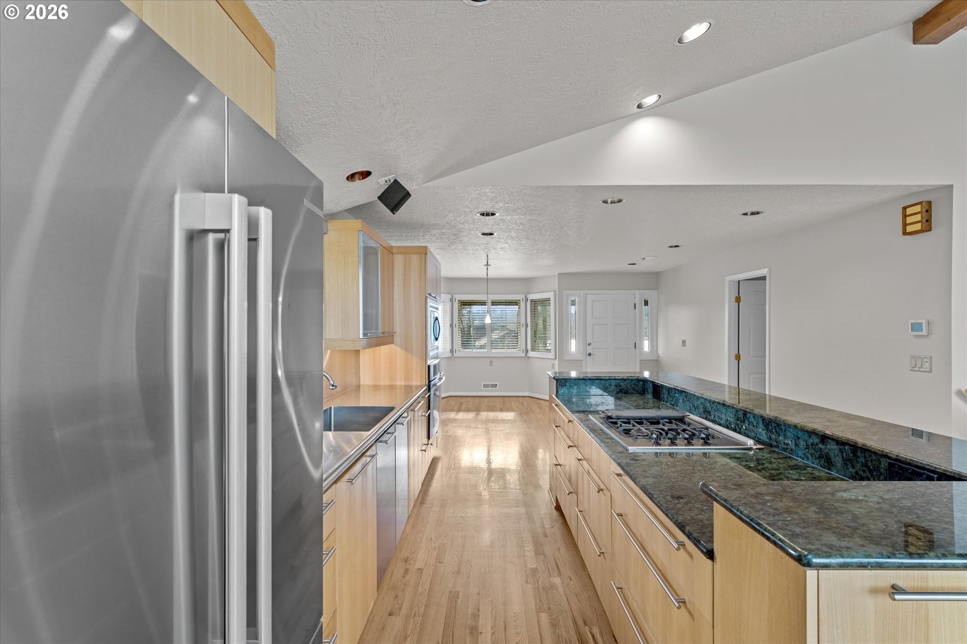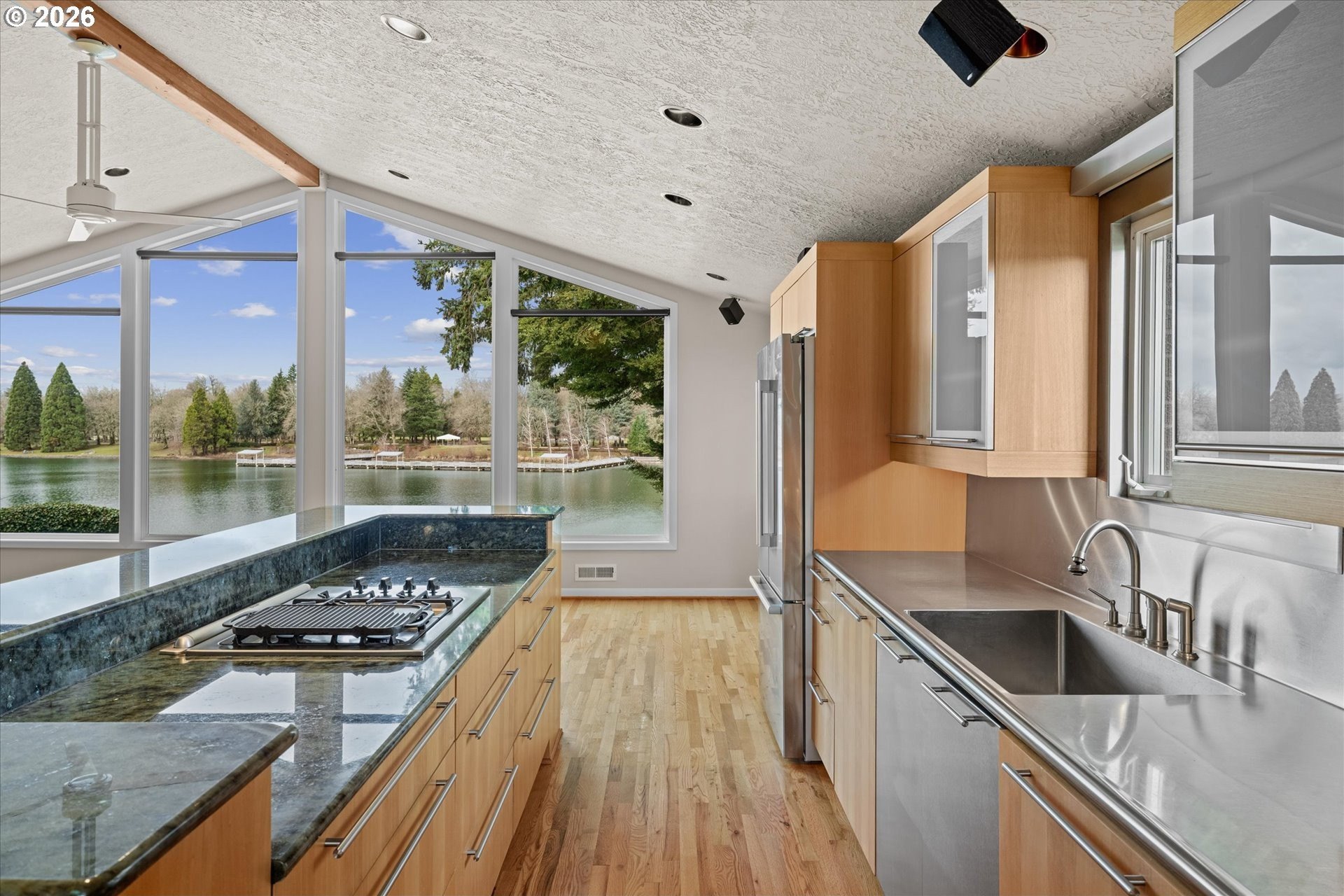 Absolutely stunning lakeside property that has been completely remodeled with so much to offer both inside and out. Located on Blue Lake, this home has a beautiful view from nearly every part of the house. Drink coffee on your back porch on a nice day, or inside on a rainy day and still experience absolutely gorgeous views! Inside you will love the soaring ceilings with huge windows looking towards the lake. The interior has now been completely repainted! The kitchen features an open floor plan with a cooking island, custom cabinets, gas appliances and hardwoods throughout. The home has two suites with bathrooms. The primary features an oversized room looking out onto the lake with beamed ceilings, a walk-in closet, updated bathroom with heated floors and a walk-in shower,quartz countertops, and access to the backyard. With two living spaces, the home has plenty of room for the family for entertaining. You will love the family room on the lower level with a wet bar, fireplace, and full access to the outdoor living area. Outside you will love the custom outdoor living space with outdoor kitchen and concrete throughout! Enjoy a small boat housefor all of your boating, swimming, and outdoor equipment. Down towards the lake, the updated dock allows for swimming andboating with a fully functional boat lift to keep your boat out of the elements! Living in the Blue Lake community has so much too offer, come take a look for yourself!