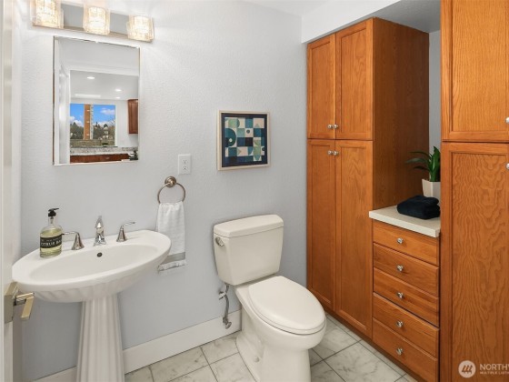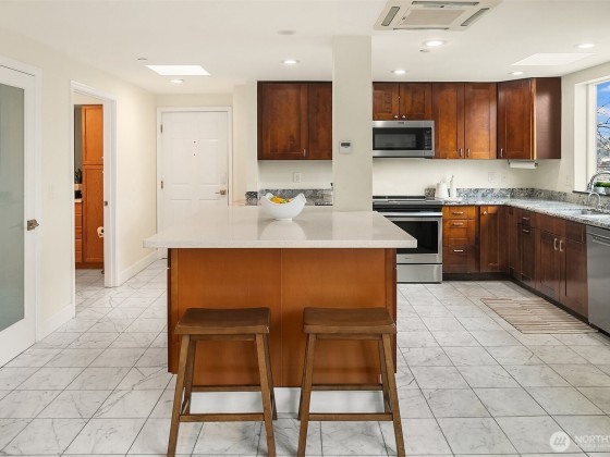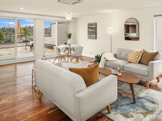 This top-floor, corner two-bedroom condo in Bradford Court Condominiums offers stunning Seattle skyline views and a sprawling rooftop deck, perfect for relaxing or entertaining. The large, beautifully updated kitchen is a highlight, with modern finishes and panoramic views of the city. Ideally located in West Seattle, it’s just minutes from Alki Beach, coffee shops, restaurants, shopping, and parks. With easy freeway access, this condo combines the best of city living with a peaceful retreat. Enjoy the vibrant neighborhood and breathtaking views from your own private sanctuary. Two secured parking spaces in the garage and two storage areas are included. One with an additional 3/4 bath could be an office, artist studio, exercise room, etc.
