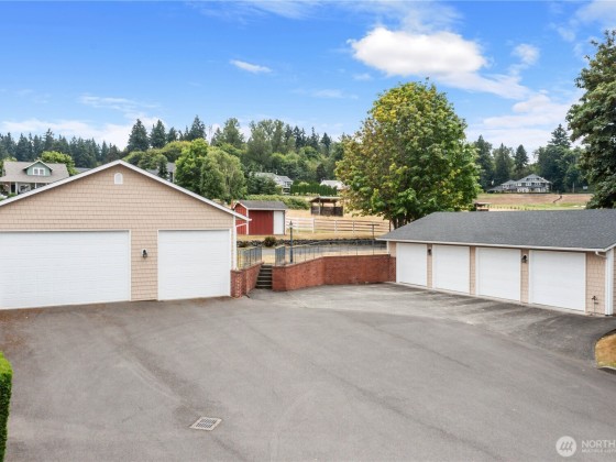 Incredible opportunity for rare combo of huge 4,242 sq ft updated home set up for gatherings both inside & outside w/1500+ sq ft deck & covered barbeque + gazebo. Car enthusiast dream w/2 car garage, detached 3 car & heated 4 car & 10 car garages. Covered riding 60' X 120' arena w/4 stalls & 6 stall barn w/ hay storage up in both & tractor storage bldg too. Pristine upgraded home inside & out w/beautiful island kitchen & custom cabinets, built in cabinets in dining room/office/upstairs landing/mud room/utility room, dual heat pumps, downstairs kitchenette ++, 40 yr roof, Hardie plank siding & sculptured landscaping. Appraised @ $2.2M. *Combine with MLS# 2407343 w/11.6 acres for horse grazing/rental house &/or future development options*