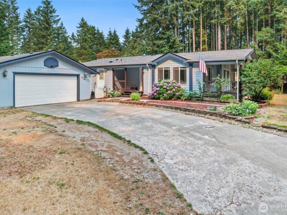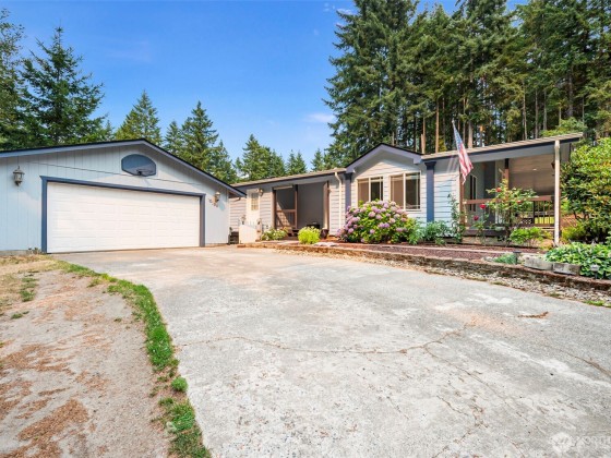 Beautifully maintained triple-wide with vaulted ceilings, skylights, and an open, light-filled layout. The spacious primary suite offers double-door entry, walk-in closet, and full bath. Family room opens to a large two-sided deck, partially covered for year-round enjoyment. Recent upgrades include a newer roof (1–2 yrs), brand-new heater & central A/C, and water purification system by kitchen sink. Two RV plugs add convenience, while mature landscaping, two sheds, and wooded acreage create privacy and wildlife views. All appliances stay, including an extra fridge in the garage. Move-in ready with comfort, utility, and a peaceful retreat feel. Minutes to shopping, schools, parks, and Hwy 16.