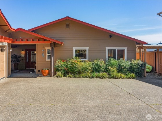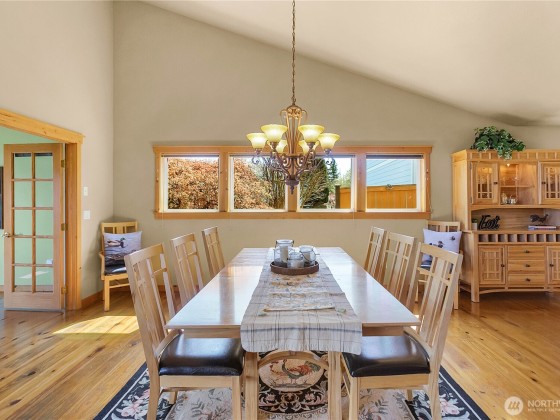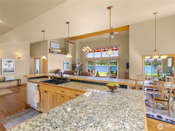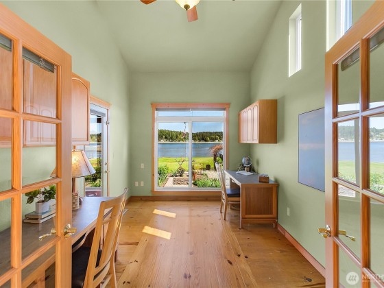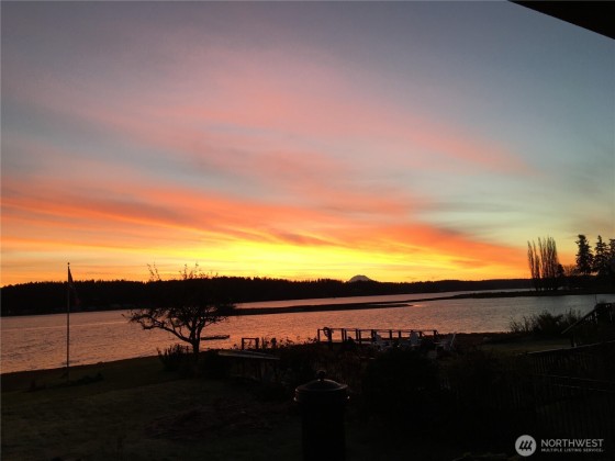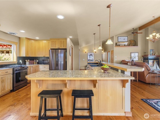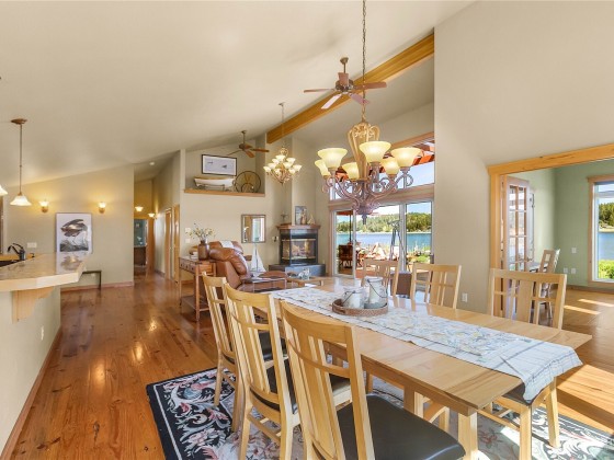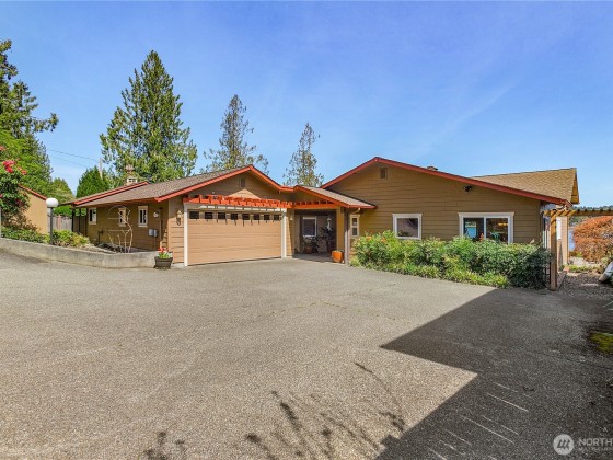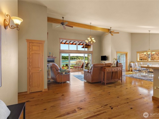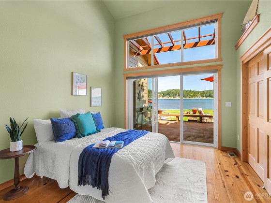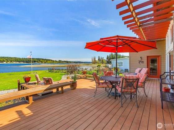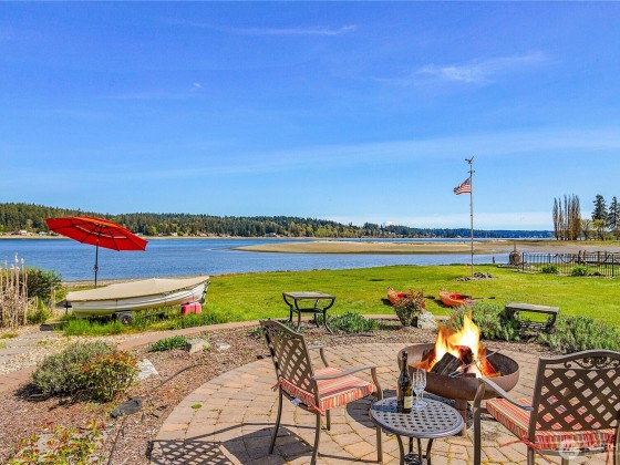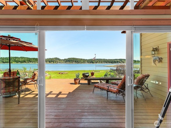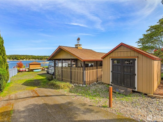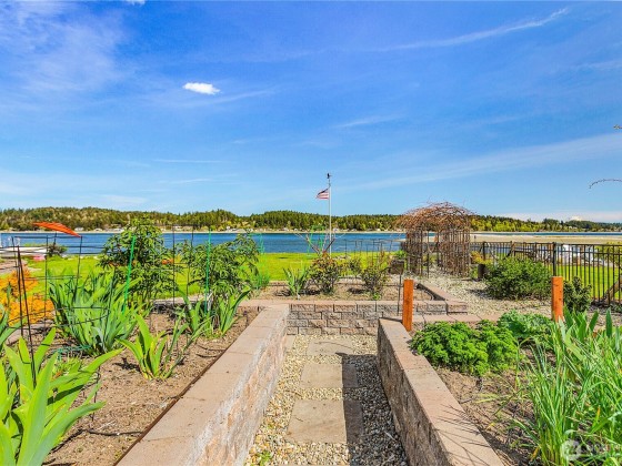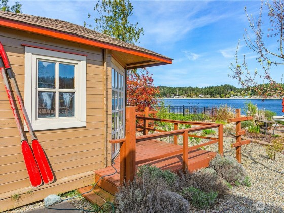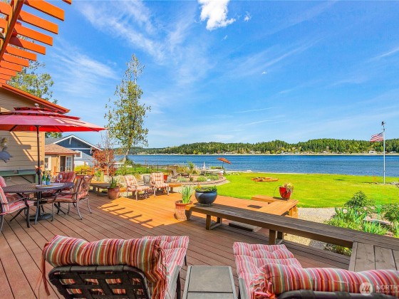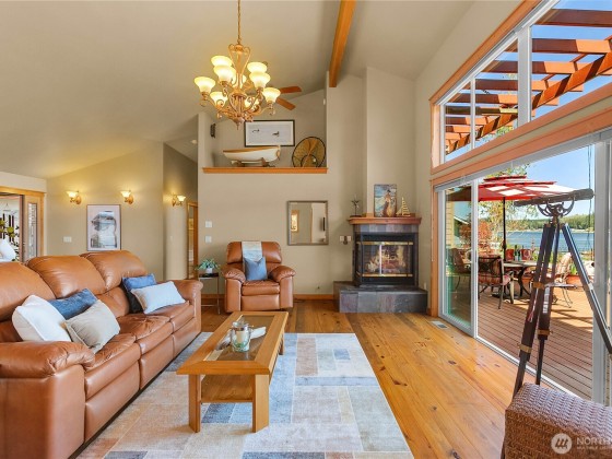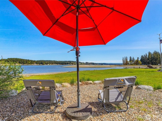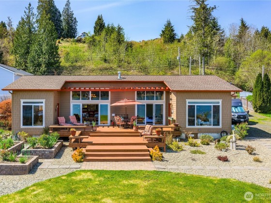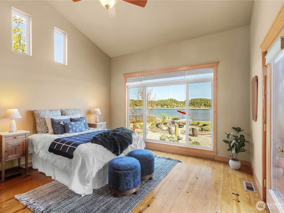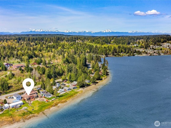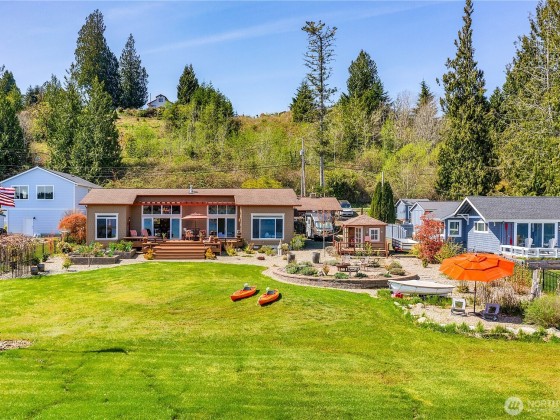 Set along 100 feet of warm, shallow, no-bank waterfront on North Bay, this retreat blends natural beauty with comfort and style. This single-level home features soaring ceilings, hand-finished Northern Pine floors, and walls of windows framing breathtaking views. The chef’s kitchen offers hickory cabinets, ubatuba granite tile, and new appliances. Bathrooms include modern sinks, a soaking tub, and heated towel rack. Enjoy a cozy fireplace, heat pump, and the ease of a private well. With trex decks, raised garden beds, fruit trees, berry bushes, RV hookup, and cabana—wake up to wildlife, spend the day on the water, and end with a fire under the stars. The perfect PNW lifestyle.