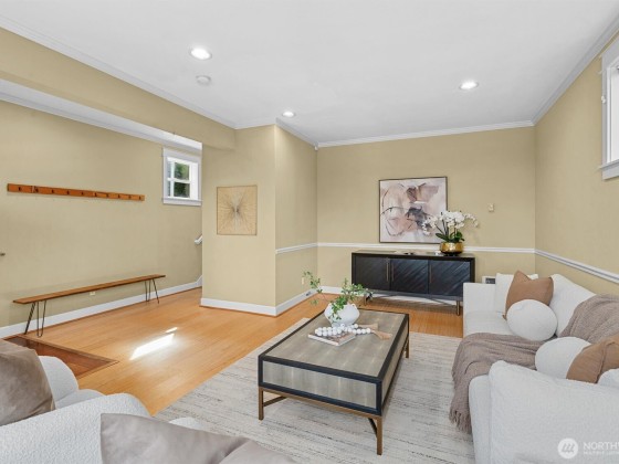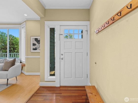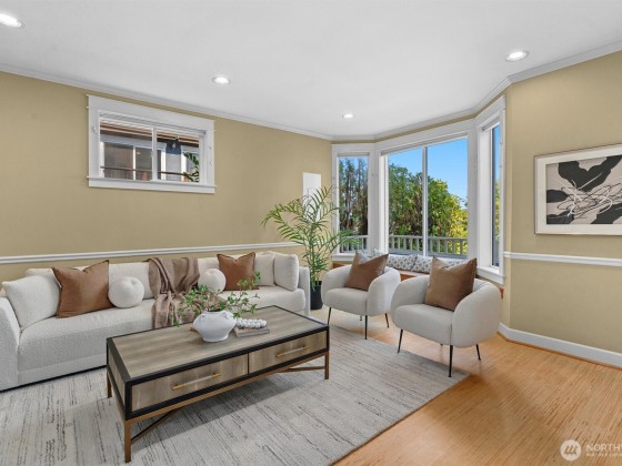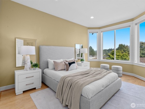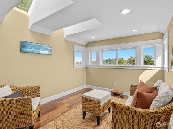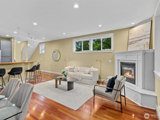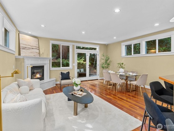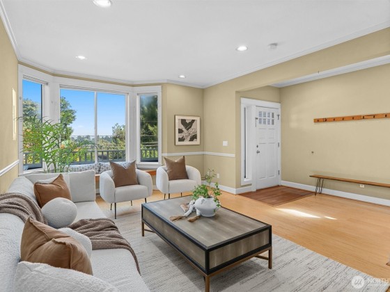 This central Arboretum/Madison home sits stately above the street allowing full privacy while maximizing city & mountain views. Specially designed floorplan allows multiple living & flex spaces, featuring an entry family room with a charming bench seat bay window flowing upstairs to a main level living space anchored by a gas fp, open kitchen & french doors leading to a private terraced patio. Full floor primary suite with walk in closet & generous en-suite bath. Top floor features 3 more bedrooms & a unique crow's nest bonus room/office. Energy efficient upgrades include heat pump with A/C, tankless on demand w/h, 4.42kW Solar & metal roof. Detached 1 car gar. Blocks to Arboretum, shops, eateries & transit including new RapidRide G line.