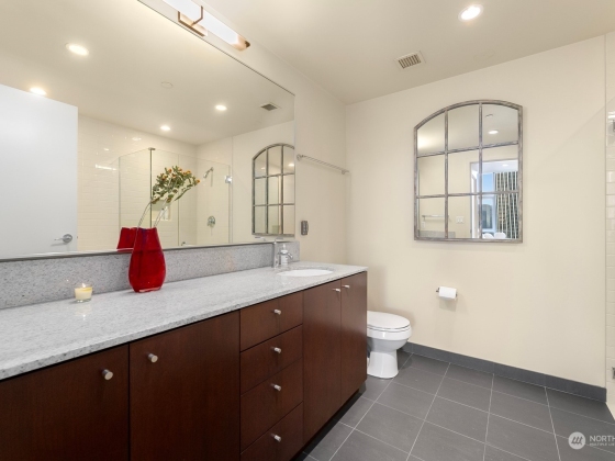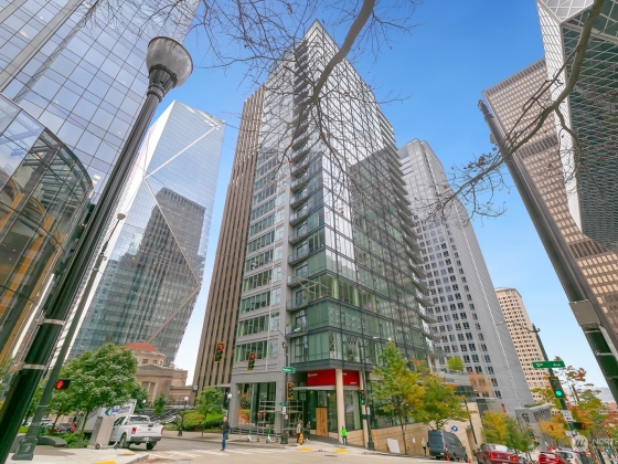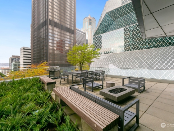 North facing unit is perfect for enjoying city living. Light and bright with an open floor plan, This Unit offers one bedroom plus den a full bathroom and a powder room. Spacious and inviting, it has top end features including 10.5 ft ceilings, wide-plank floors, floor to ceiling windows, kitchen island, slab granite and stainless appliances. Building amenities include 24/7 concierge, guest suite, garden terrace, fitness center and club room. Walking distance to all the Downtown Seattle has to offer.