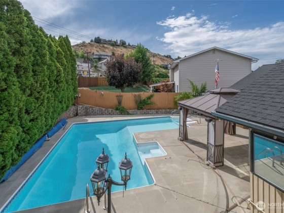 Luxury Living with Saltwater Pool. Plus heated floors ,Gazebo, Main floor primary bedroom ,with walkins. Over 2,000 sq. ft. home featuring a main-floor primary suite with huge walk-in closet and spa-like bath with heated floors, large shower, and soaking tub. Kitchen offers tile floors, gas range, recessed lighting, breakfast bar, and dining area with heated floors. Upstairs has two bedrooms, full bath, and access to a private deck with putting green. Enjoy outdoor living with a saltwater pool, covered patio, and gazebo. New roof in 2016, A/C, high-speed internet, and 2-car garage complete this stunning property!