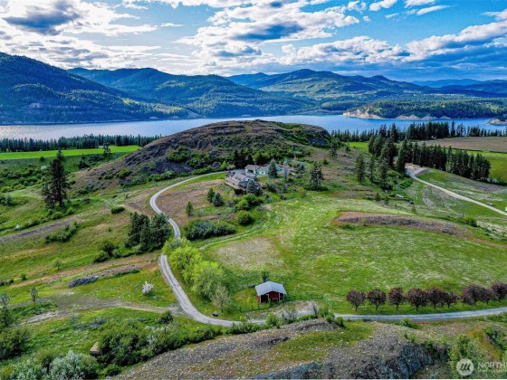 Tremendous opportunity to own a 29-acre property w/unmatched view of Lake Roosevelt just a mile from the Hunters Campground public boat launch. Return from your day on the lake to your 2962 sq. ft. home w/the primary bedroom w/ensuite on the main floor. Entertain friends in the large kitchen & enjoy meals on the 1800 sq. ft. arbor covered deck w/built in BBQ. Other features include laundry on the main, living room w/access to the wrap around deck & a half bath. Upstairs has a loft, 3 bedrooms & ¾ bath. The separate ADU has beautiful, engineered wood floors, 9 ft. ceilings in main living area & 14 ft. ceilings in bedroom, mini split, & propane stove in kitchen. Property has fenced garden area, fruit trees, grapes + 4 fully fenced pastures.