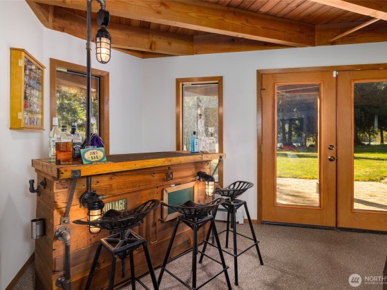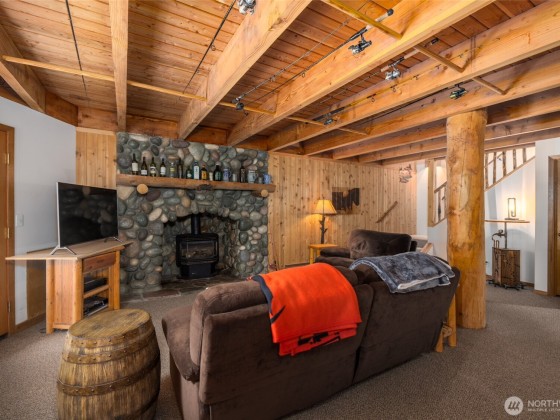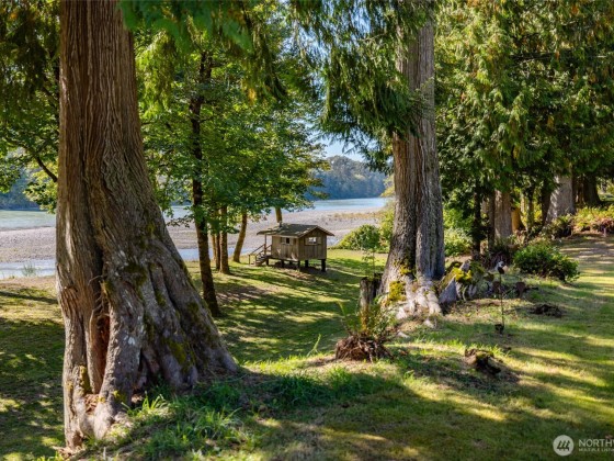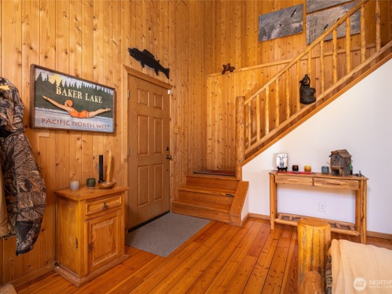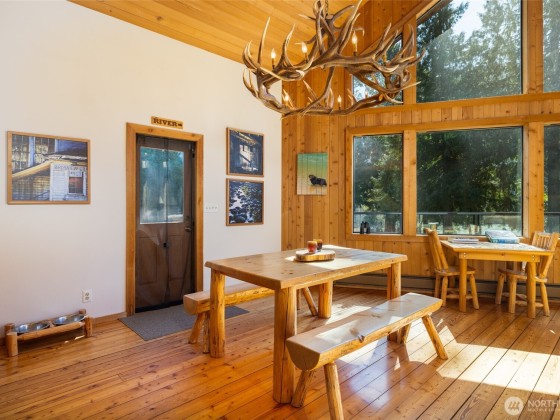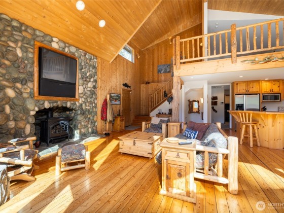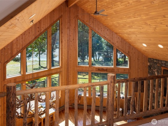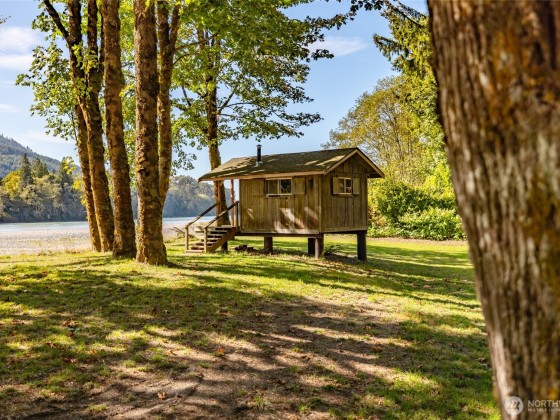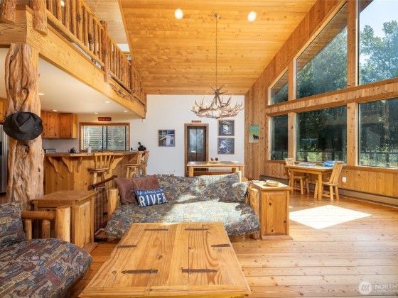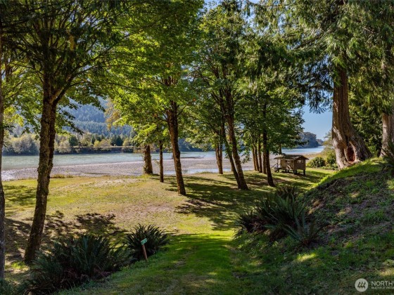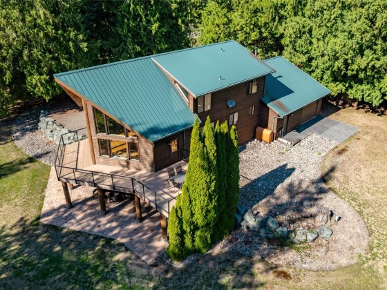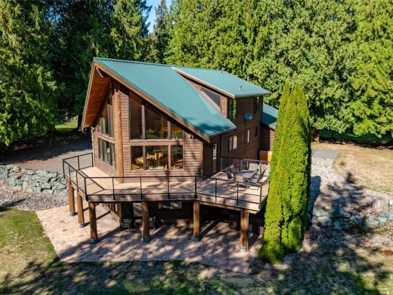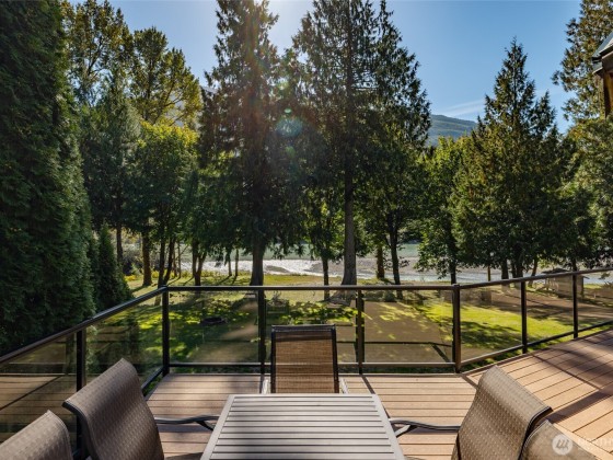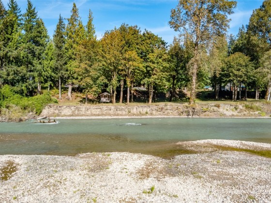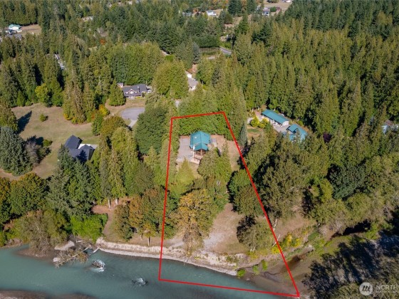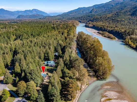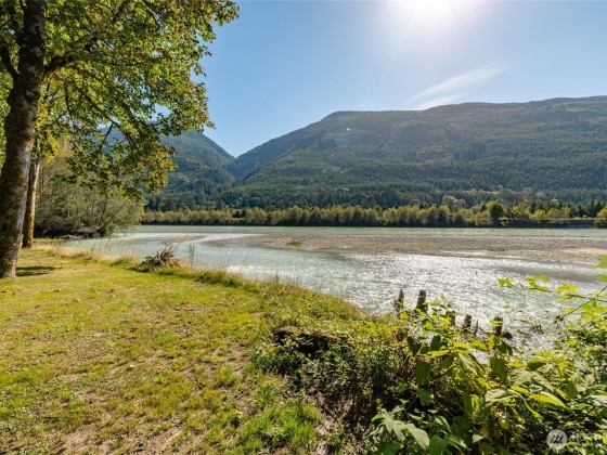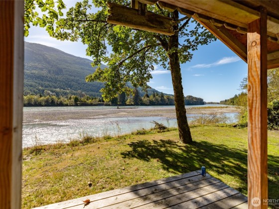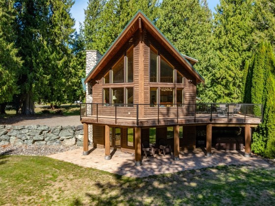 Rustic, log-accented custom residence on just shy of 2 acres of prime riverfront. Set in an upscale enclave w/other high-end homes, this dramatic 4000+SF home rests on park-like grounds w mature trees, private setting, grassy terraced land w/lots of room to play & relax. The vaulted great room, open kitchen w/eating bar, huge view deck, upper level primary suite w/views & a cozy finished basement are warm & inviting. Log posts, steps & railings, T&G ceiling, hardwood flooring, river rock fireplaces, fly-tying table, wine cellar, hot tub & more. Fish from your own property, check out the 'fishing cabin' on the lower level by the river. Make this amazing home your own & enjoy eagle-watching, sunsets & the ever-changing beautiful Skagit River.