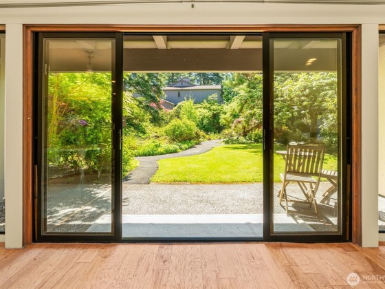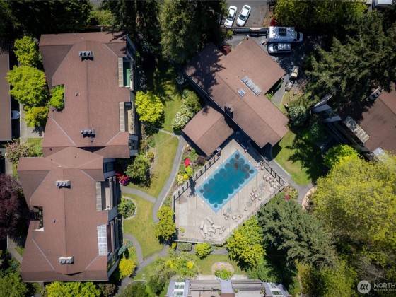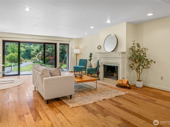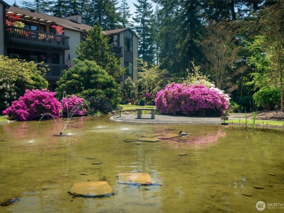 Gorgeous. Peaceful. Serene. Those are the words that come to mind when you walk into this lovely, spacious, home nestled in 6 acres of lush gardens. Your patio overlooks a reflection pond and bubbling brook. Step through a wall of windows onto your four seasons deck. This home features a great room fit for a grand piano! Floor to ceiling windows, plus a wood burning fireplace, wine fridge, huge walk in closet make this a place you'll never want to leave. TWO deeded parking spaces! Noble Firs clubhouse has a sauna, library, billiards room, pool, kitchen, space for events, a well-run HOA with full-time onsite maintenance/manager, secure gated entry, and easy commute to shopping, restaurants and light rail. Come see your dream home!