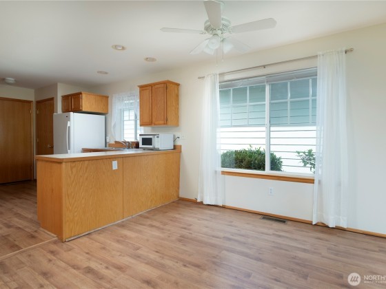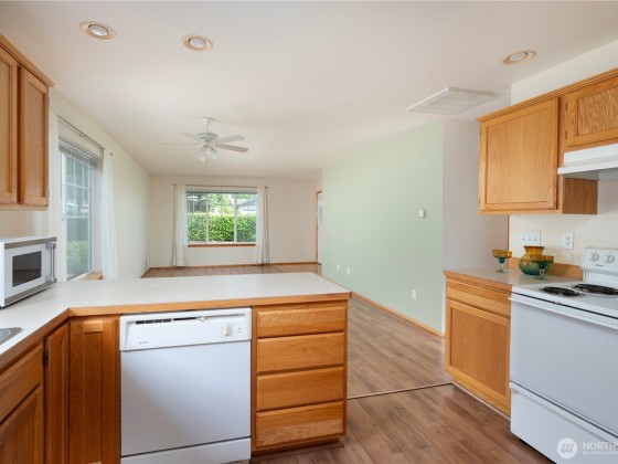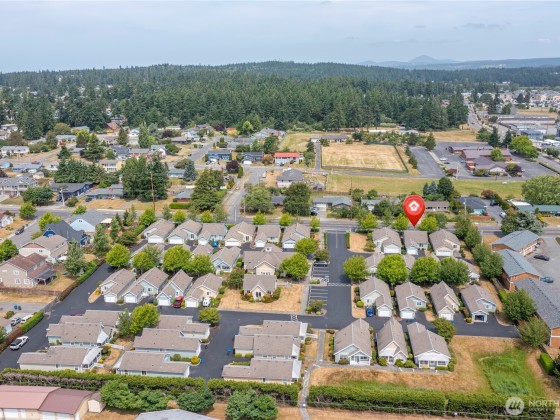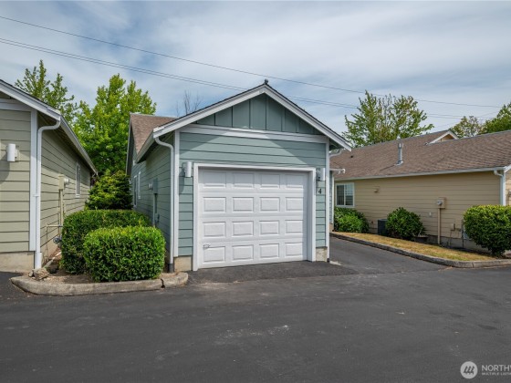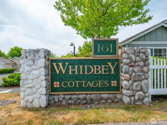 Welcome to this delightful single-story craftsman home, nestled in the highly sought-after 55+ Whidbey Cottages community. This move-in-ready home offers 928 ± sq ft of thoughtfully designed living space flooded with natural light, a welcoming covered front porch, and two bedrooms, each attached to their own bathroom. Great room design with endless windows. Kitchen designed for saving steps, with the benefit of two pantries. This leads to a conveniently located utility/laundry area and onto a finished one car garage with storage possibilities and designated parking space. This community also offers you a wonderful clubhouse and multi-purpose room. Sell your lawn mower and enjoy the good life! Close to services, shopping and transit line.