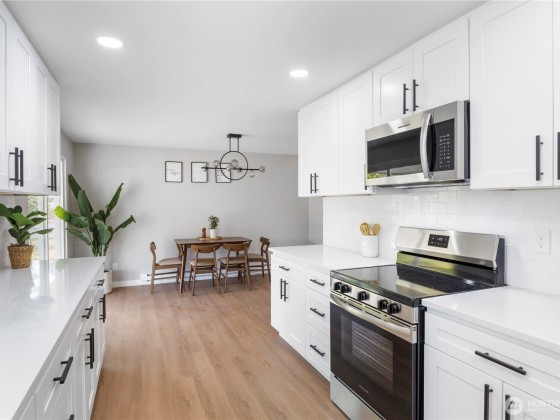 Welcome to this beautifully updated 3-bedroom, 1.5-bath home featuring an open floor plan with a spacious living room perfect for relaxing or entertaining. A formal dining area flows seamlessly to the kitchen and oversized patio, creating an inviting space for gatherings. The kitchen shines with shaker-style cabinets, quartz countertops, and stainless steel appliances. Durable waterproof flooring runs throughout, while the primary bedroom offers a serene retreat with a private en-suite bath. Outside, enjoy a fully fenced backyard ideal for pets or play, plus ample parking with RV space. Conveniently located near shopping, Hwy 512, and I-5, this move-in-ready gem is waiting for you!