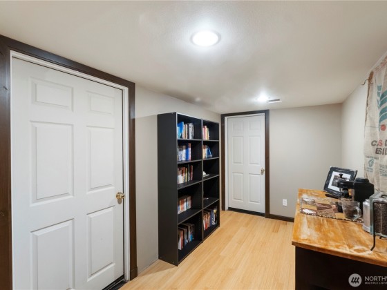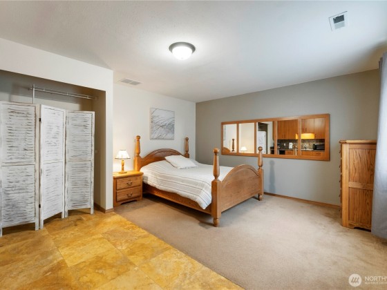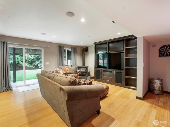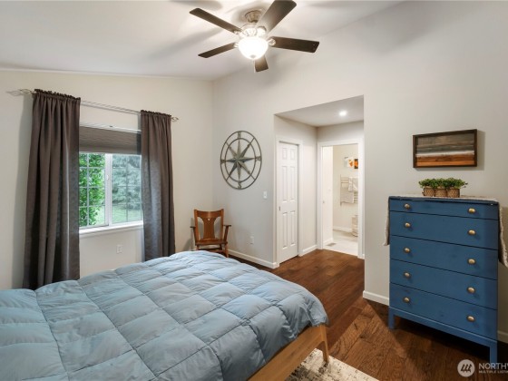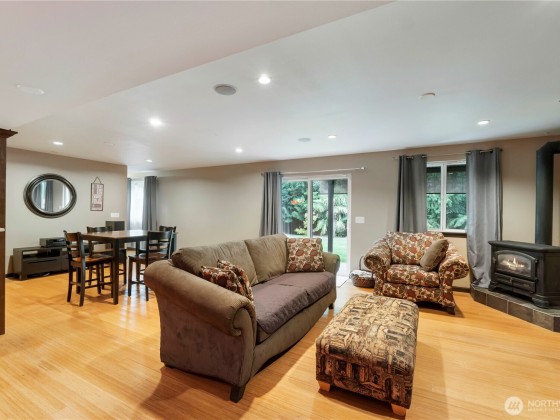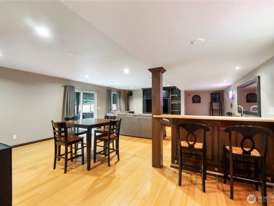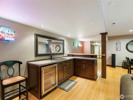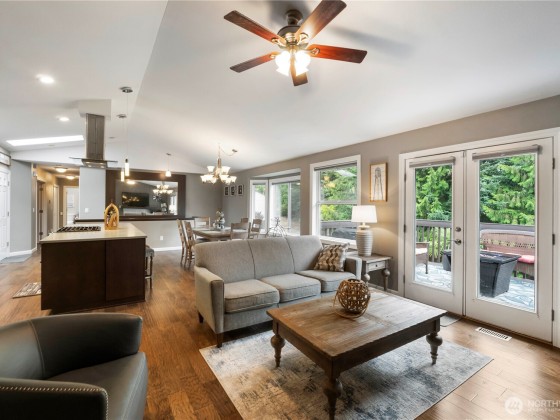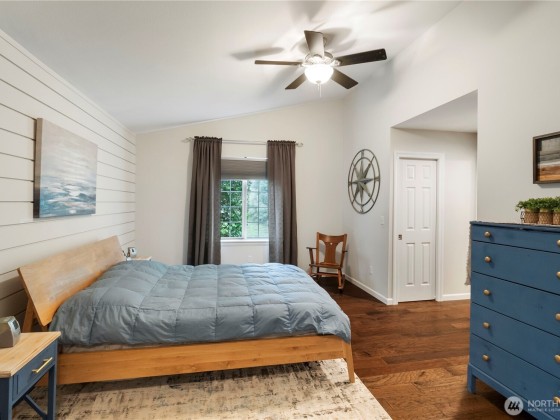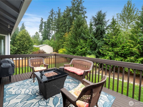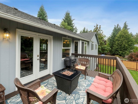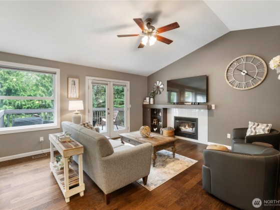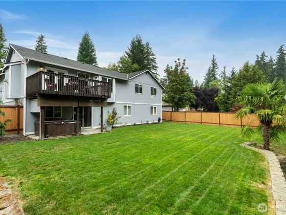 Maintained w/Tender, Loving, Care. This 2672 Sq Ft Day-light basement RAMBLER on a 1/4 Ac lot 4Br/2.75BA has it all! Primary on the main, Shiplap decor, walk-in Closet, Towel warmer, under counter motion sensor. Entertain in your Chefs Kitchen, Vaulted Ceilings, Quartz countertops, Custom Cabinets w soft close throughout, Engineered Hardwoods, Skylight & gas fireplace. French doors lead to a Freshly painted deck. Jr Kitchenet Suite below w/large bedroom. Wet Bar, Wine Fridge, cement Countertops, In-ceiling speakers and all electronics stay in the built in wall unit. Step out to the patio and take a dip in your Hot Tub AND watch TV! Roof, 2019, Furnace/AC/ H/W tank 2021. Garden space, sprinklers f/b. No HOA, RV, walk to Lake Bonney Lake.