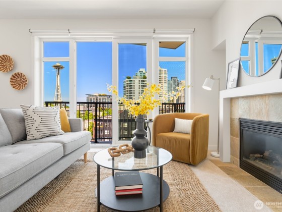 Experience elevated city living in this chic 11th-floor condo, perfectly positioned in Belltown, where Pike Place Market is your grocer, and the newly renovated Seattle waterfront is your yard! Enjoy modern elegance and fresh updates to this light and airy space with wide windows, balcony, stylish finishes, and iconic Space Needle views. The spacious well designed layout includes an additional office/flex space, full laundry room, gas fireplace, and walk-in closet. Luxury building offers 24/7 concierge, fitness center, rooftop deck, guest suites, secure parking w EV chargers and car wash station. Amazing shopping, dining, nightlife and culture, just outside your door!