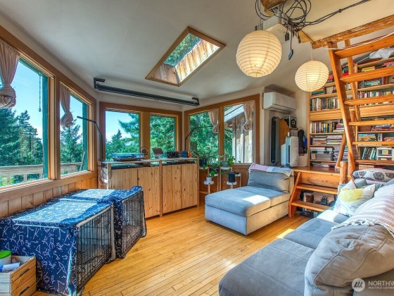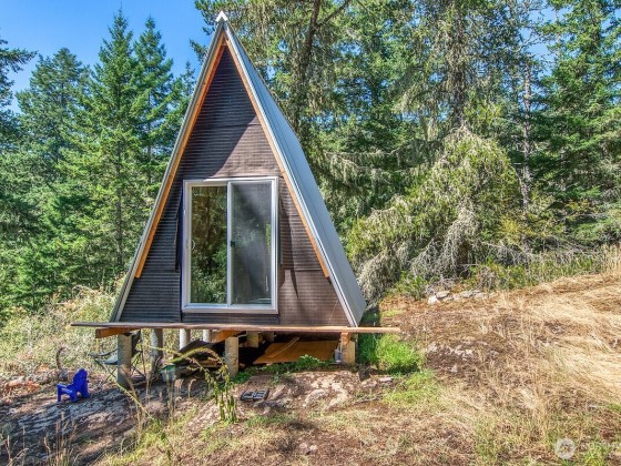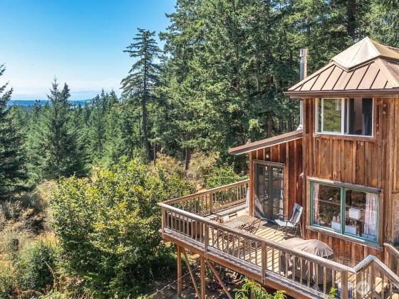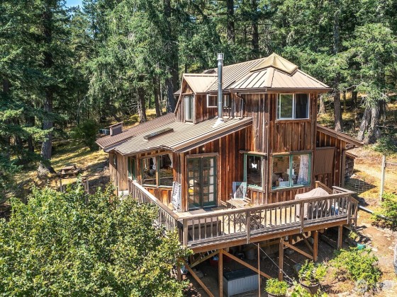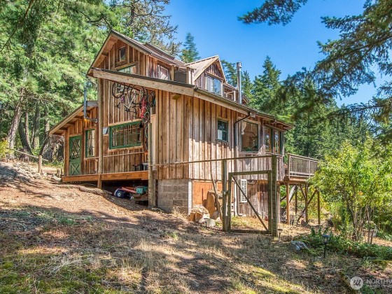 Ten acres & two parcels at the end of Hurricane Hill Rd near the amenities of the Orcas Village/Ferry & Killebrew Lake. Sunny location for rustic 2 story 2/bdrm home w/views of Olympic Mountains & distant islands. French doors lead to a deck overlooking the fenced garden, open kitchen w/ induction range, wood floors, sky lights, new heat pump/mini split. Bathroom w/sink & shower. Composting toilet & gray water system. Two new outbuildings can be offices, guest or studio space. Campsite cleared in a serene grove for overflow guests. Parcels adjoin SJ County Land Bank properties on the north & west sides. Well has approx 144 gal/day, 350 gal storage tank, UV and ultra sub micron filters. Seller was able to obtain conventional financing.