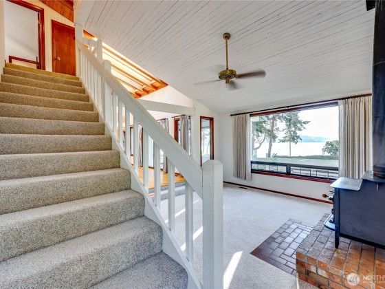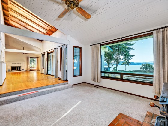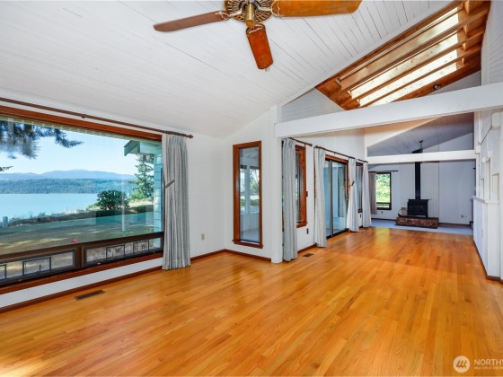 Imagine a view so stunning, it looks like you can reach out & touch the mountains and water. This gorgeous home sits on 1/2+ acres, with irrigated flower beds and mature trees. Solid hardwood floors, a fireplace, and a wood-burning stove are part of this well-built custom house, and the primary bathroom has wonderful natural light from the large wrap-around glass block window. There are breathtaking views from the entire South side of this home and beach access just a quick stroll away. A large 2-car garage and a storage shed keep your driveway open for guests or even an RV. Fresh air and beauty right outside your door will feel like paradise. You'll see it and realize why the homeowners held onto this gem for the past 40+ years.