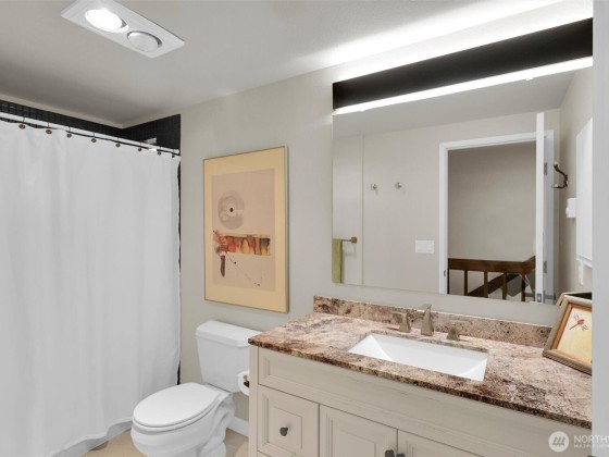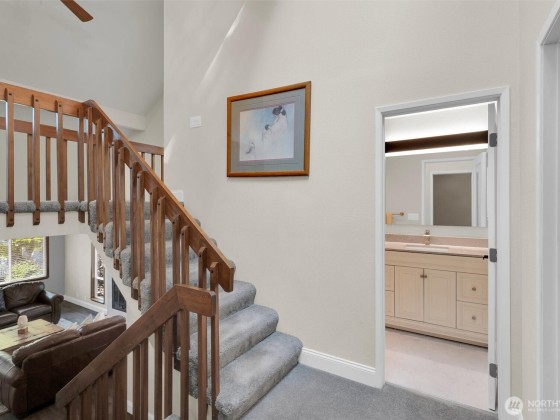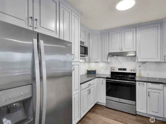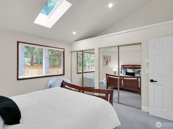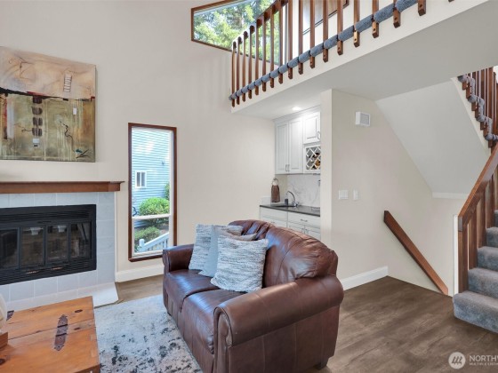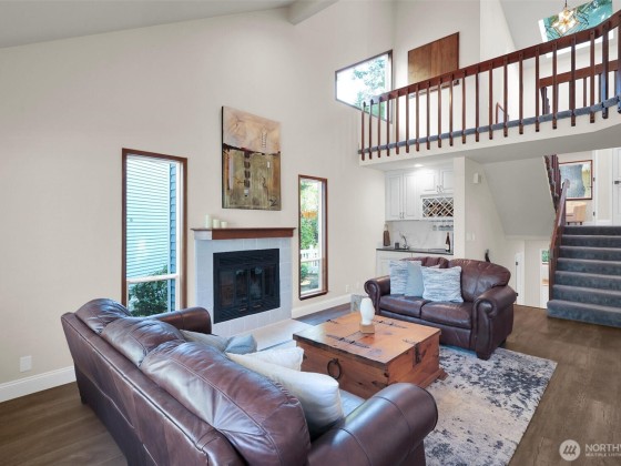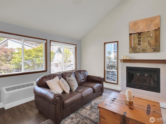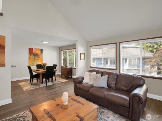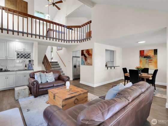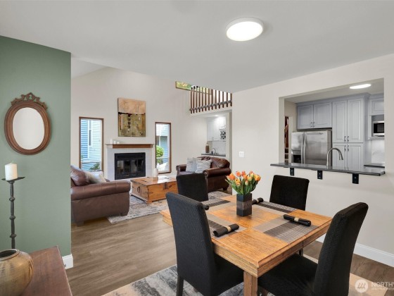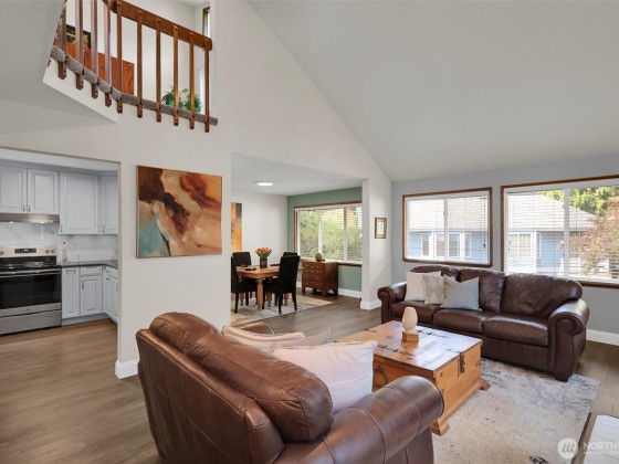 Beautifully remodeled end-unit townhome in Cobblestone with cathedral ceilings, skylights, and walls of windows that fill the home with light. Enjoy a brand-new spa-inspired primary bath (June 2025), remodeled kitchen with quartz counters & stainless appliances, plus two balconies and a private patio. Attached 2-car garage with storage. Pre-inspected, move-in ready, and close to I-405, Juanita Village, waterfront parks, Totem Lake, dining & shopping.