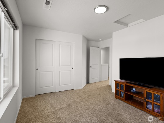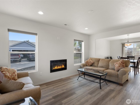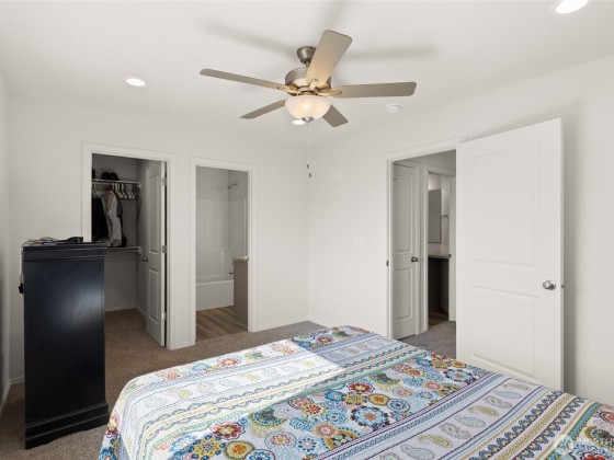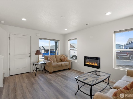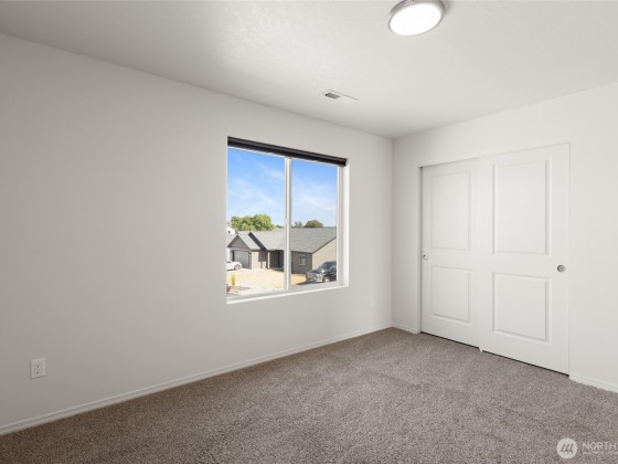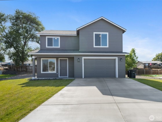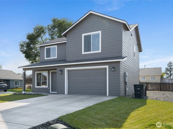 This spacious 4-bedroom, 2.5-bathroom residence offers a warm and functional layout perfect for modern living. Step into the open-concept living and dining area—ideal for entertaining or big gatherings. The kitchen features durable luxury vinyl plank (LVP) flooring, solid wood soft-close cabinets for ample storage, and low-maintenance laminate countertops. The primary bedroom includes a generous walk-in closet, providing plenty of storage space. Enjoy plush, high-quality carpeting with 8 lb padding in all living spaces, ensuring comfort throughout the home. Outside, you'll find a two-car attached garage, full lap siding, front yard sod, and an automatic sprinkler system already in place—offering great curb appeal and convenience.