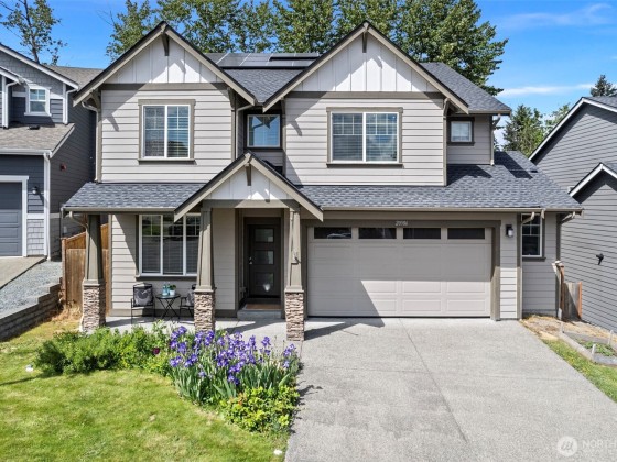 What's special & unique about this home? SOLAR PANELS! A VIEW OF MT RAINIER! A DOUBLE WIDE FRIDGE/FREEZER! INTERNAL FIRE SPRIKLER SYSTEM! TANKLESS HOT WATER HEATER! Plus, spacious 4 bedrooms, 3 baths, an open-concept kitchen, living, and dining area with a large island, walk-in pantry, and oversized commercial refrigerator. Perfect for entertaining! The main floor includes an office, while the upstairs primary suite offers vaulted ceilings, a large bath and huge walk-in closet! Enjoy outdoor living with a covered back patio featuring a gas fireplace and low-maintenance yard with wooded views. Conveniently located just minutes from Shopping/Dining in Bonney Lake and an easy commute to Lake Tapps!