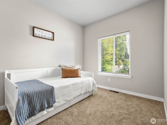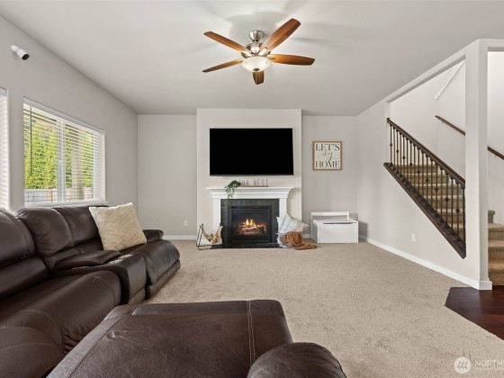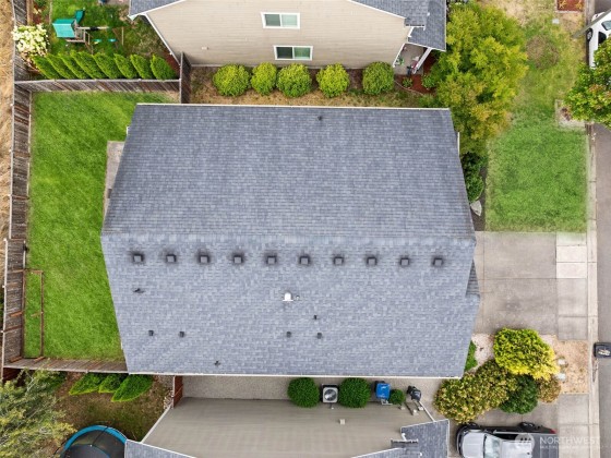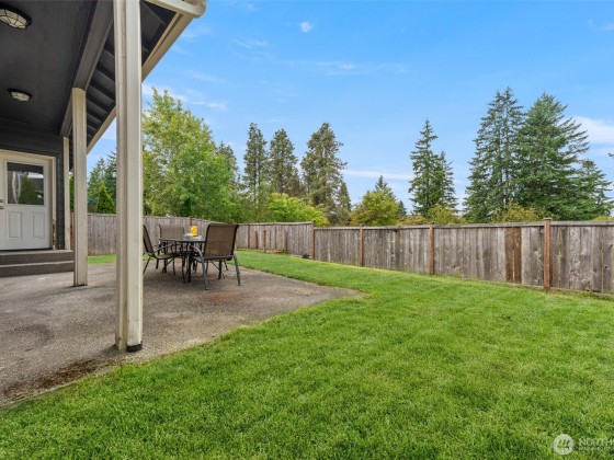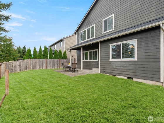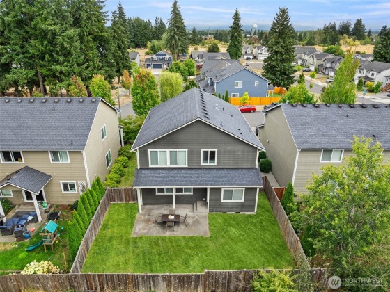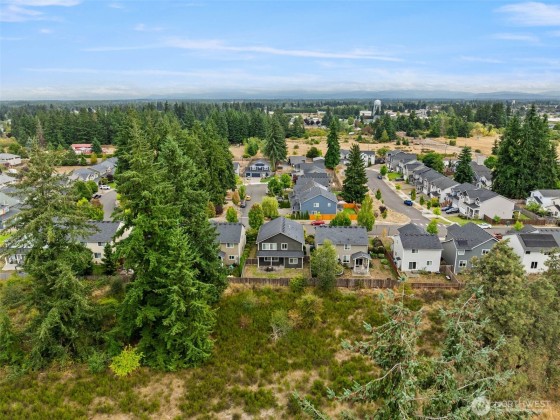 Welcome home to an inviting retreat perfect for both comfort (AC!) and entertaining! The open floor plan features a spacious island with eating bar, walk-in pantry, and SS appliances with a natural gas range for the home chef. A main-floor office/4th bedroom adds flexibility, while the upstairs primary suite offers dual closets, a spa-like 5-piece bath, and sweeping views. Enjoy privacy with no back neighbors! The fenced backyard with partially covered patio and the charming front porch make outdoor living easy. With a community park across the street and quick access to JBLM, Yelm, and Olympia, this home checks every box!