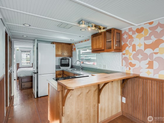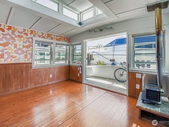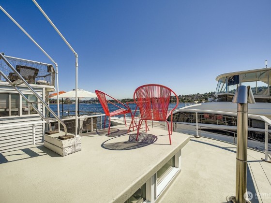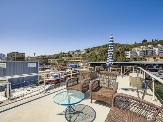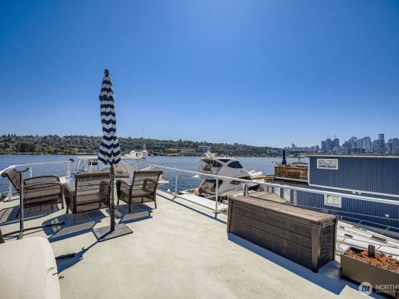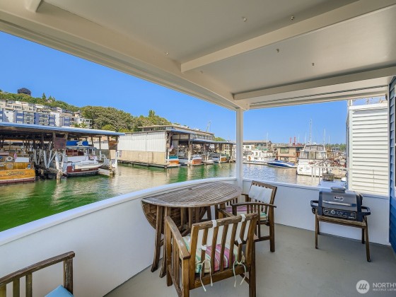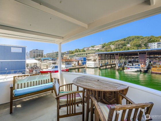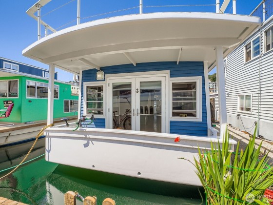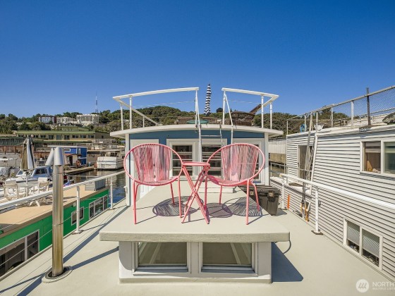 Seattle houseboat with panoramic, spacious rooftop deck, open water views, and two covered main-level decks. Enjoy vaulted ceilings, walls of windows, a full kitchen with a breakfast bar, a built-in queen bed, a full bath, and onboard laundry. The upper bonus room is ideal for entertaining, an office, or a guest space. Watch fireworks, Duck Dodge, water planes, and sunrises over Lake Union. Pets and rentals OK. The slip lease is $1,758/mo- includes moorage, dock insurance, DNR, facility fees, and liveaboard status. Financing available. Moments to Amazon, Google, Adobe, and top local fun, fine dining. Paddleboard, kayak, or relax in a private floating retreat—live the lake lifestyle! Hauled out August 2023. NO Short-term rentals.