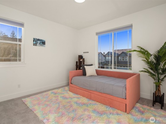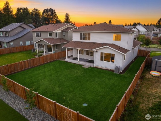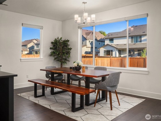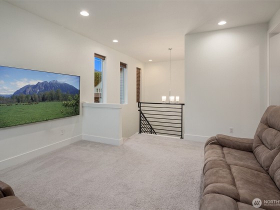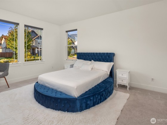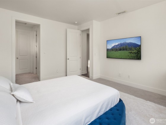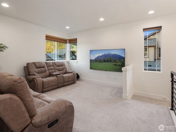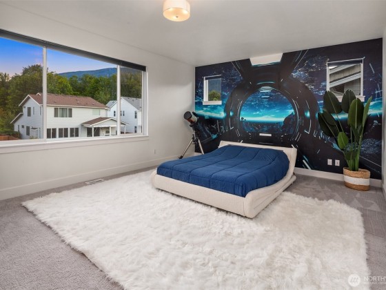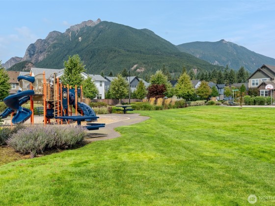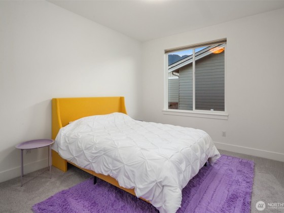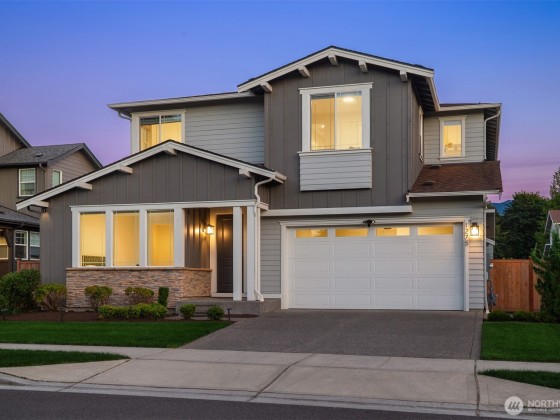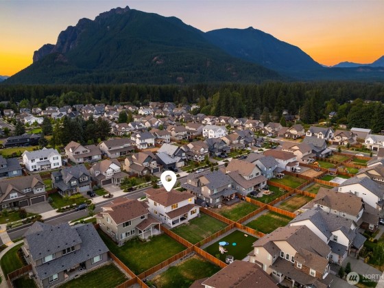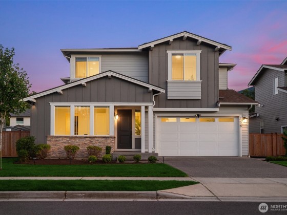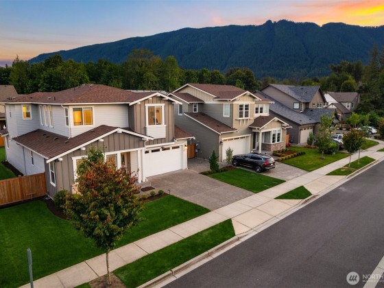 Better than new (2022 build) with premium upgrades, this North Bend home captures mountain views with a bright, open-concept layout. The custom gourmet kitchen features a large island and Belmont cabinetry, flowing into the great room. A main-level bedroom, den/office, and nearby ¾ bath provide ideal guest or flex space. Upstairs, 8-foot doors open to the primary suite with custom closets and a spa-inspired bath. Smart upgrades include motorized blinds, smart lighting, security system, and automated irrigation. Fully fenced backyard is perfect for outdoor living. Central A/C for year-round comfort. Minutes to parks, trails, downtown, and I-90 for quick access to Seattle, Bellevue, and Eastside tech hubs. Desirable Snoqualmie Valley Schools.