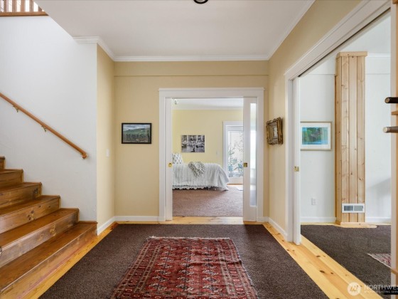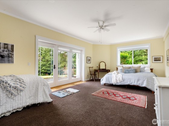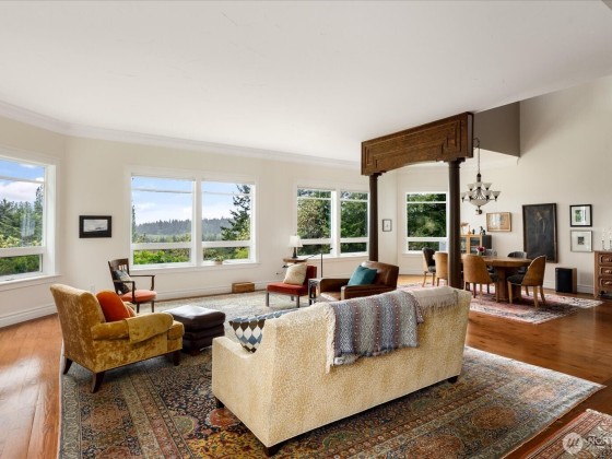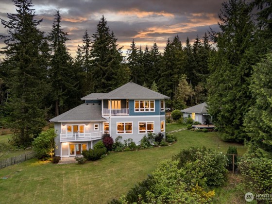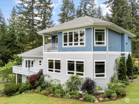 Your ideal Whidbey escape: Serene island living with easy access to Langley, Freeland, & Clinton ferry, plus stunning Olympic views! This solidly crafted custom home offers a flexible floor plan. Main level boasts a Great Room with 10' ceilings & architectural details, country kitchen, elegant dining, & luxurious Primary Suite, all essentials on one floor. Upstairs, find a family room, wet bar, 1/2 bath, and office/bonus room. On the lower level find a 2-bdrm suite with full bath, perfect for guests. Set on 3.6± open-woodland acres, enjoy pleasant strolls, deer-proof landscaping, a vegetable garden, & orchard. Detached 2-stall garage features a finished room for studio, office, gym, or storage. Embrace your country living dream!