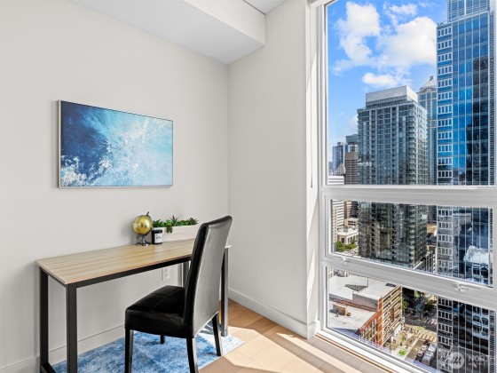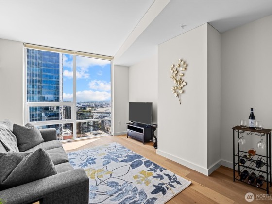 The Emerald is an exquisite luxury high-rise building, just one block from Pike Place Market and two from the newly transformed Seattle Waterfront. This thoughtfully designed residence features floor-to-ceiling windows with waterfront views, White Oak hardwoods, custom wood cabinets, Carrara marble counter tops, Bosch appliances, a spacious, spa-like bath, full-size washer/dryer, custom shades, and Latch keyless entry. The den/office offers potential as a non-conforming 2nd bedroom. Enjoy premier amenities: 24hr concierge, fitness center, yoga studio, pet run, guest suite, onsite electric carshare, and a stunning indoor/outdoor rooftop lounge with panoramic views of Elliott Bay, Mt. Rainier, and the Olympics that will leave you captivated!