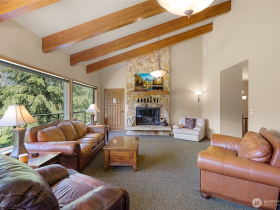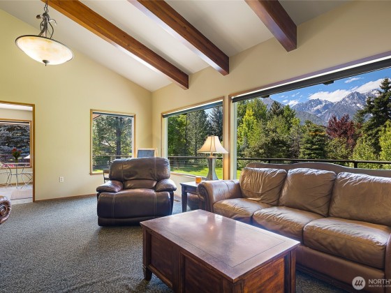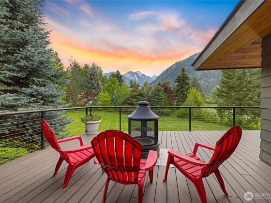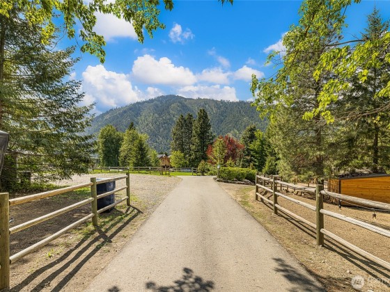 Appx. 300' of Icicle Riverfront sitting privately with the best fishing hole on 3.8 acres w/4488 sf 2 story view home. Fully fenced for horses/livestock, equine property, gated & irrigated with Tier I rental. Expansive living room ~ Rock wood burning fireplace, large bedrooms, side office, Large kitchen, island, & tons of storage with amazing views on main floor for one level living. Second living downstairs w/2 bedrooms, fireplace, kitchen, separate entrance, large office w/blue pine cabinets & desk. There are 3 cross fenced & gated pastures, a beautiful barn w/tack room, paddocks & stalls, hen house & RV parking. Large new deck w/cable fence, hot tub, privacy, sunny pastures, private beachfront. See list of Amenities.