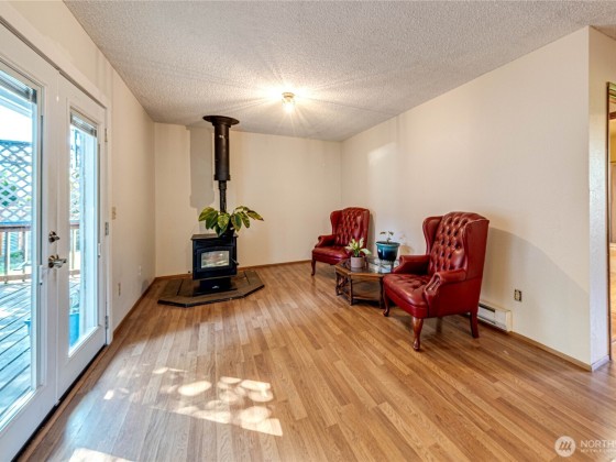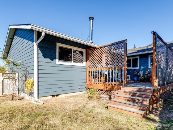 Charming single level home offering 3 bedrooms, 1 3/4 baths, and 1,530 sq. ft. of living space. Situated on a comer lot w/ a peek a boo water view from front yard, this home features new Hardi plank siding installed in 2022, an attached garage, a fully fenced backyard. Inside, enjoy both a spacious living room w/ a wood burning fireplace, a cozy family room w/a newer pellet stove installed in 2022, plus a kitchen w/ a convenient breakfast bar. The French doors from the family room open to a back deck, perfect for entertaining or relaxing outdoors. The thoughtful layout provides comfort and versatility. This home is close to the Olympic Discovery Trail and ready for its new owners!
