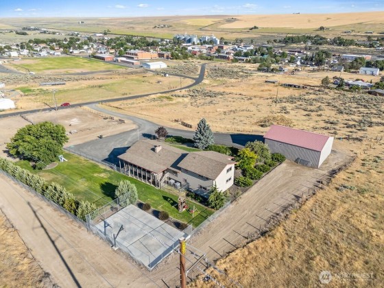 Private home on 22 acres within city limits. This 4,507 sq. ft. home offers 4 beds, 3.75 updated baths, a formal living room with built-ins, and a cozy back living room with a brick fireplace and wet bar. Upstairs, the primary suite boasts a walk-in closet and private bath. Ideal for a hobby farm with fenced pastures, barn, and garden space. The 40'x60' shop with separate 200 amp service is perfect for RVs, toys, or a business. Enjoy a fenced yard, private sport court, and peaceful views. Fiber internet coming Summer 2025. Lind middle school and elementary are in Lind, High school in Ritzville.