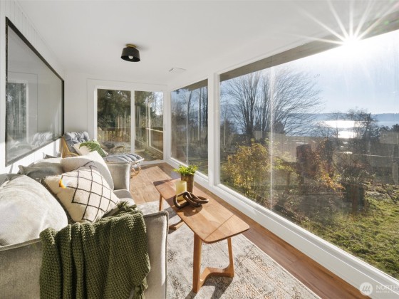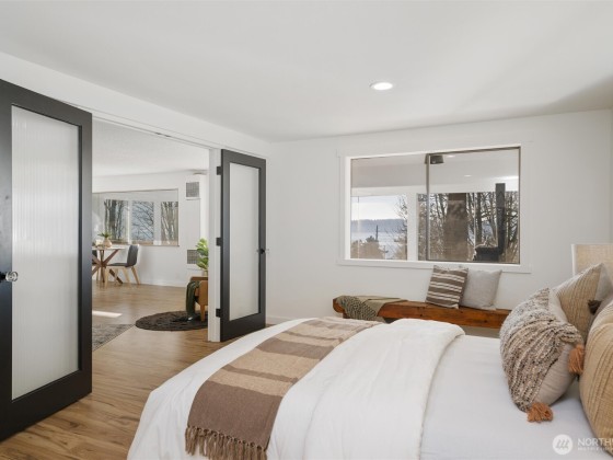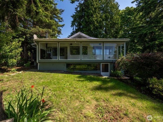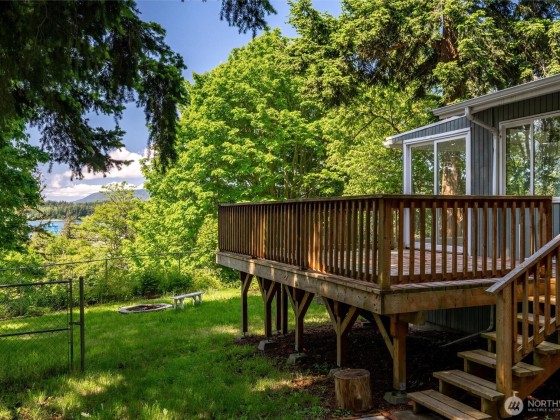 Welcome to Gooseberry Pt on deeded land that is NOT leased. Bring your kayak or SUP. Complete interior renovation with all new floors, paint, kitchen, bath, fixtures, and appliances! Enjoy the wide southwesterly water view from most of the main level, and soak in the sun from the sunroom with walls of windows. Views, space and more on this great double lot with extra parking, detached garage, two carports, and shop space. Even room for an RV! Flexible layout with a large primary bedroom guarded by French doors, so much to love in your next home! Potential for a separate living space with its own entrance. Don’t miss the chance for a like-new home with many possibilities - 20 min scenic drive to Bellingham!